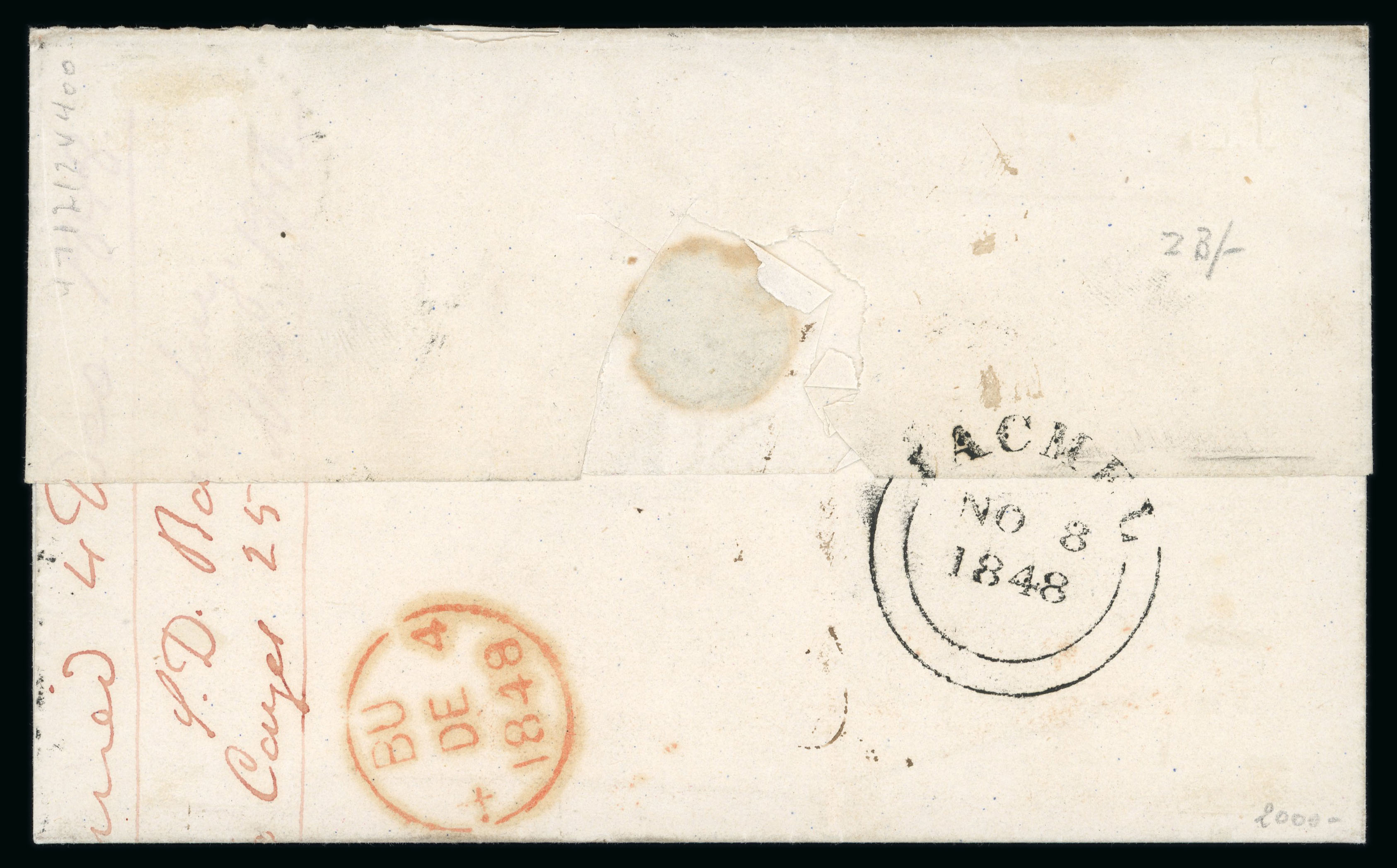 1848 thin outer letter sheet to Wesleyan Mission House, London bearing fine AUX-CAYES date stamp (OC 25), rated "1/5" on arrival, reverse with JACMEL transit (NO 8) and arrival cds (DE 4), light horizontal filing crease, an early usage.
