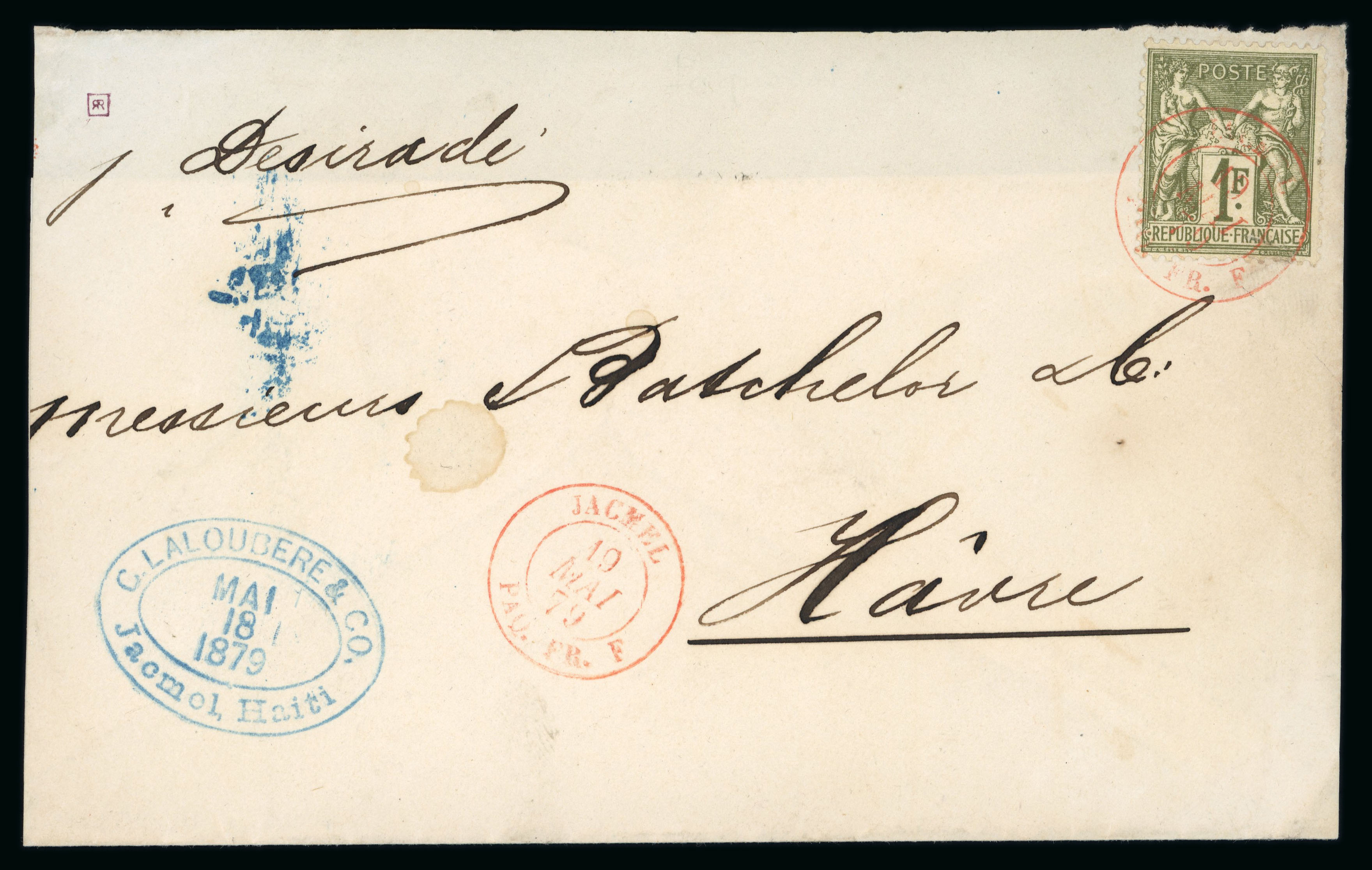 1875 (May 10) envelope to Le Havre with Sage 1F tied by red "JACMEL / PAQ. FR. F" double circle ds, with further strike adjacent, endorsed "p Desirade", reverse with arrival cds, envelope slightly reduced at left and portion of reverse