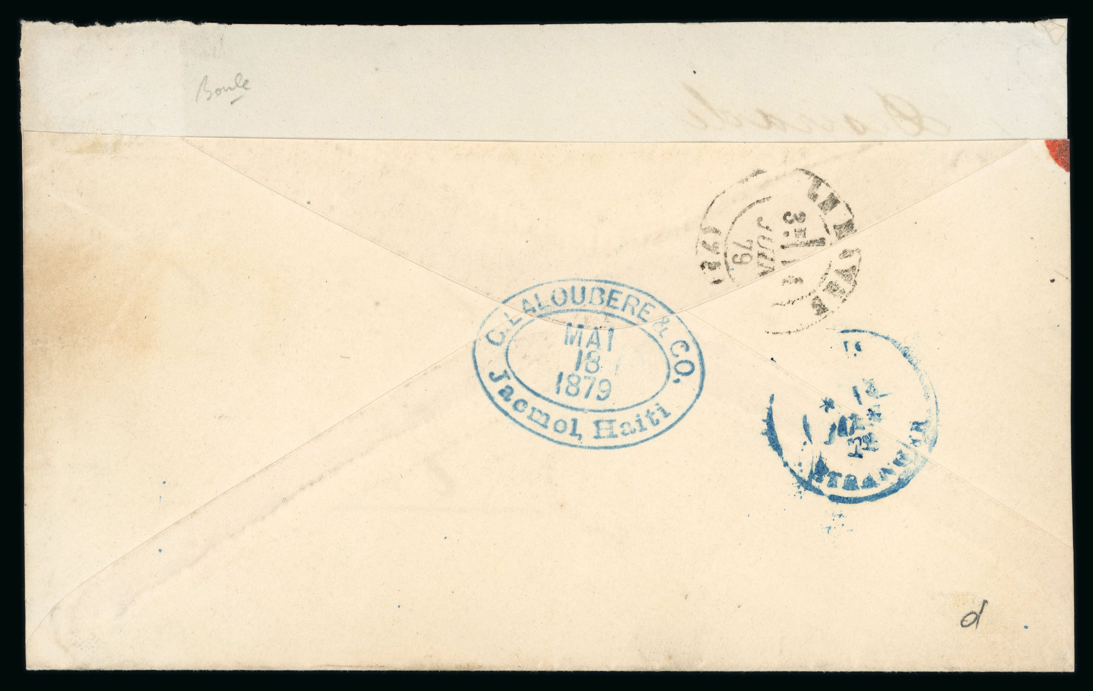 sometimes used together in 1868-69. Charged 30 centimes on arrival, reverse with British Office Jacmel cds, St Thomas transit (AU 30) and blue arrival cds of 3 Sept. Fine and rare. (Image 1)