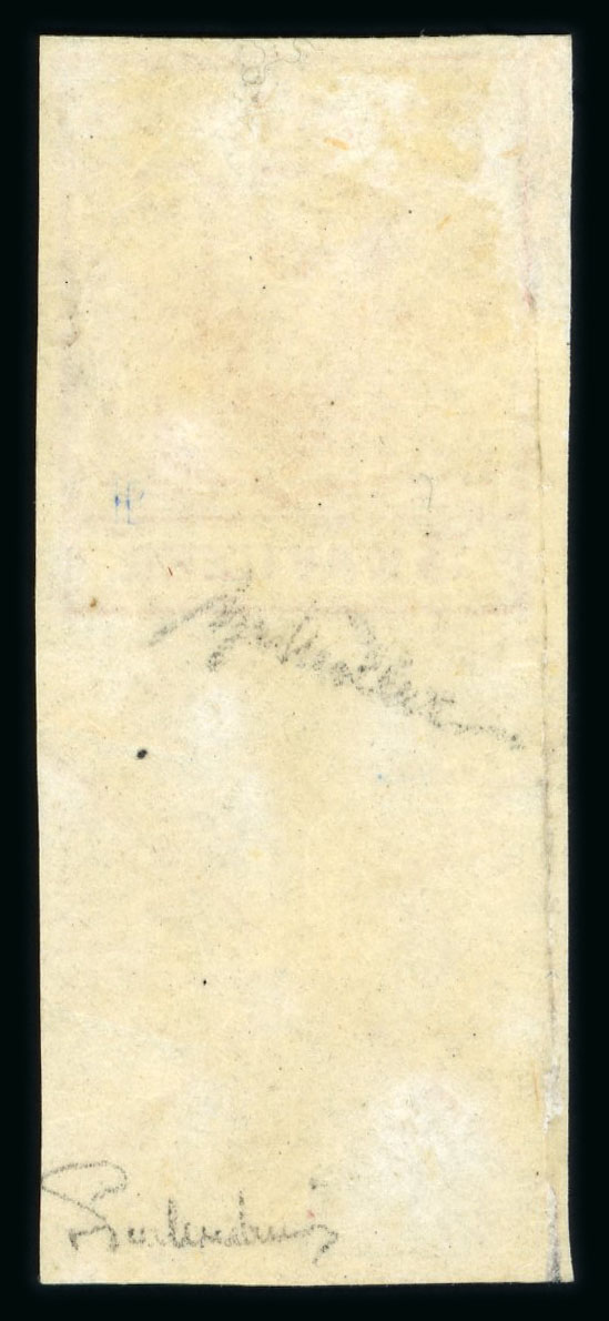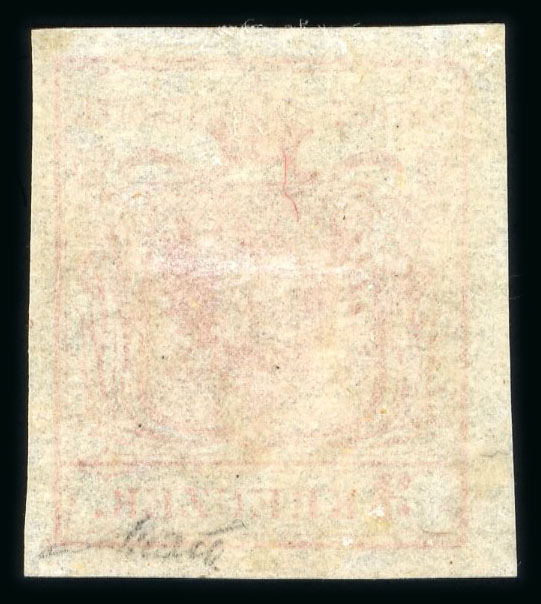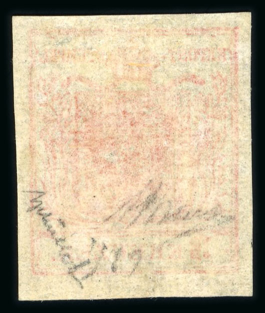 1850, 3Kr karminrosa HP Ty Ia mit grossen Wasserzeichenteil, unten mit Teil der Nebenmarke, ungebraucht (Originalgummi, etwas verstrichen), leichte Papierwellen, allseits breitrandiges Stück, besonders farbfrisch, Attest Matl, ANK 3H Ty