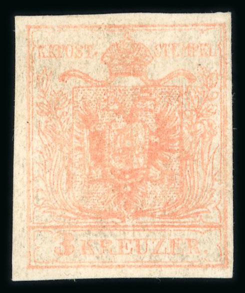 1850, 3Kr blassrosa, MP Ty III, ungebraucht (Originalgummi), engvollrandiges Stück, ANK 3MP Ty III, €800. (Image 1)