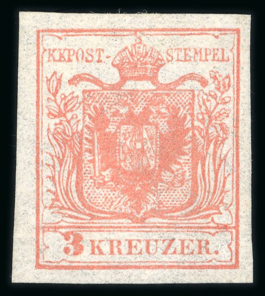 1850, 3kr karminrosa MP Ty IIIb ungebraucht (voller Originalgummi mit typischen - etwas nach vorne durchschlagenden - Gummisprüngen), allseits voll-breitrandiges sehr schönes Stück, signiert und Attest Matl, ANK MP Ty IIIb €800 (Image 1)