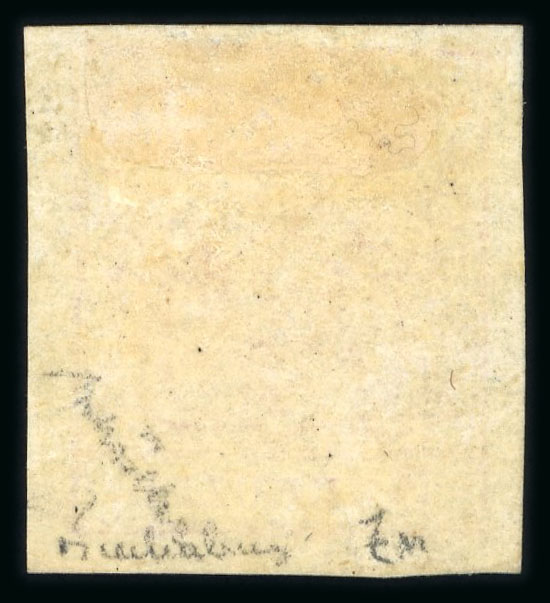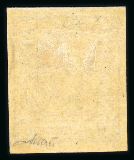 1850, 3Kr Handpapier Type Ib mit vollständigem Andreaskreuz unten, das Stück ist allseits voll- breitrandigst, links verläuft die Randlinie entlang ein Vorfaltbug, der jedoch vorderseitig kaum wahrnehmbar ist, sehr farbfrisch und mit