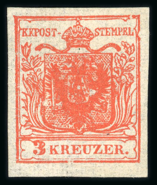 1850, 3Kr rot HP Ty IIIa, ungebraucht (Originalgummi, Wasserzeichenteil), voll-breitrandiges Prachtstück, sign. Ing. Müller, Befund Ferchenbauer, ANK €1100 (Image 1)