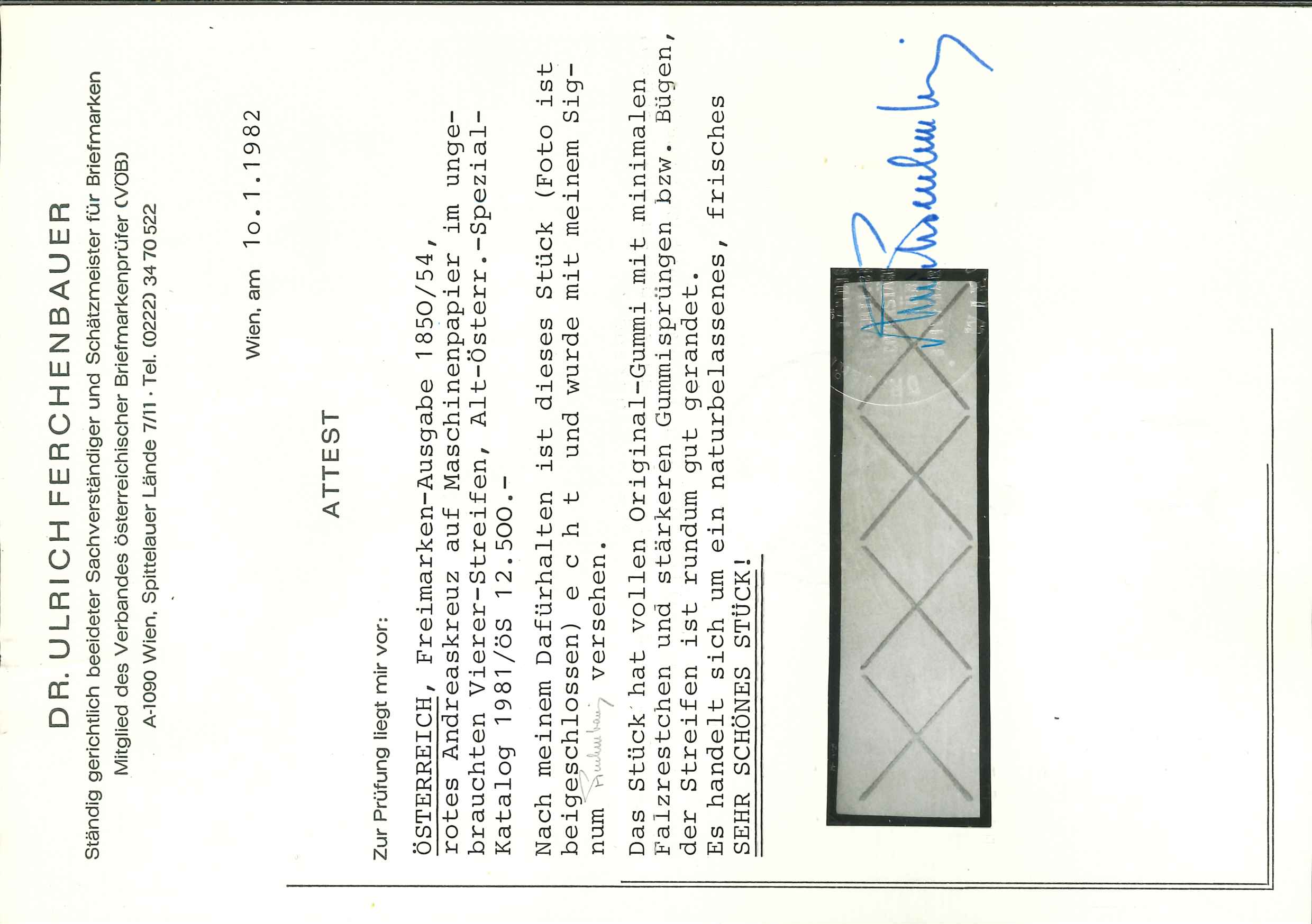 1850, Andreaskreuz in waagerechtem Viererstreifen der 3Kr rot Maschinpapier, ungebraucht mit typisch stärker craquelliertem Gummi (Gummisprünge), sign. und Attest Ferchenbauer, Ferchenbauer €1750. (Image 1)