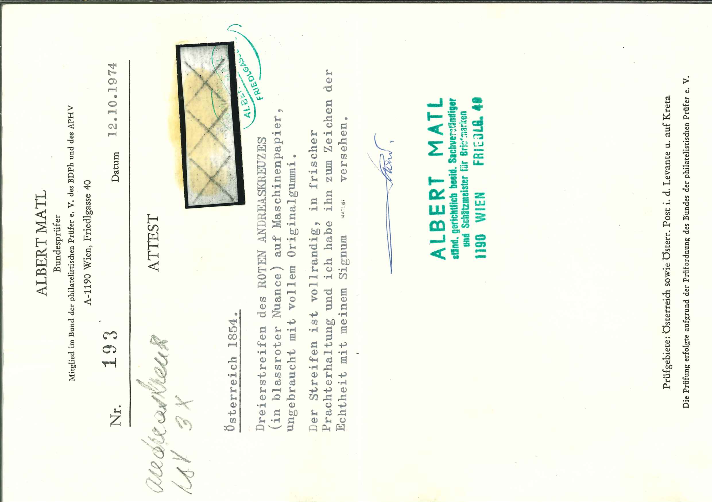 1850, Andreaskreuz in waagerechtem Dreierstreifen der 3Kr blassrot Maschinpapier, postfr. / ungebraucht (wie fast immer) mit typisch stärker craquelliertem Gummi, sign. und Attest Matl, Ferchenbauer ca. €900. (Image 1)