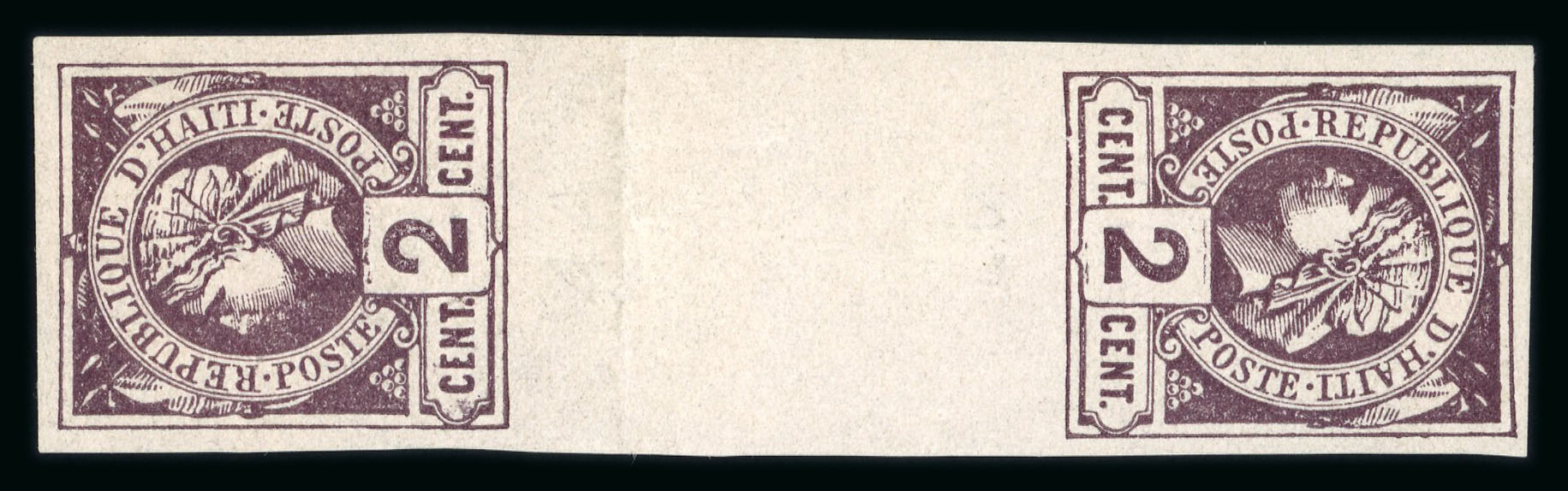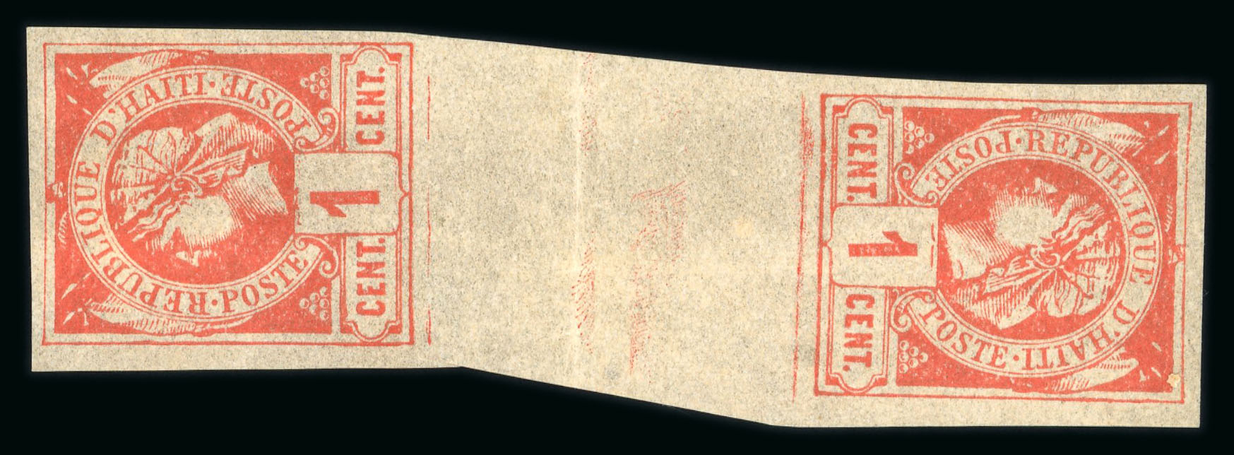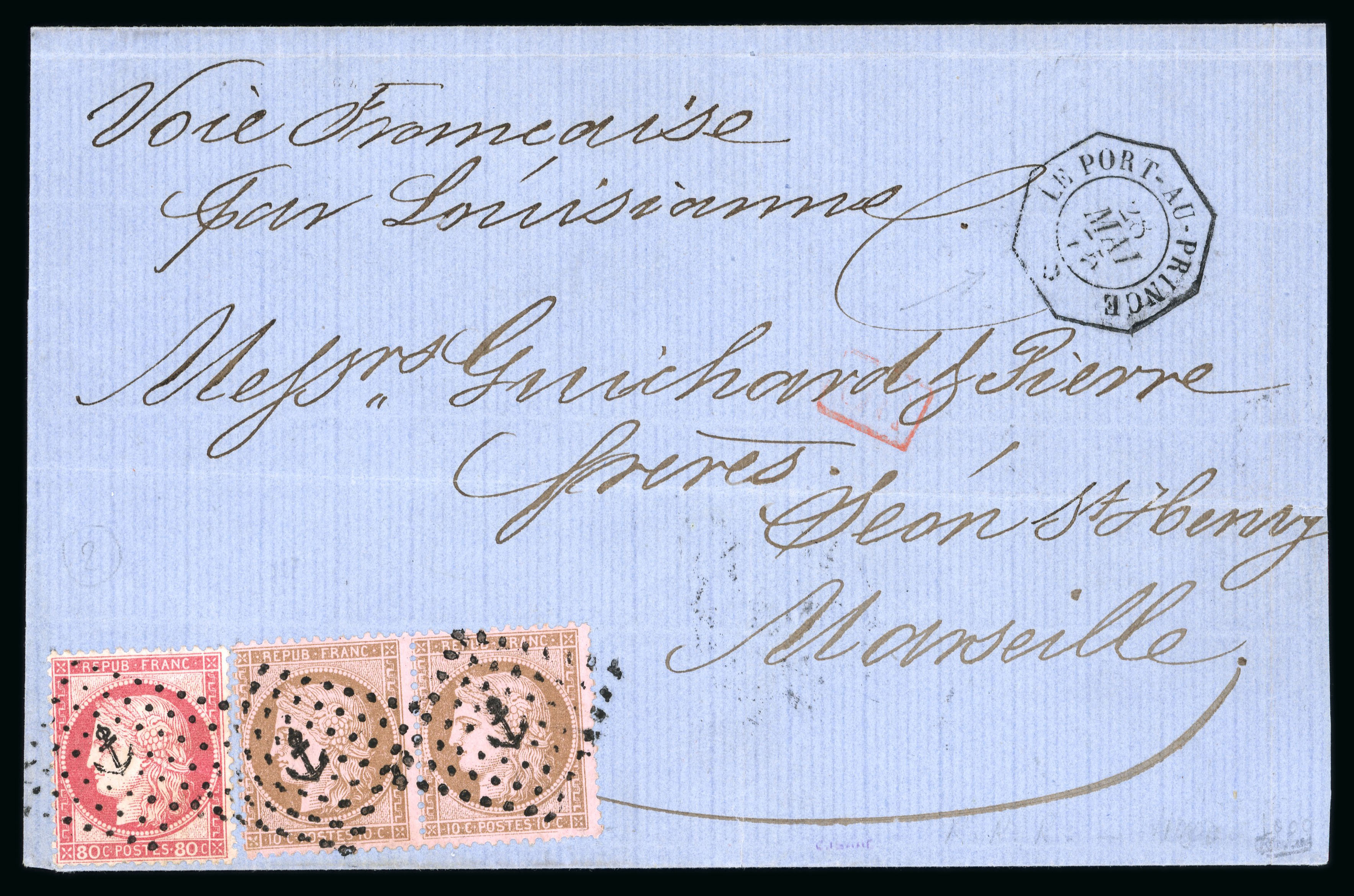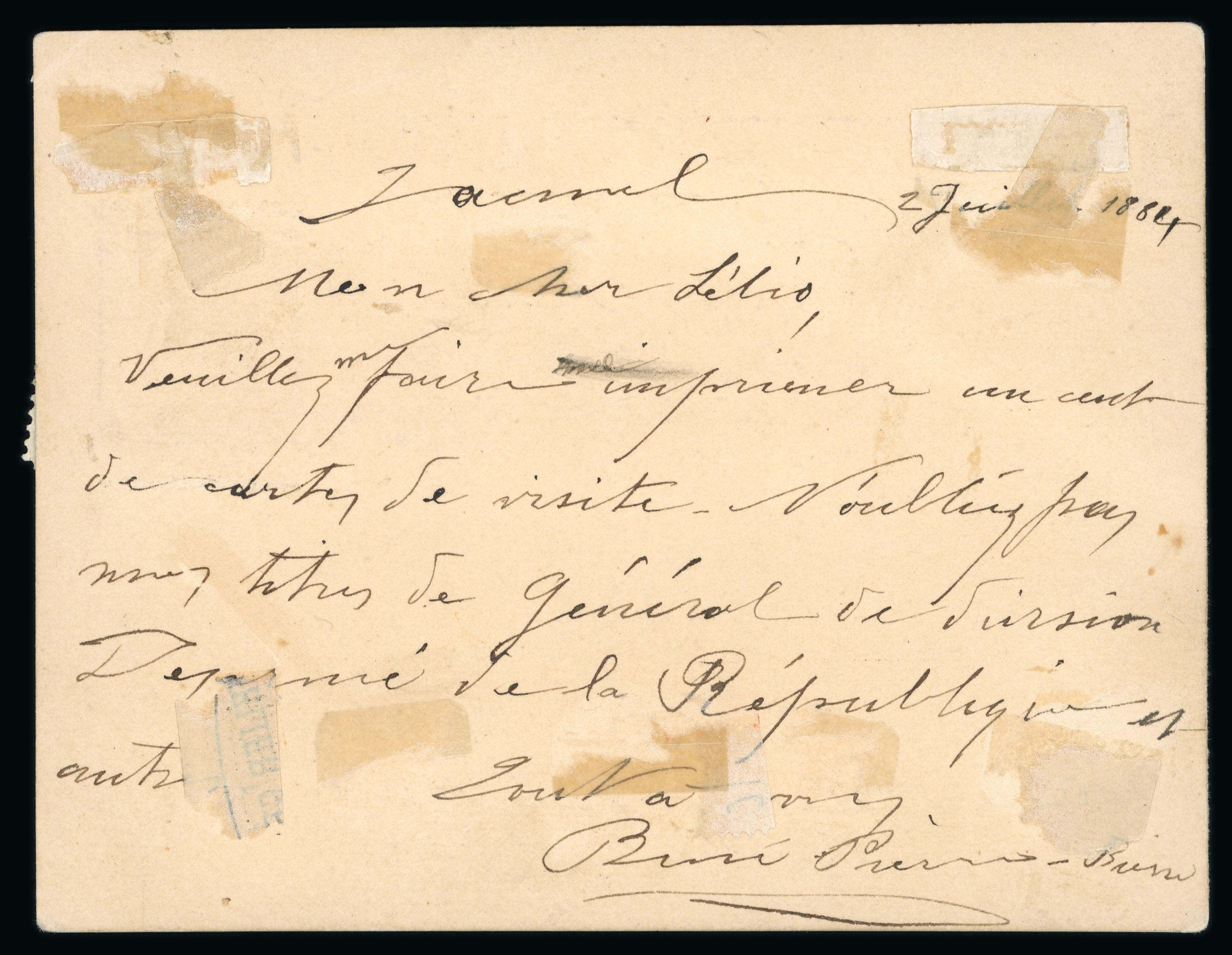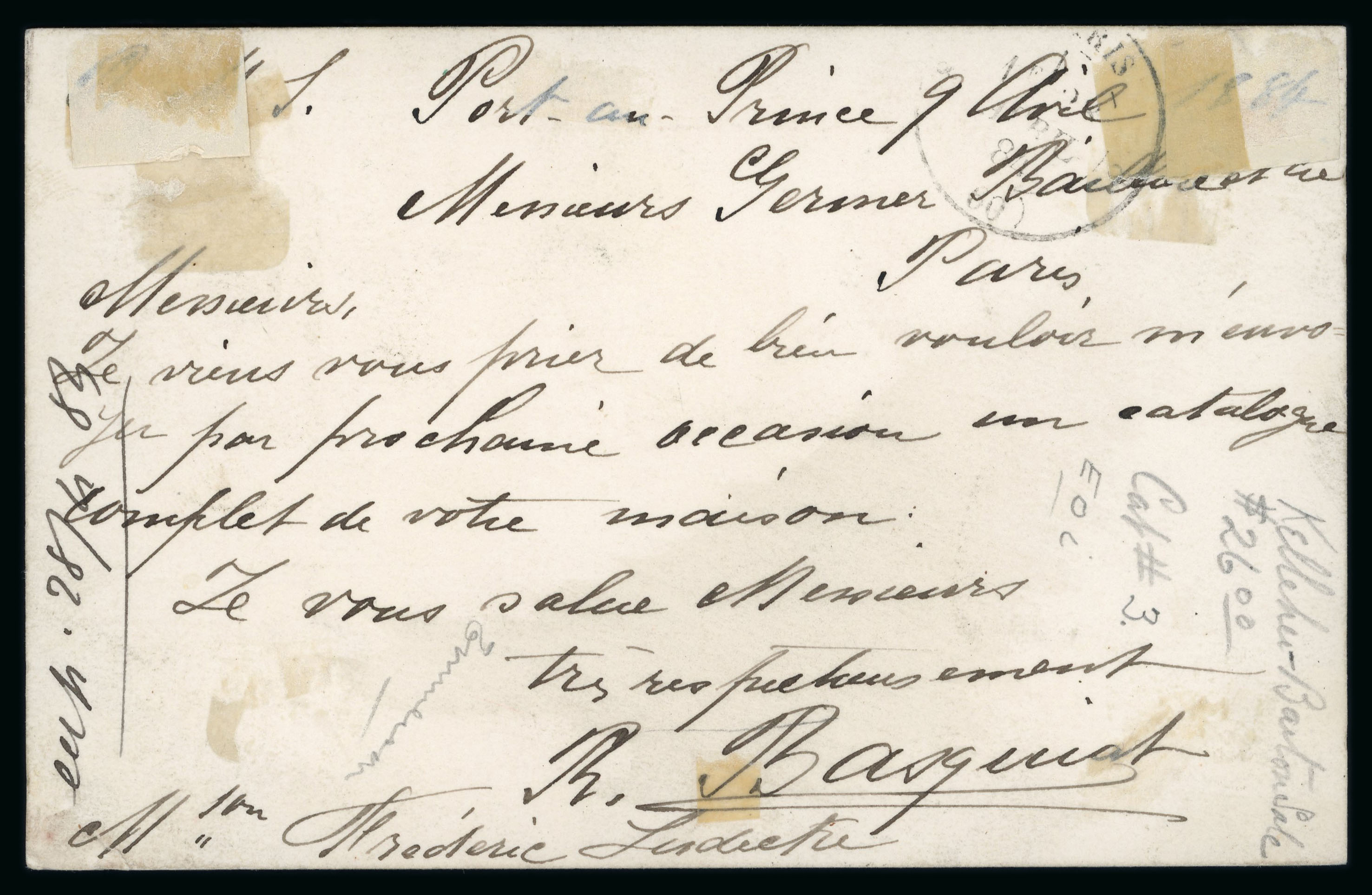 1883 (7 April) formula postal stationery card to Paris franked imperf 3c olive-bistre tied by Port Au Prince cds, repeated at left, arrival backstamp, heavily hinged on reverse, fresh condition. (Image 1)