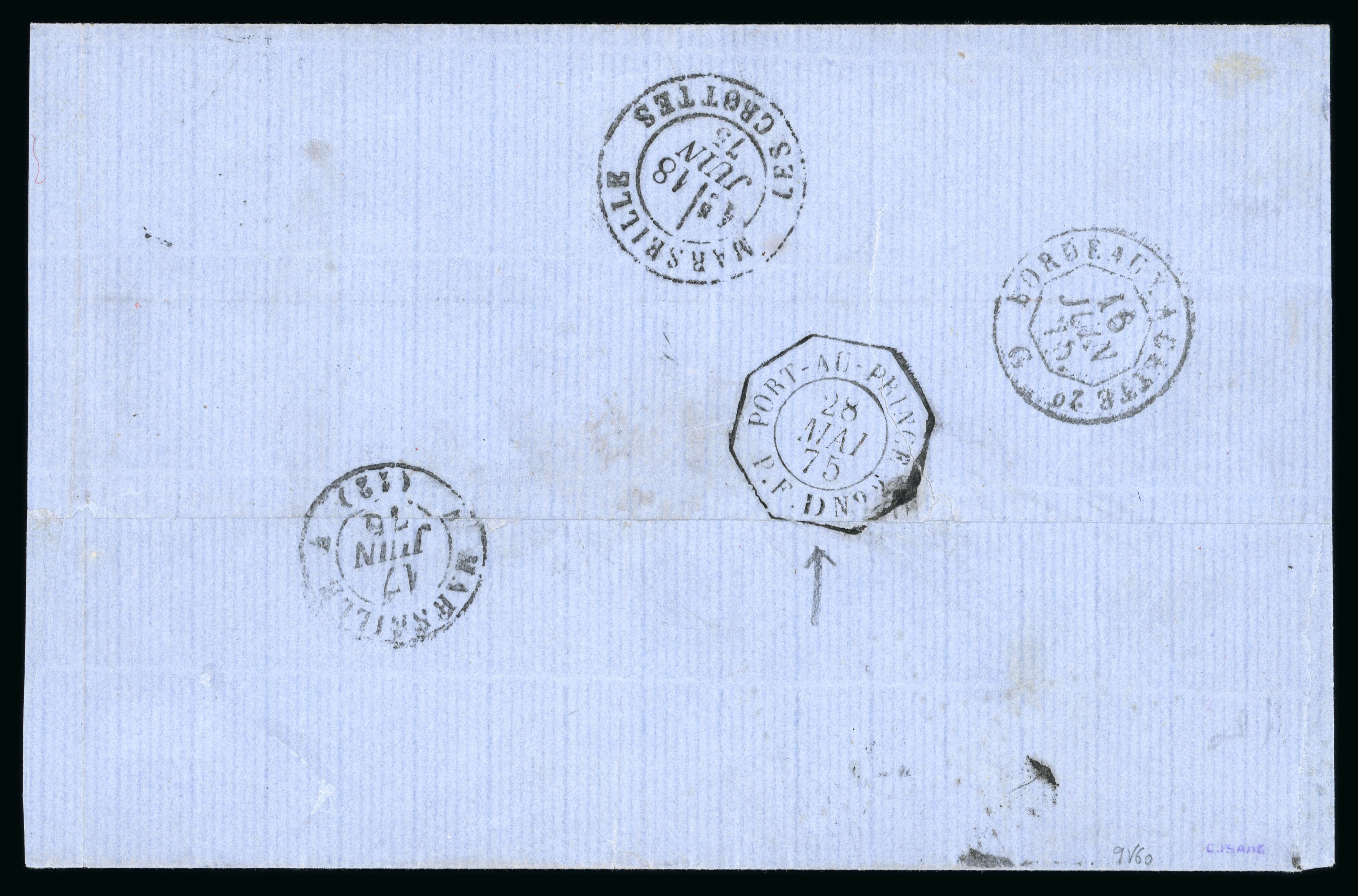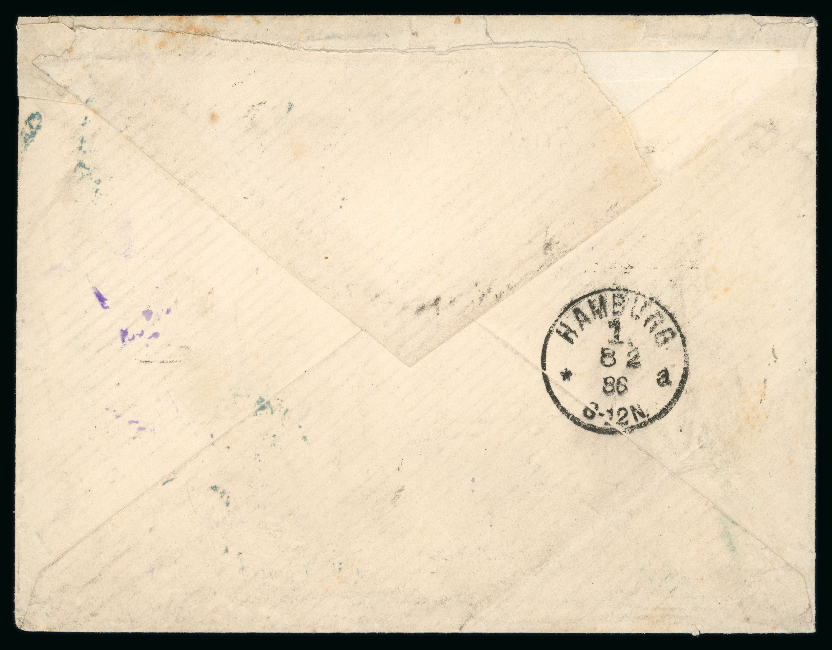 1886 commercial cover to Hamburg franked second issue 5c and 20c pairs, the latter a top marginal vertical pair tied by two blue Cap Haitien cds, arrival backstamp, some slight toning at top of 20c stamps, a scarce 50c franking. (Image 1)