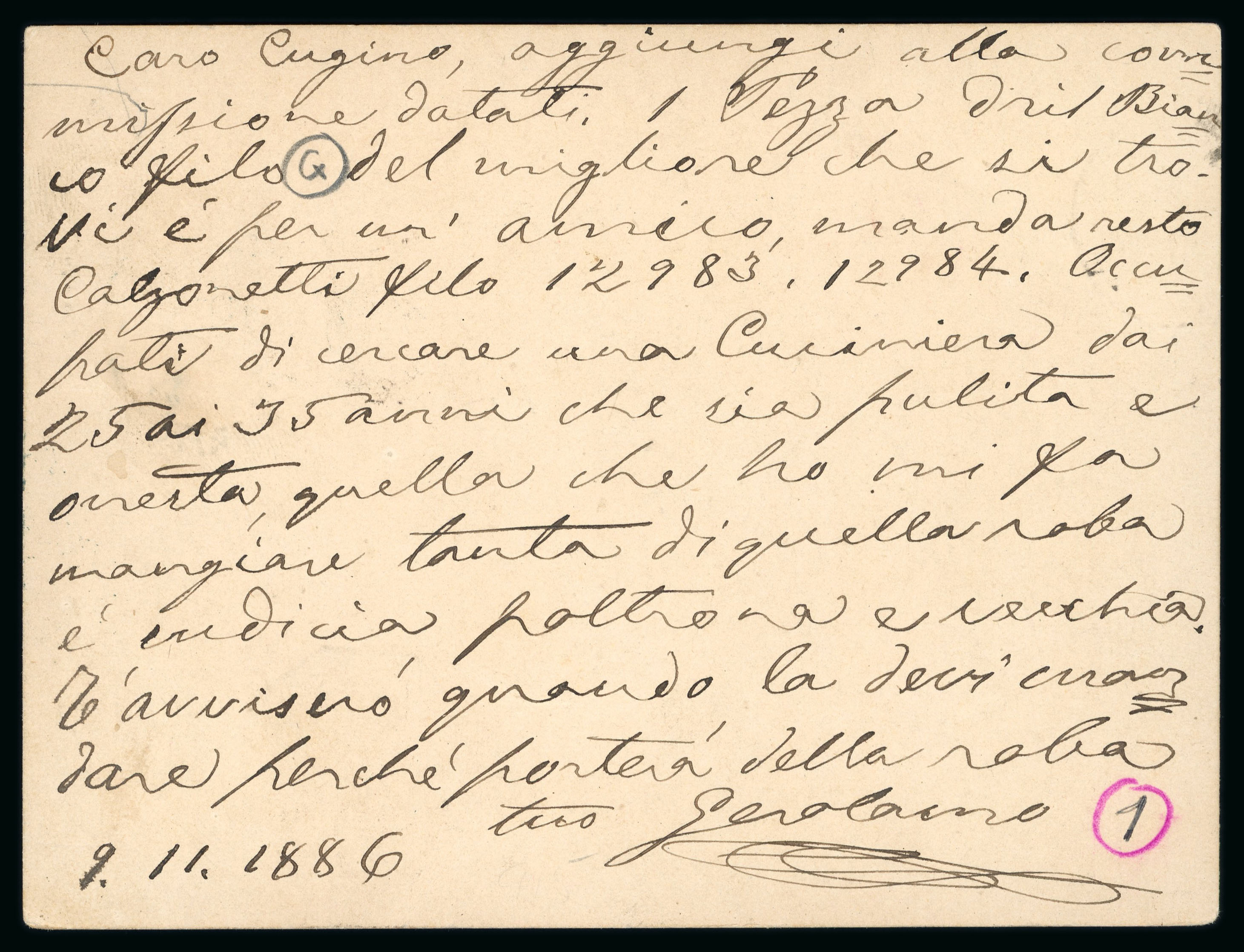 1884 formula stationery card to Port au Prince franked two perforated 1c. tied Jacmel cds, one stamp marginal with perfs just over edge but intact, a very rare usage bearing two 1c stamps, some hinge remains to back of card. Ex Sabattini.