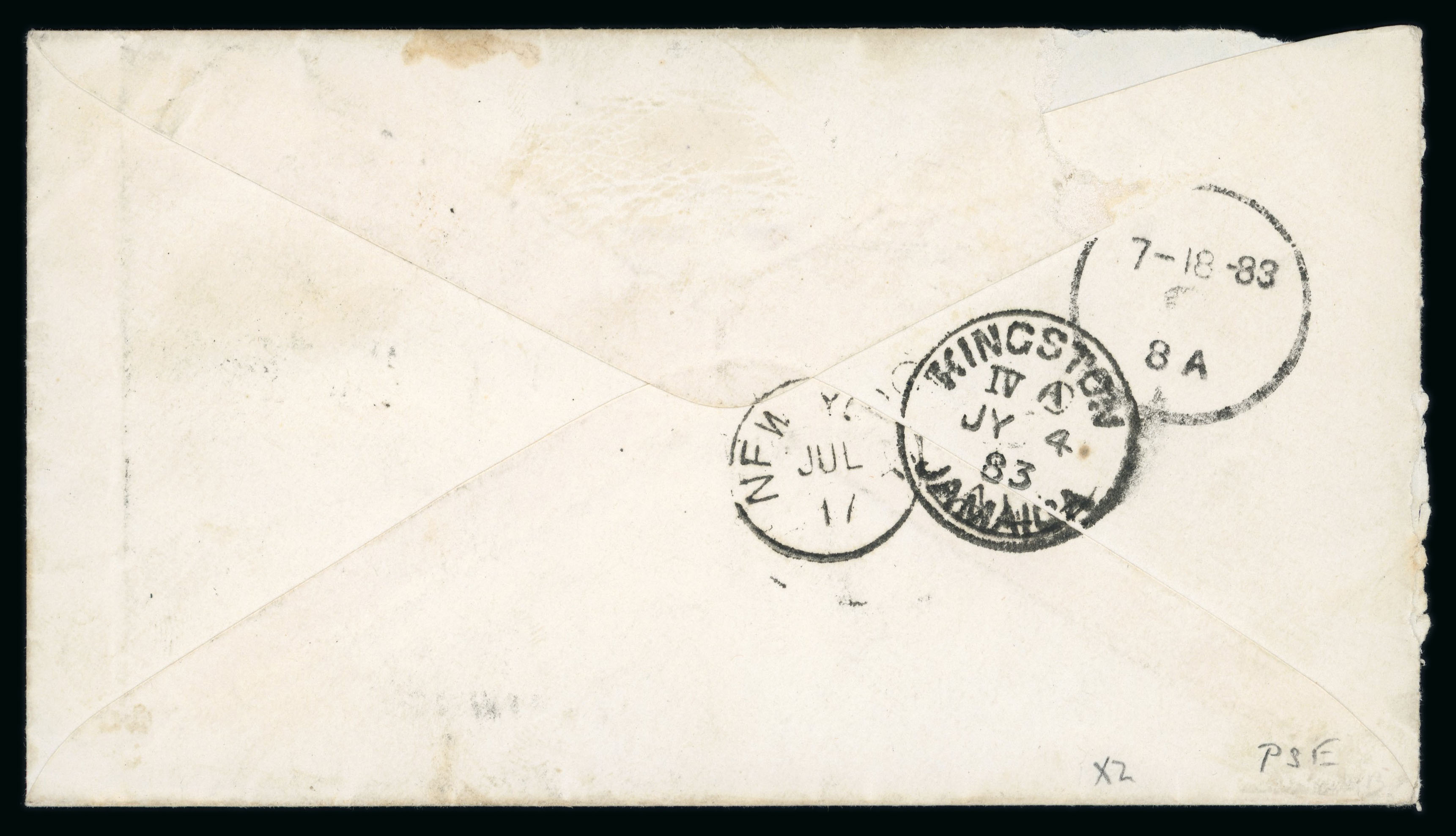 1883 (30 Jun) envelope to Boston franked 5c pair tied Port Au Prince cds, below this strong strike of two-line JAMAICA/ TRANSIT, reverse with Kingston cds in association (JY 4), New York transit (Jul 17) and arrival of following day. (Image 1)