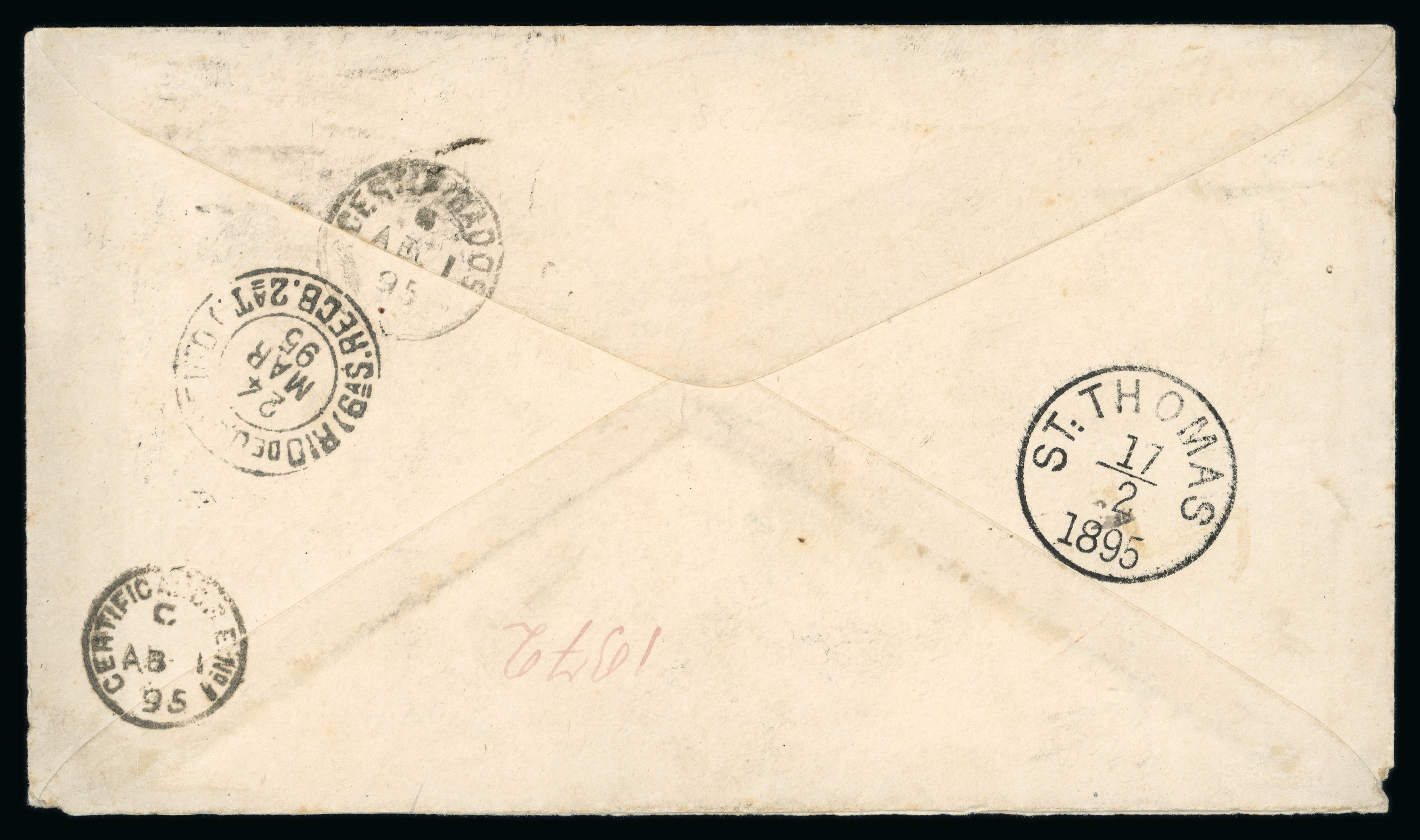 registration handstamp, reverse with St Thomas transit (17/2), Rio De Janeiro transit (24 Mar) and arrival cds (AP 1), small bottom corner faults to envelope. (Image