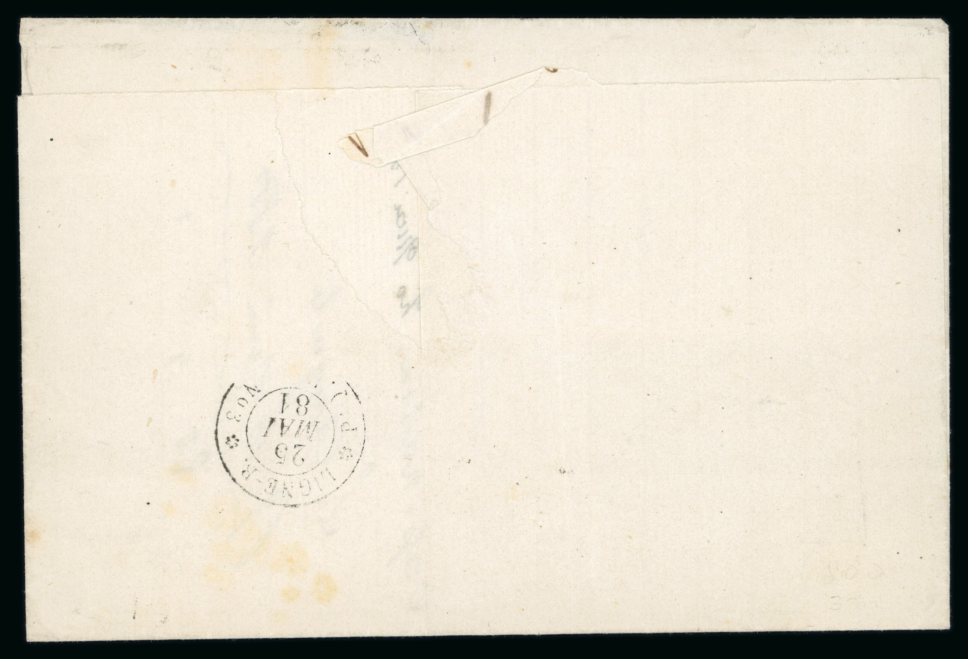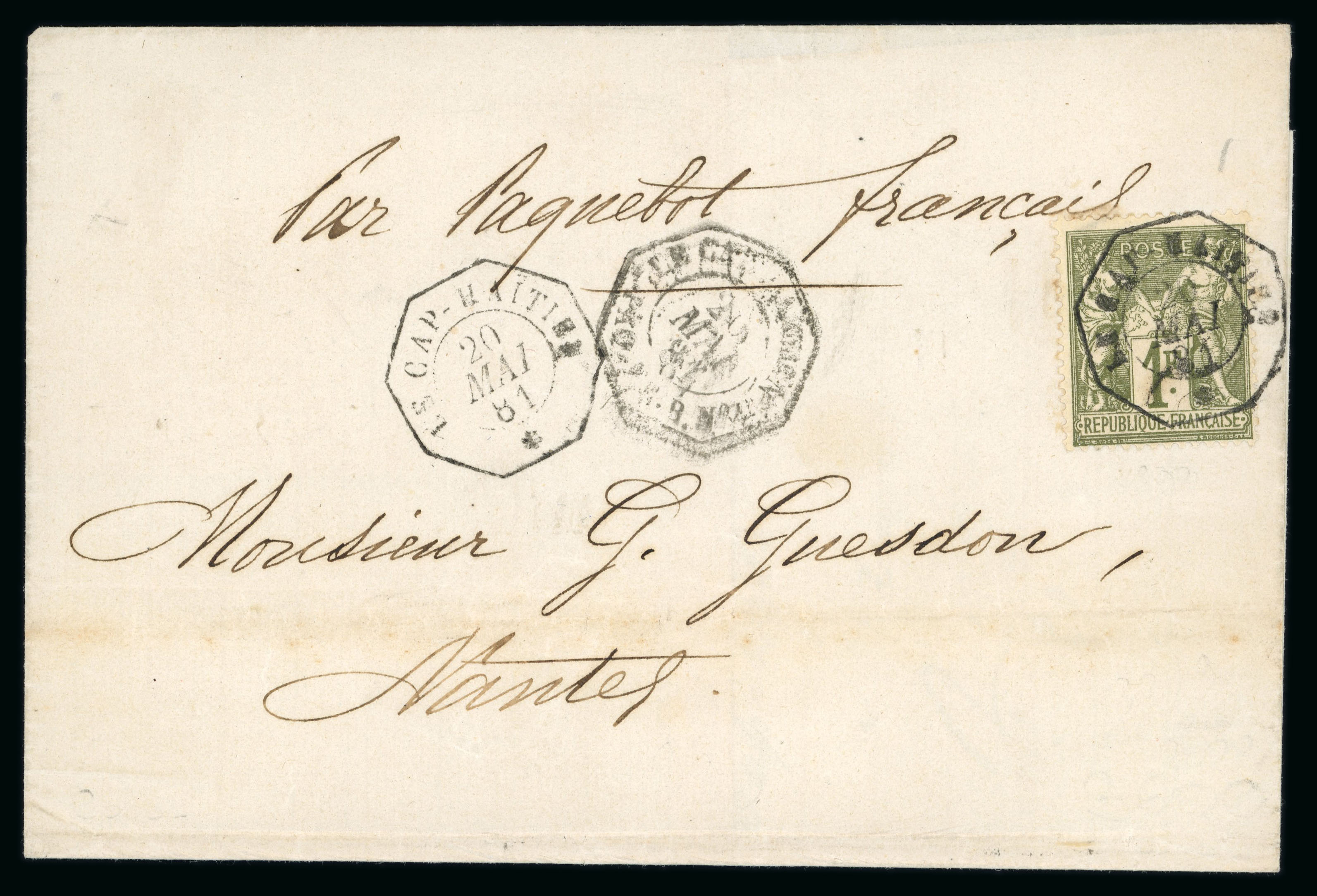 1881 (27 Aug) envelope to Kingston, Jamaica franked imperf 5c., close to huge margins, cancelled Port au Prince cds, repeated at left, endorsed "Per Atlas Steamer", arrival backstamp of AU 29, company chops front and back, small part of