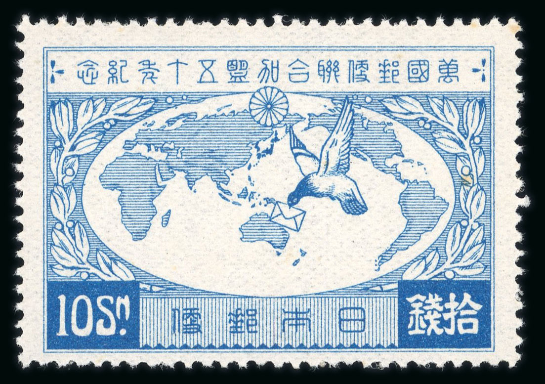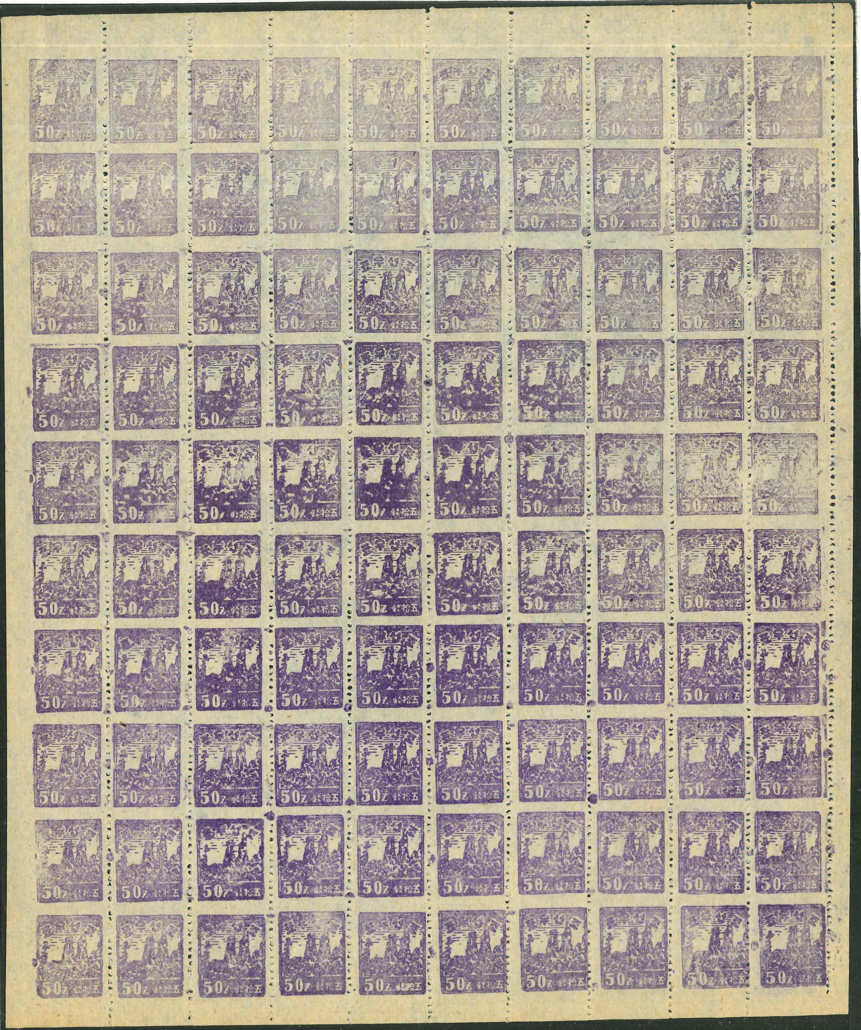 1946-55 50ch violet imperf. complete sheet of 100, plenty of varieties, broken plates, colour shades, etc., no gum as issued, ex Dr. Maeda (Mi. €4'000+ for regular singles). (Image 1)