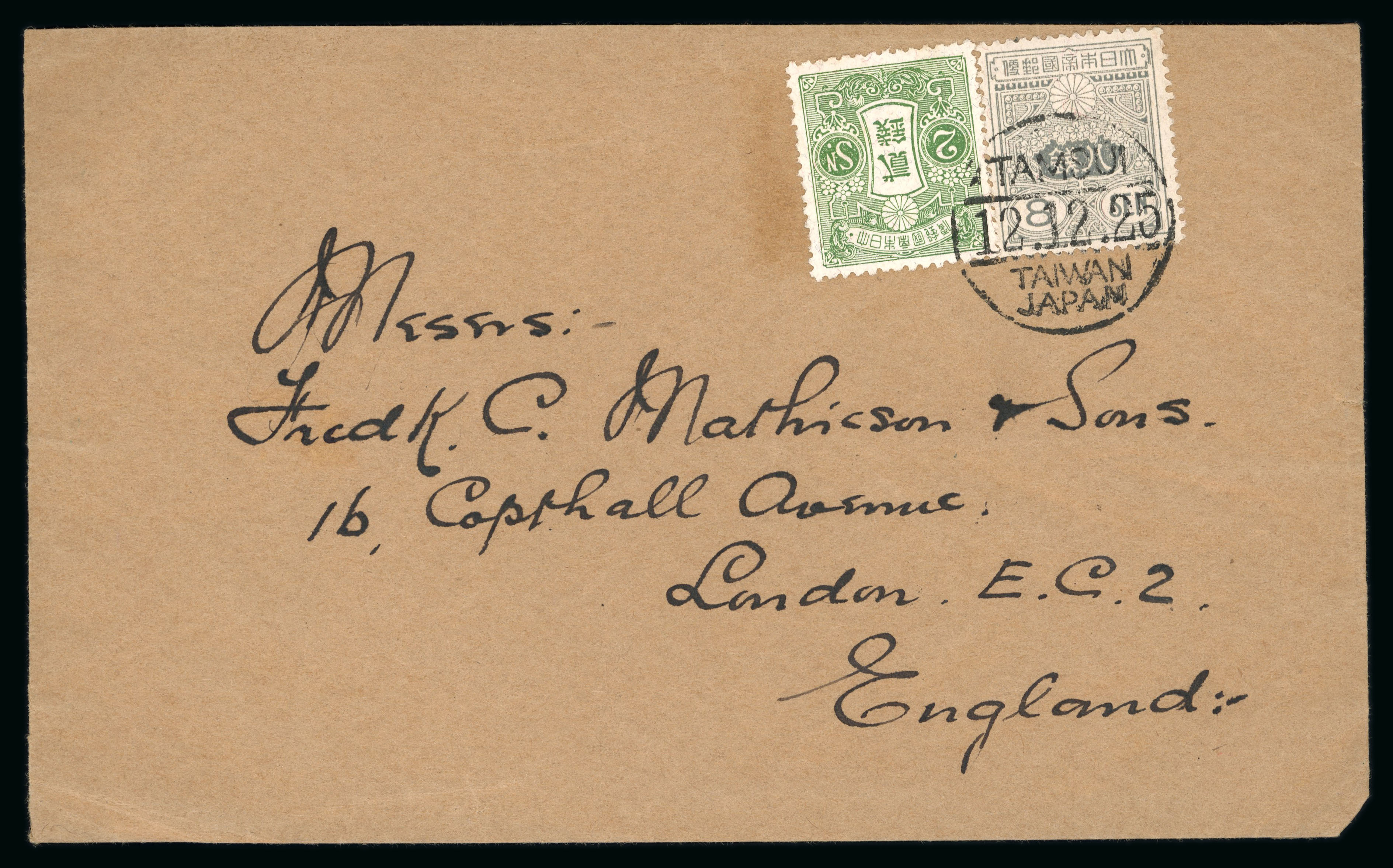 1910s, two envelopes to London, one franked 2s and 8s tied single Japanese Tamsui date stamp, the other a single franking 10s with similar cancel, both good clean legible examples, the 8s uncommon on cover from here. (Image 1)