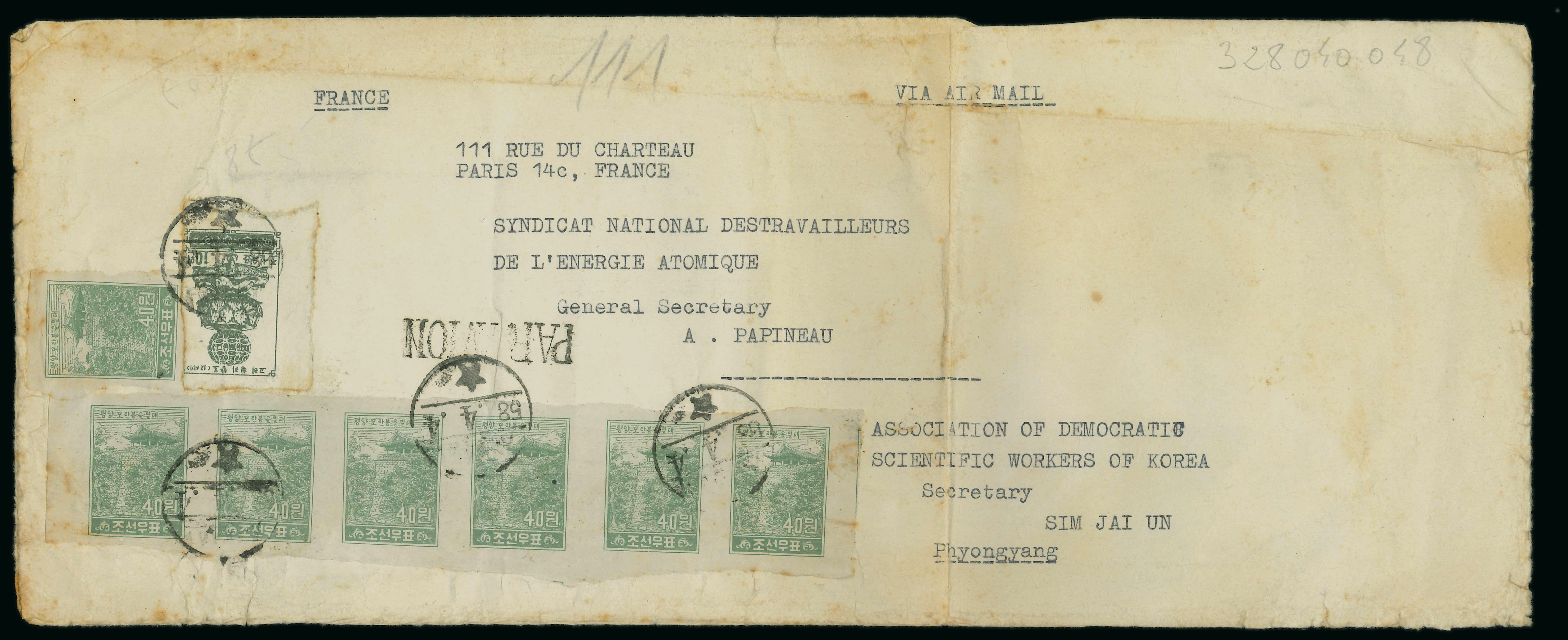 1958 North Korea, strip of six and single of 40W grey green (Mi. 118B) and 10W grey green (Mi. 135B) on airmail cover sent on 4/4/1958 from Pyongyang to Paris, France. The large cover has some creases and aging, but an uncommon item