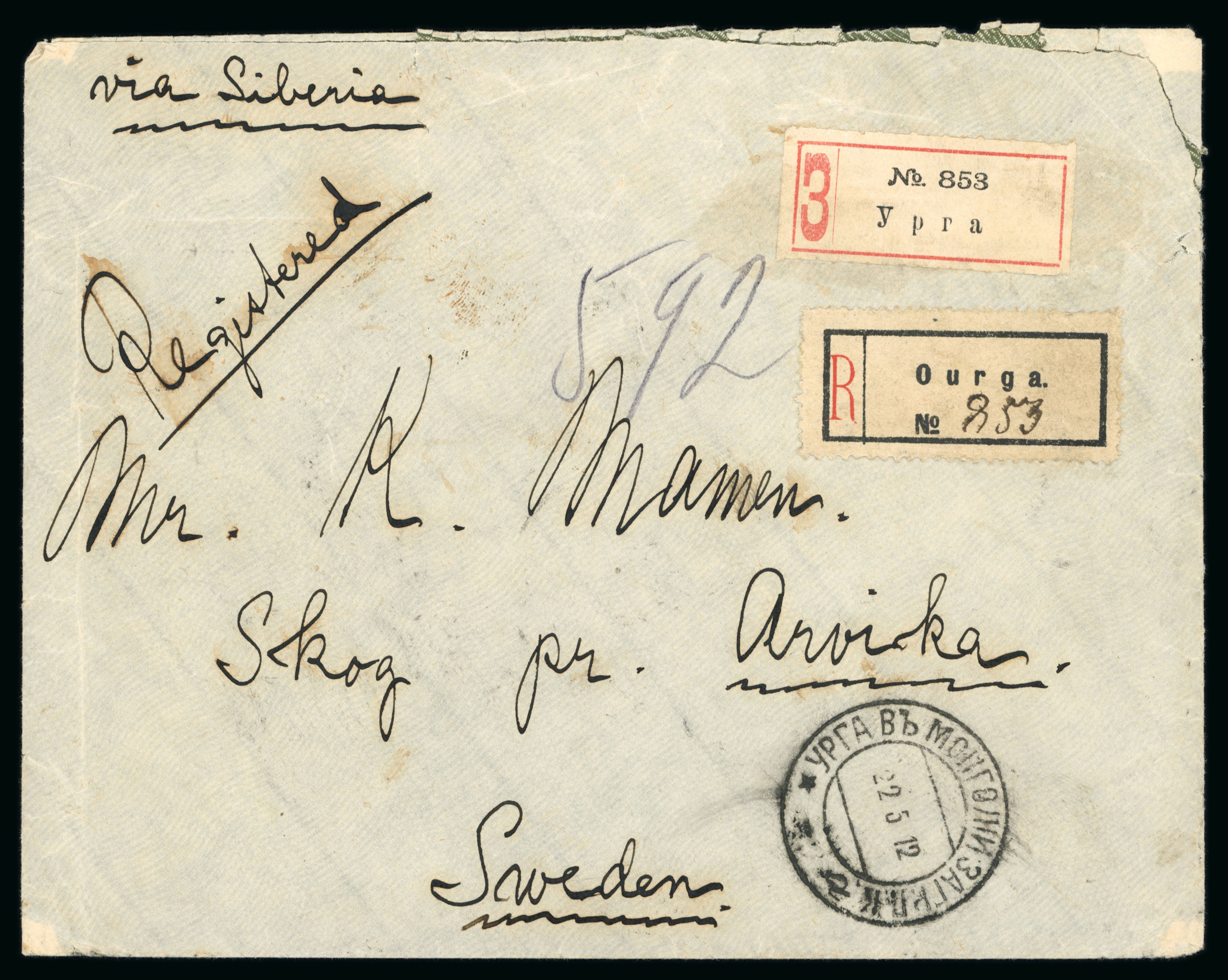 1912 (May 25) envelope sent registered from Urga to Sweden franked on the reverse with four Arms 10k tied by Urga double circle ds (Hellrigl type 6), with St Petersburg transit and Stockholm arrival adjacent, obverse with Cyrillic and