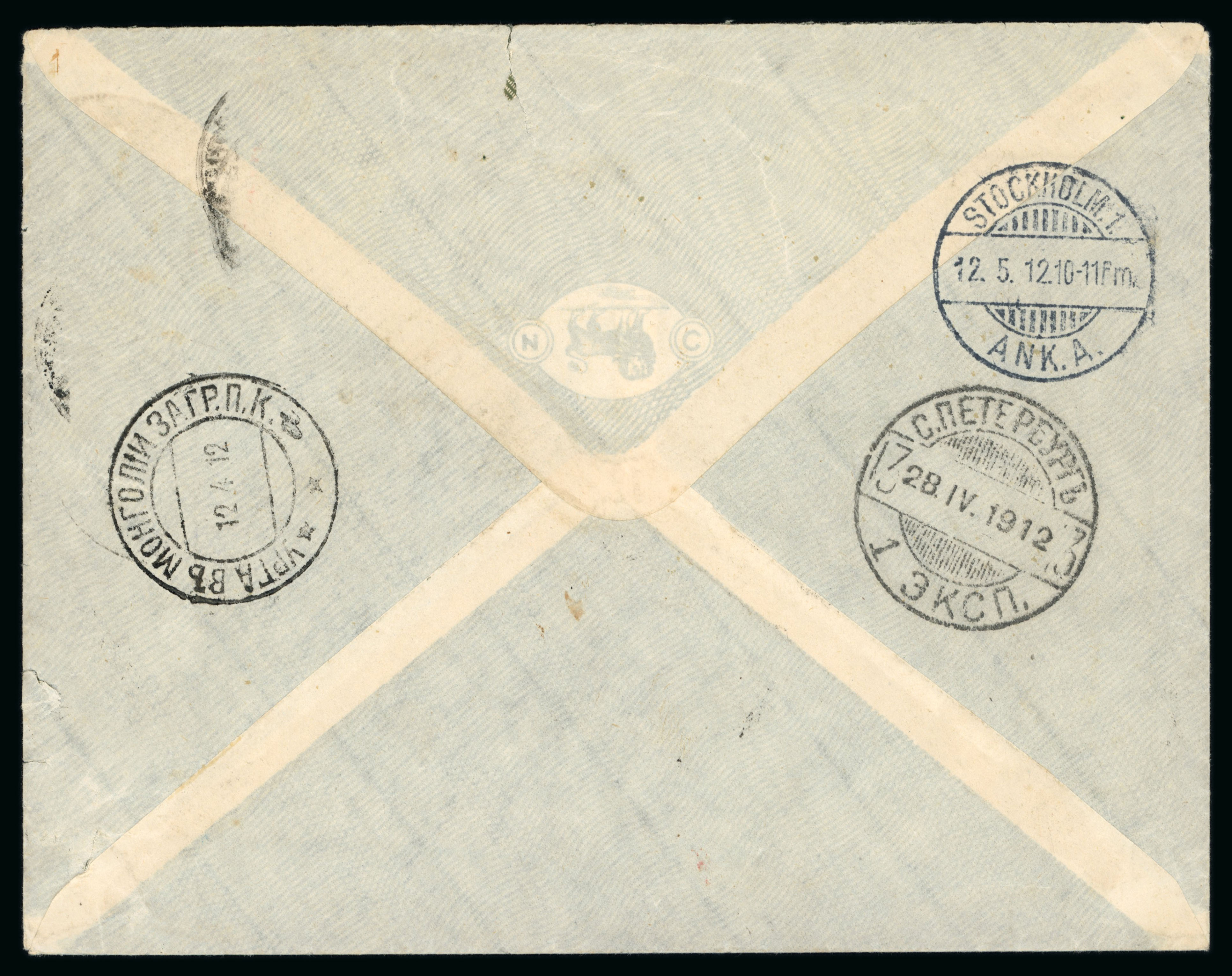 by red Imperial wax seal of Petrograd, Stockholm arrival adjacent, some envelope warping, a very scarce usage of the Romanov issue in Mongolia. (Image 1)