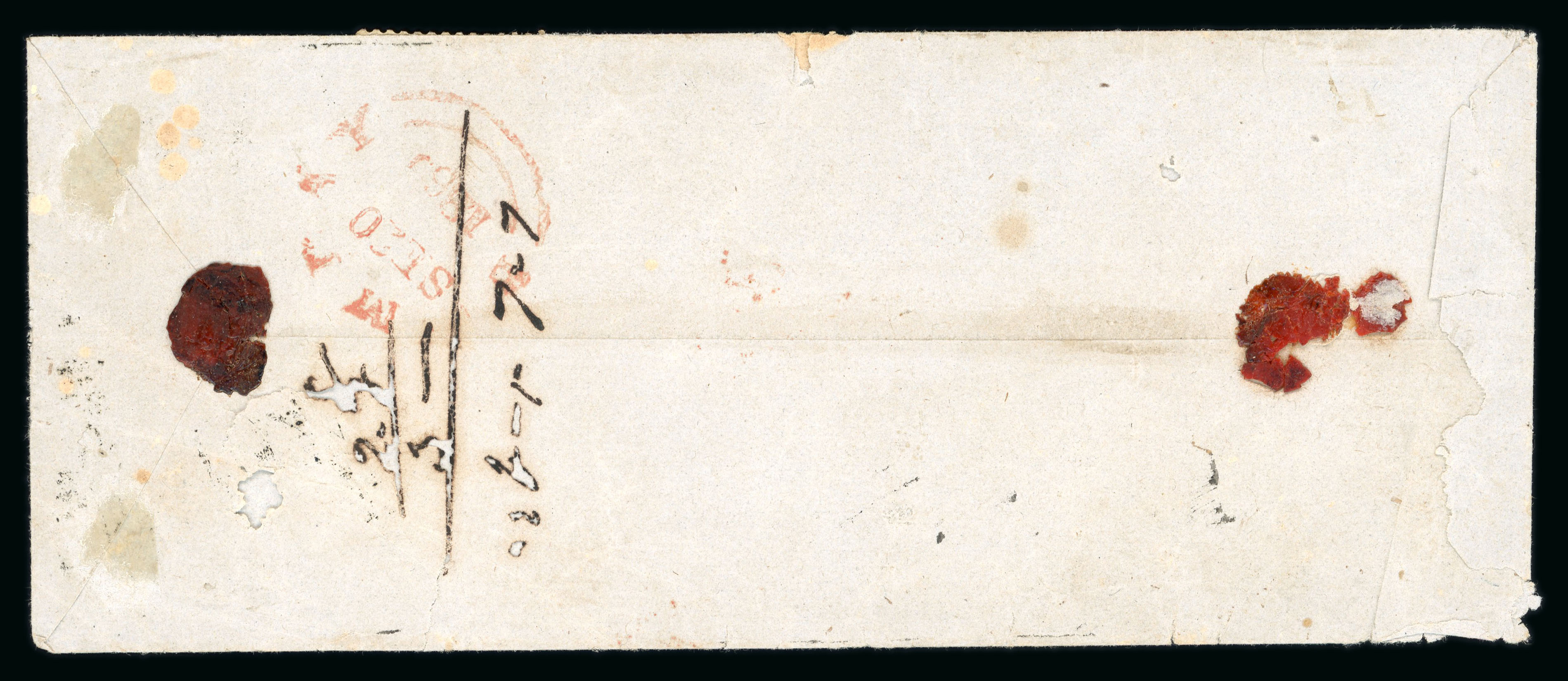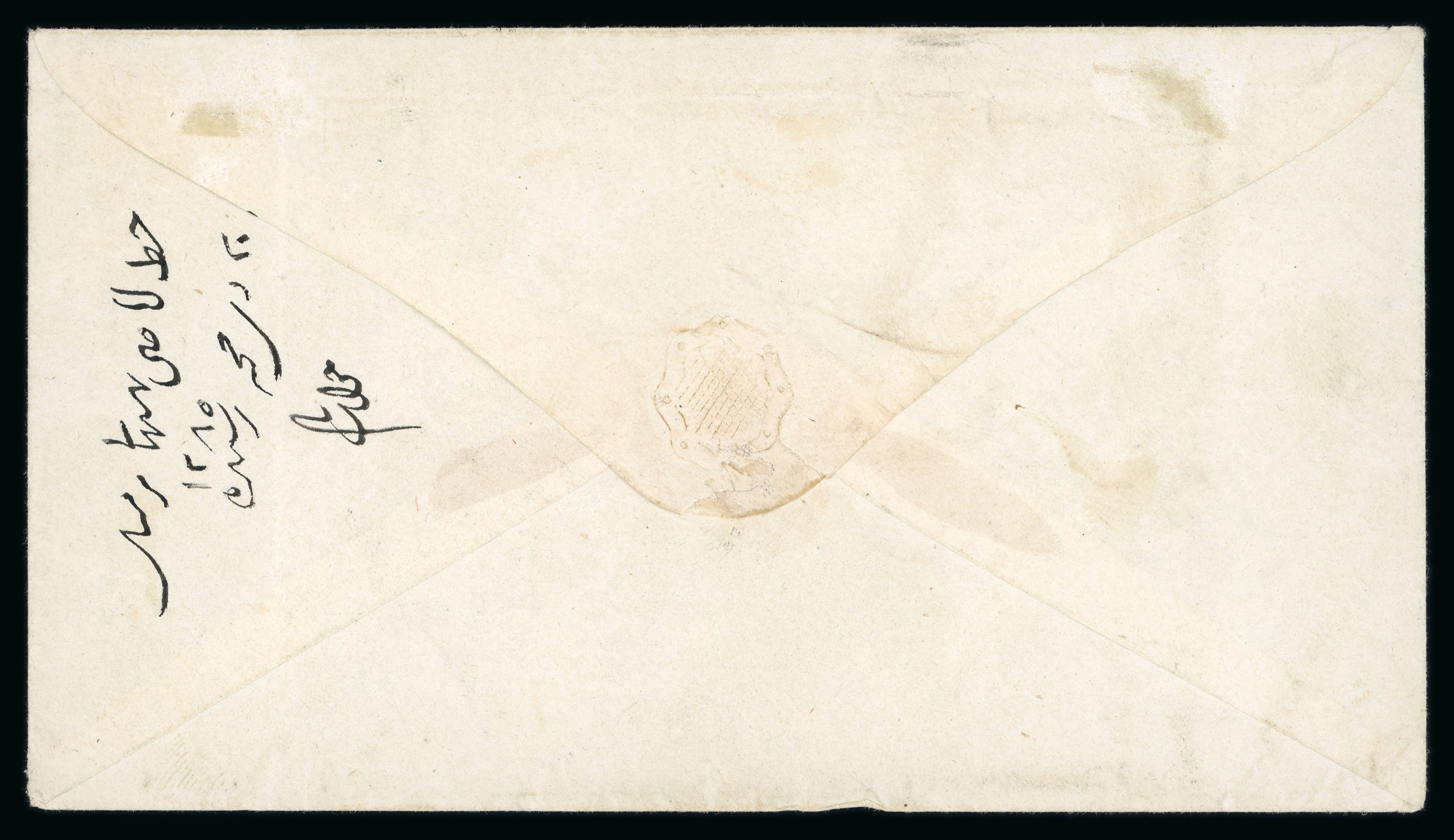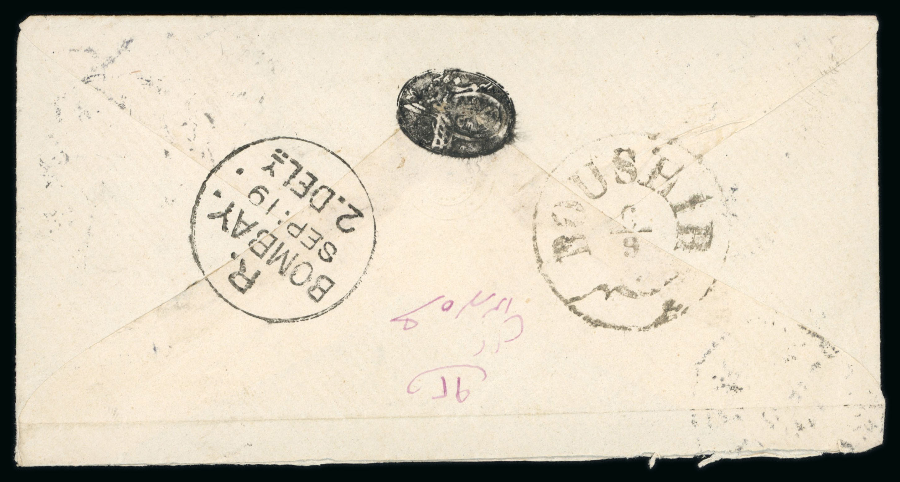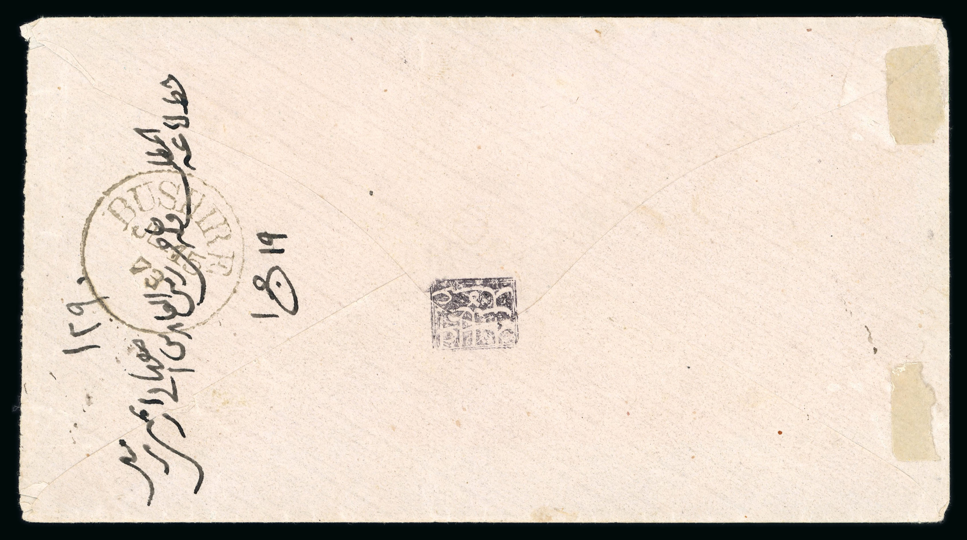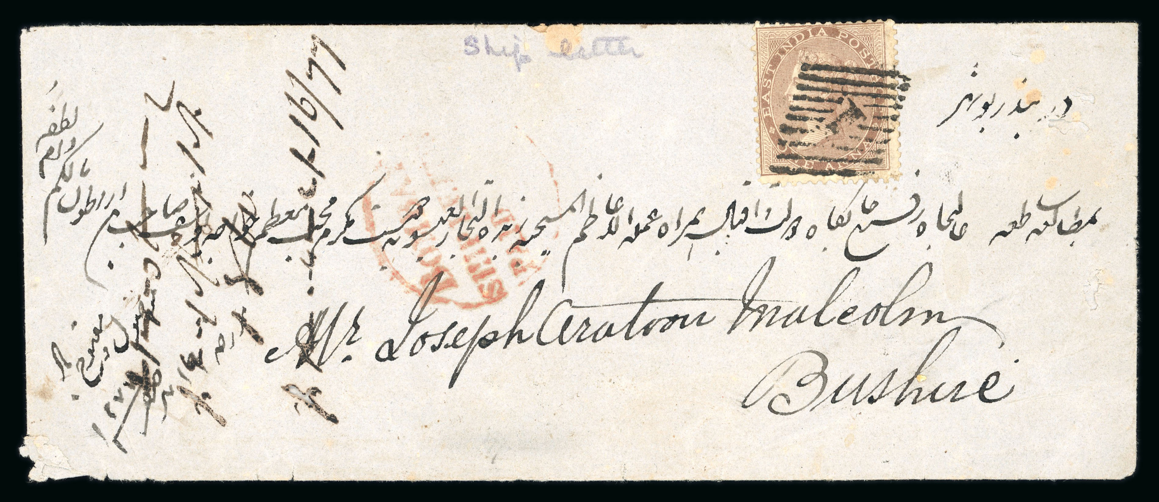 1869, letter from Bombay, India to Bushire, franked with 1865 1 anna brown tied by numeral 1, with red circular Bombay Ship Letter Paid, and Bombay 20 Sep. 1869 departure on reverse; in fine and fresh condition. (Image 1)