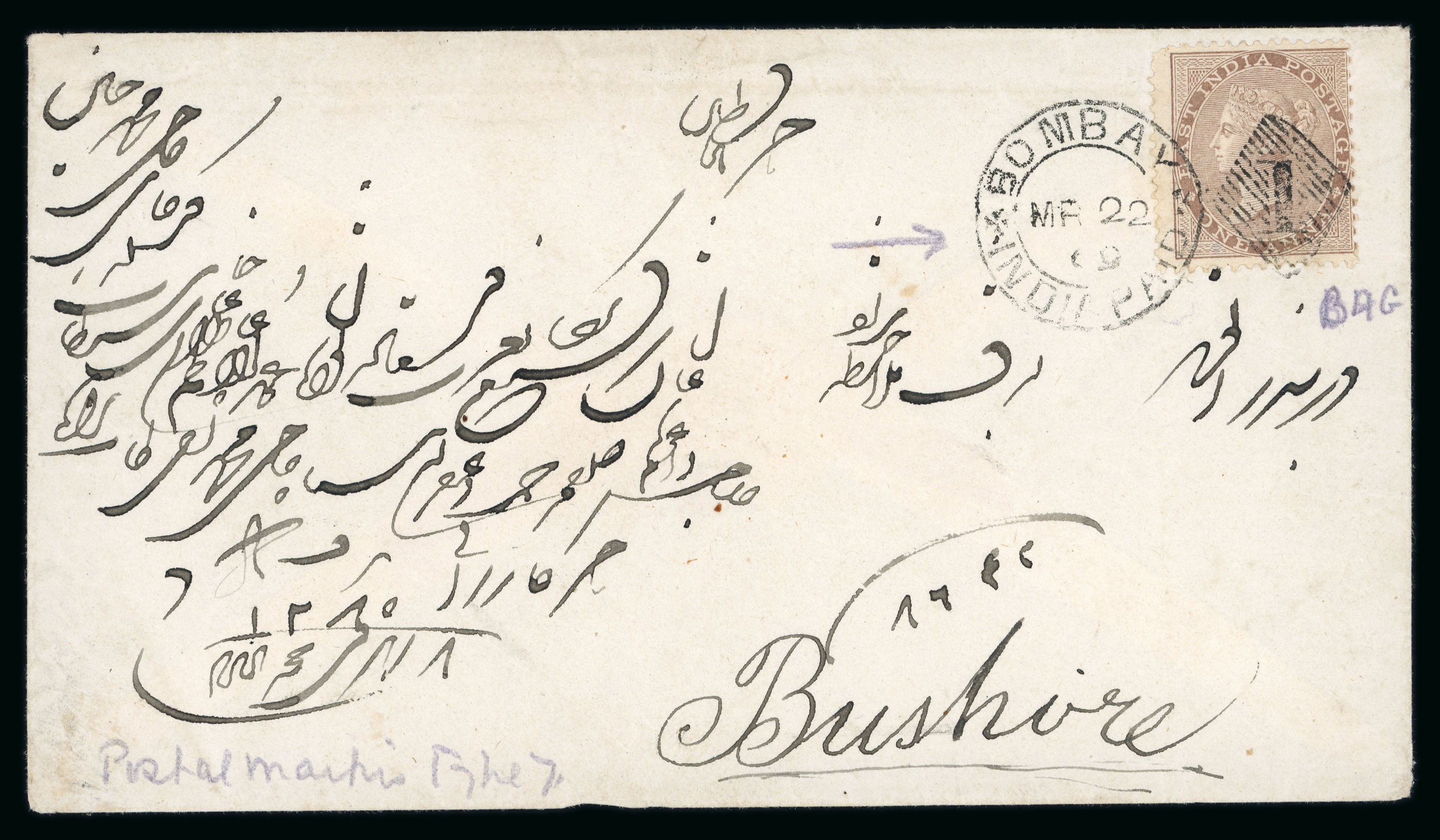 1869, letter from Bombay, India to Bushire, franked with 1865 1 anna brown tied by duplex small diamond numeral 1 with Bombay 22 March 1869, with no arrival postmark on reverse; a most attractive cover in very fresh condition. (Image 1)