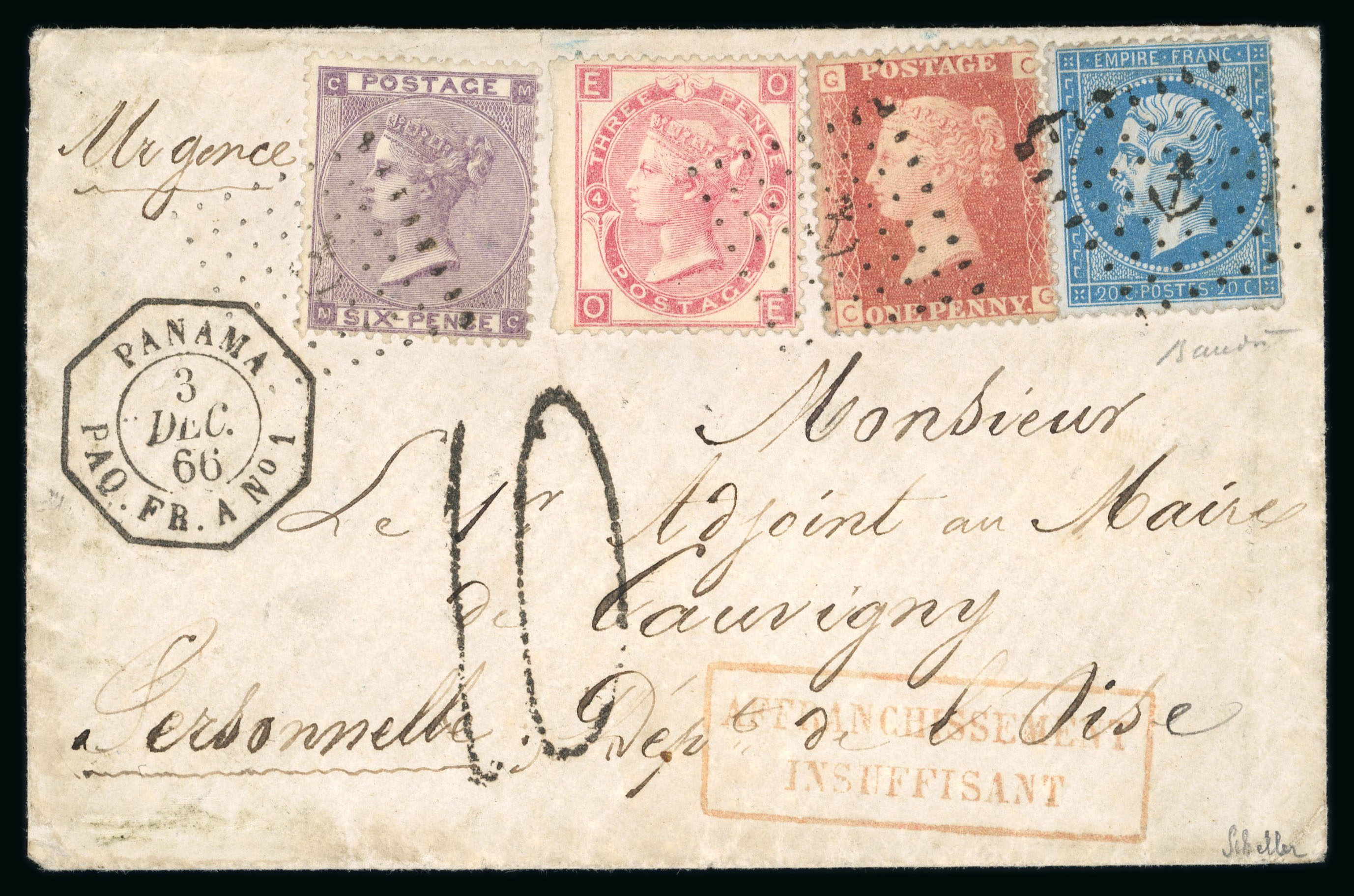 1866 (Dec 3) envelope from Panama to France with an exceptional four-color mixed franking with French Empire perf. 20c blue Y&T 22 and Great Britain 1862-64 6d (hair lines), 1865-67 3d pl.4 and 1864-79 1d red pl.88, each tied by anchor