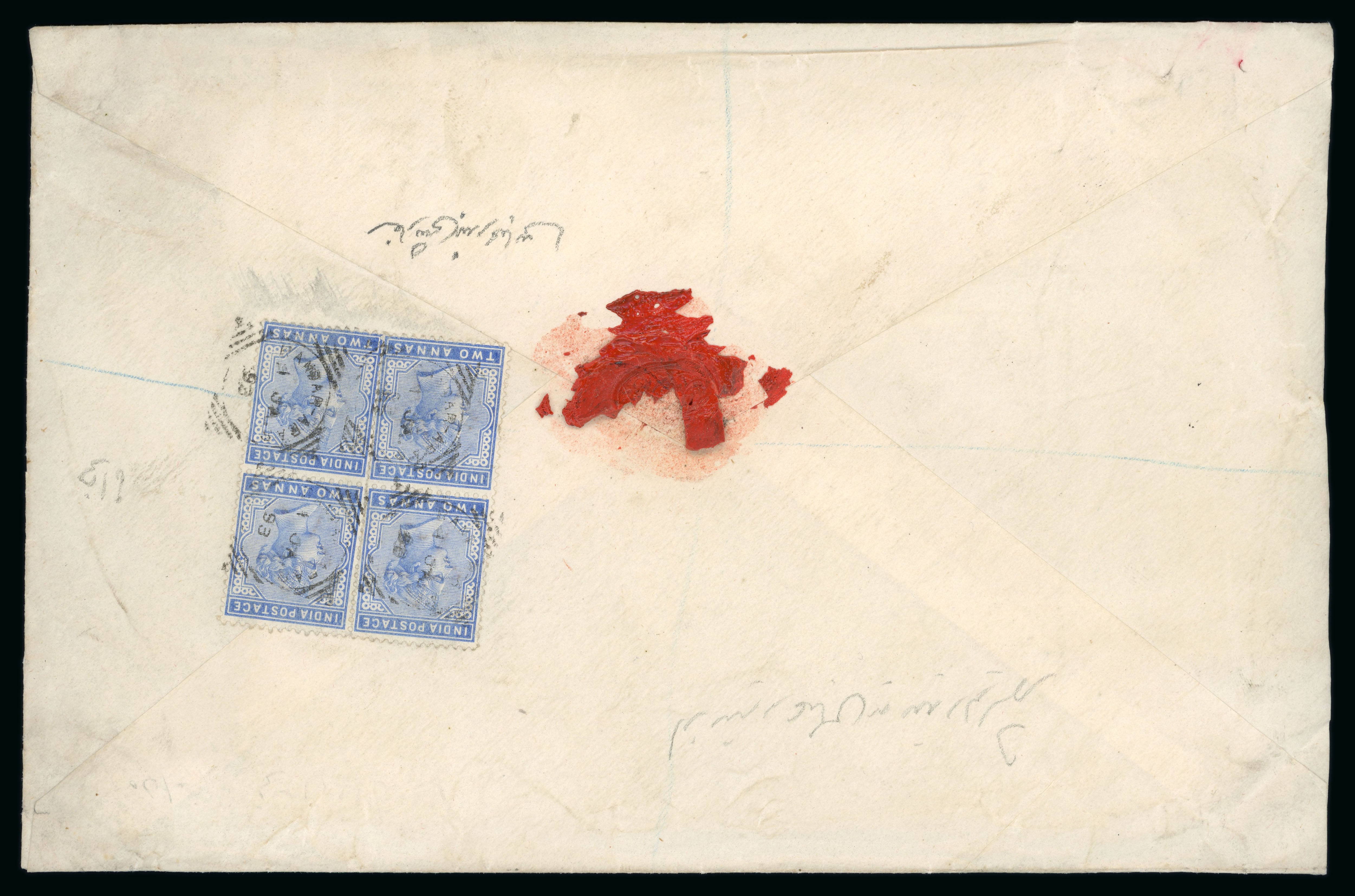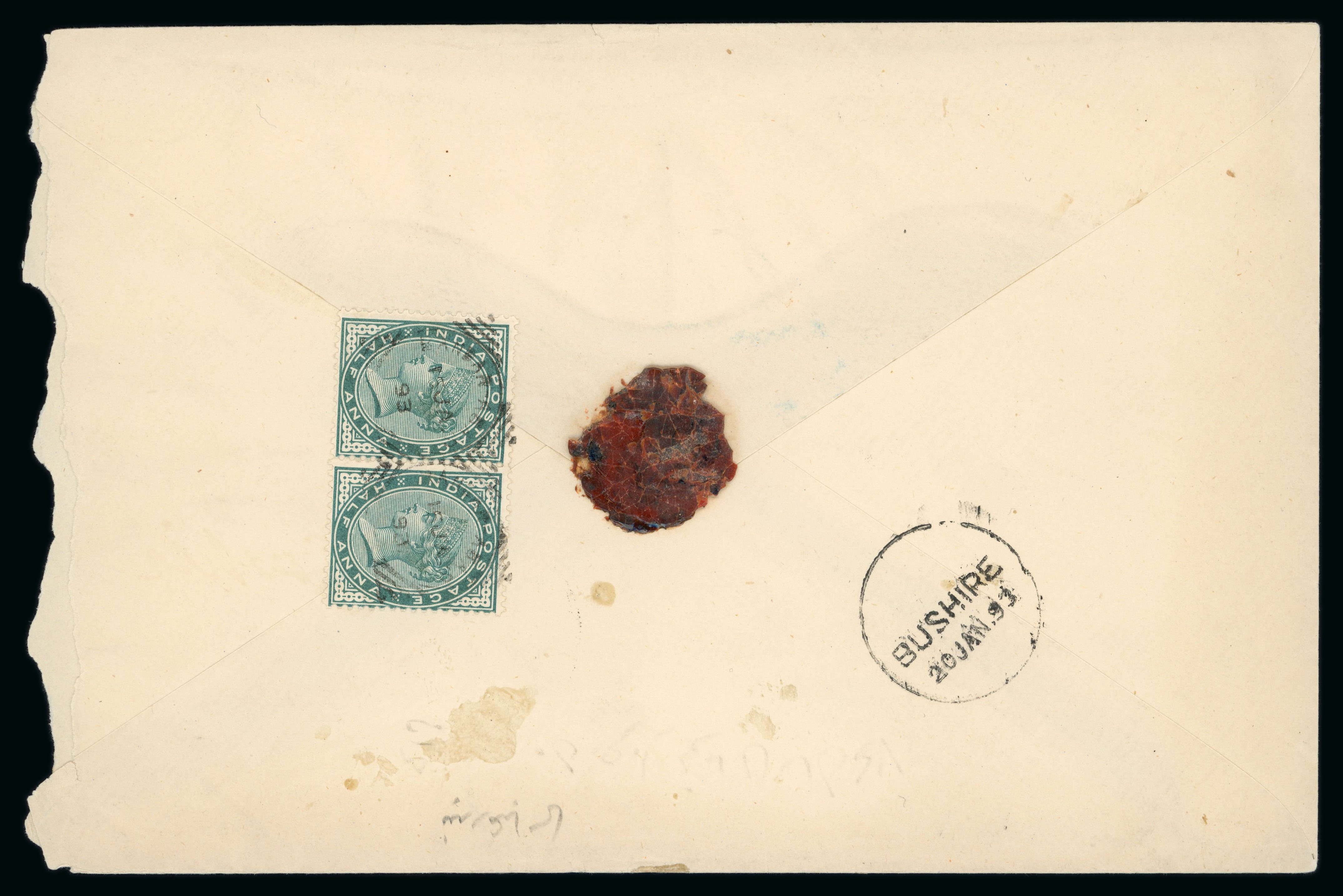 Bandar-Abbas: 1892, registered letter to Bushire, bearing on back pair 1882 3 annas orange-brown and 2 annas blue, struck by indistinct Bandar-Abas squared circle cds Dec 92. With blue cross marked on front and rectangular numbered