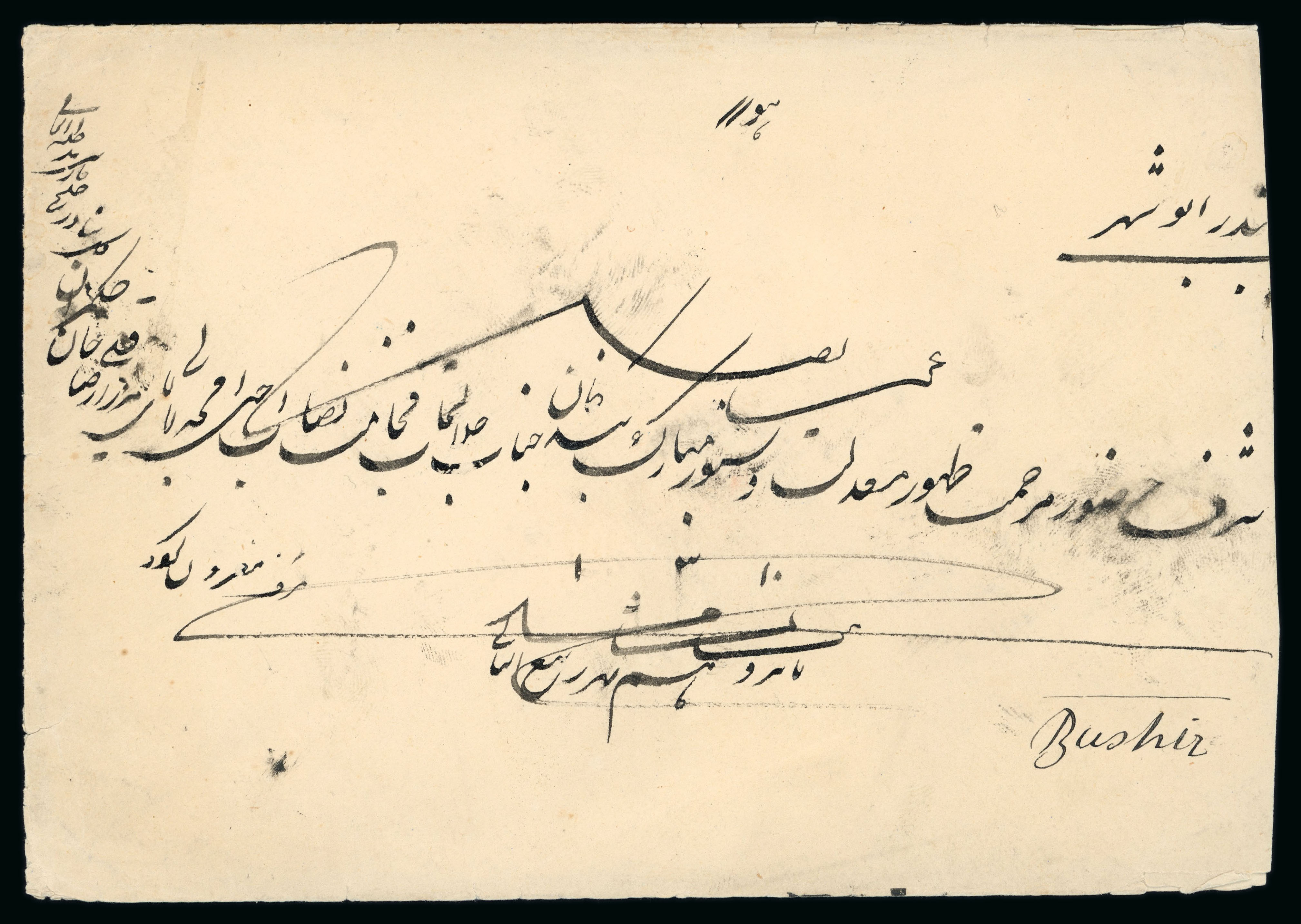Bandar-Abbas: 1892, letter to Bushire, bearing on back a single 2 anna pale blue tied by Bandar Abas squared circle cds. Also on back Bushire arrival 11 Nov 92. Letter with cropping to right side. (Image 1)
