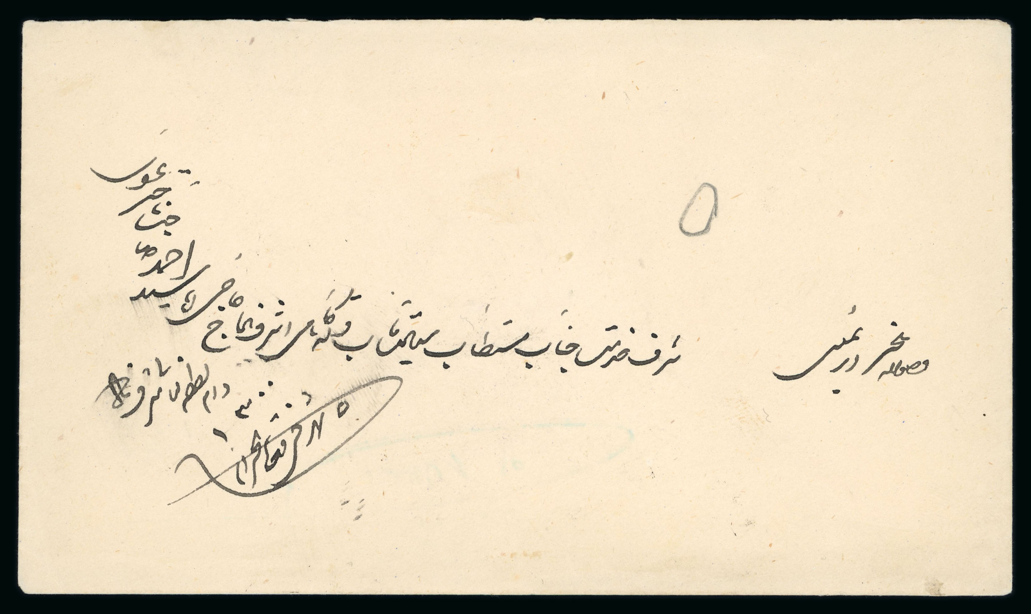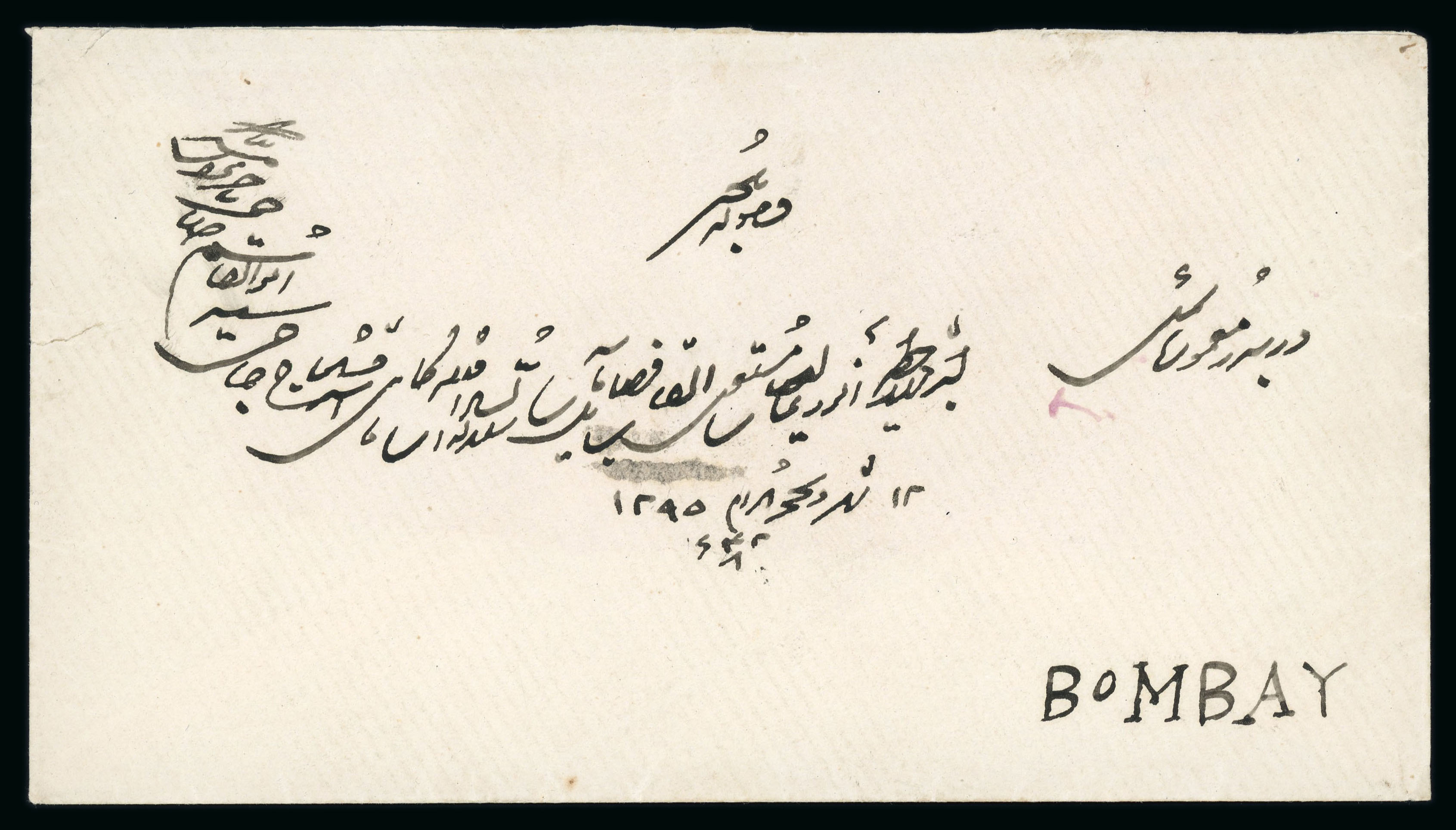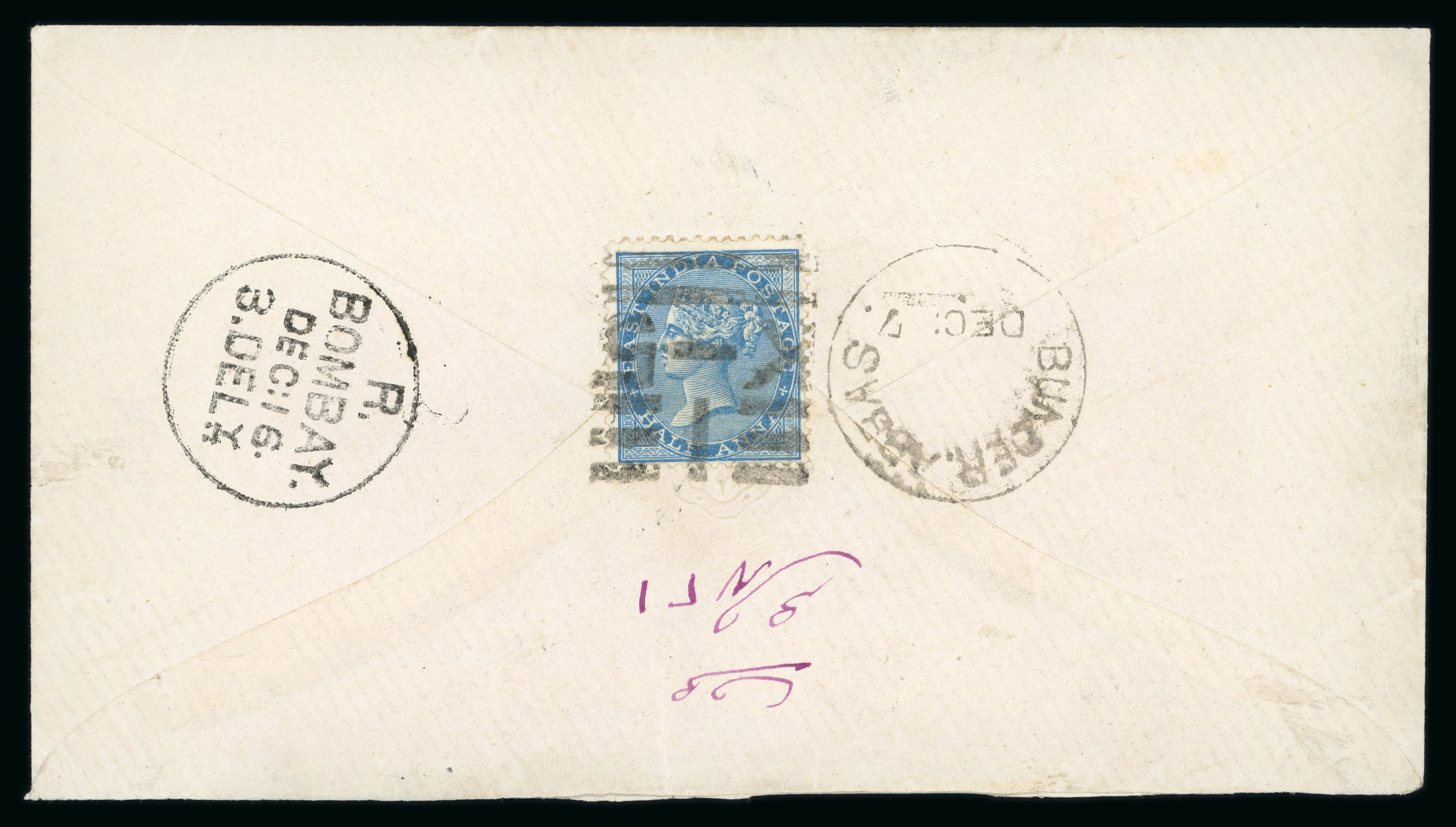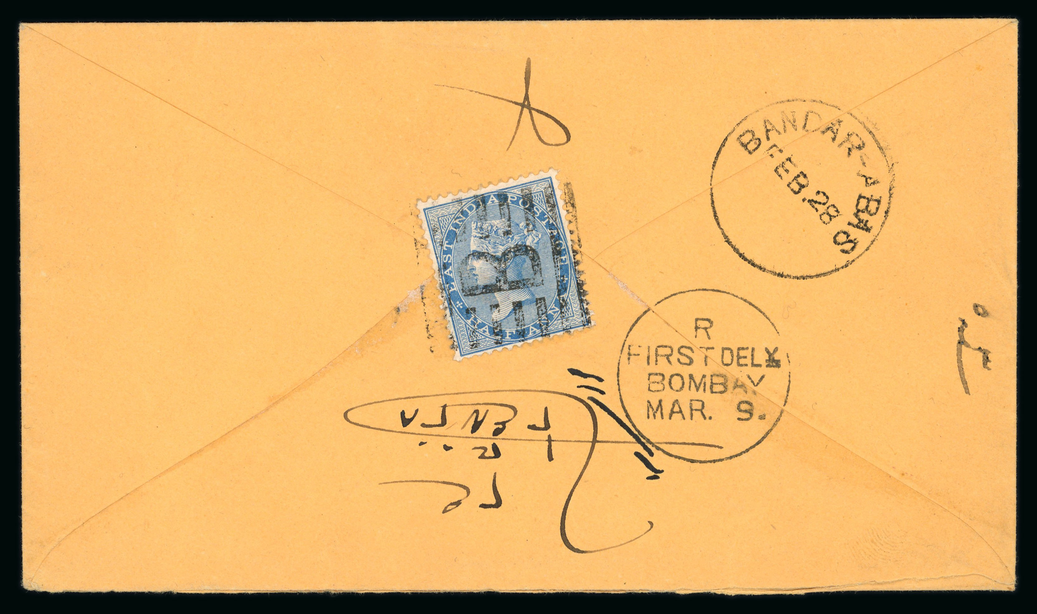 Bandar-Abbas: 1880s, letter to Bombay bearing on back 1873 1/2 anna blue die II, tied by duplex Bunder Abbas Dec 1 and K-I-5 in square grid. Alongside is Bombay receiver Dec 9. A very attractive small envelope with a very good strike of