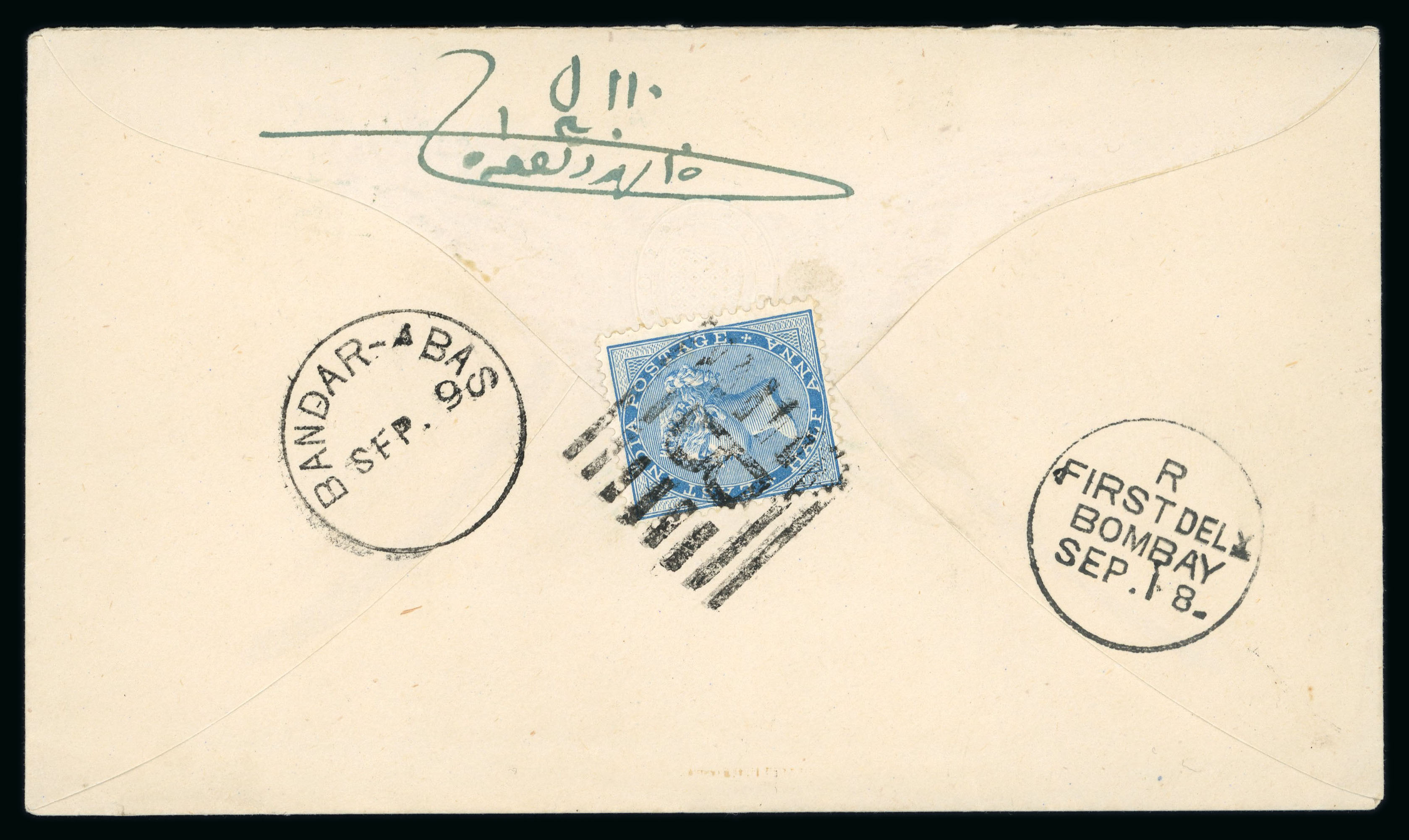 Bandar-Abbas: 1880s, letter to Bombay bearing on back 1873 1/2 anna blue die II, tied by duplex Bunder Abbas Dec 7 and K-I-5 in square grid. Alongside is Bombay receiver Dec 16. A very attractive small envelope with a very good strike of