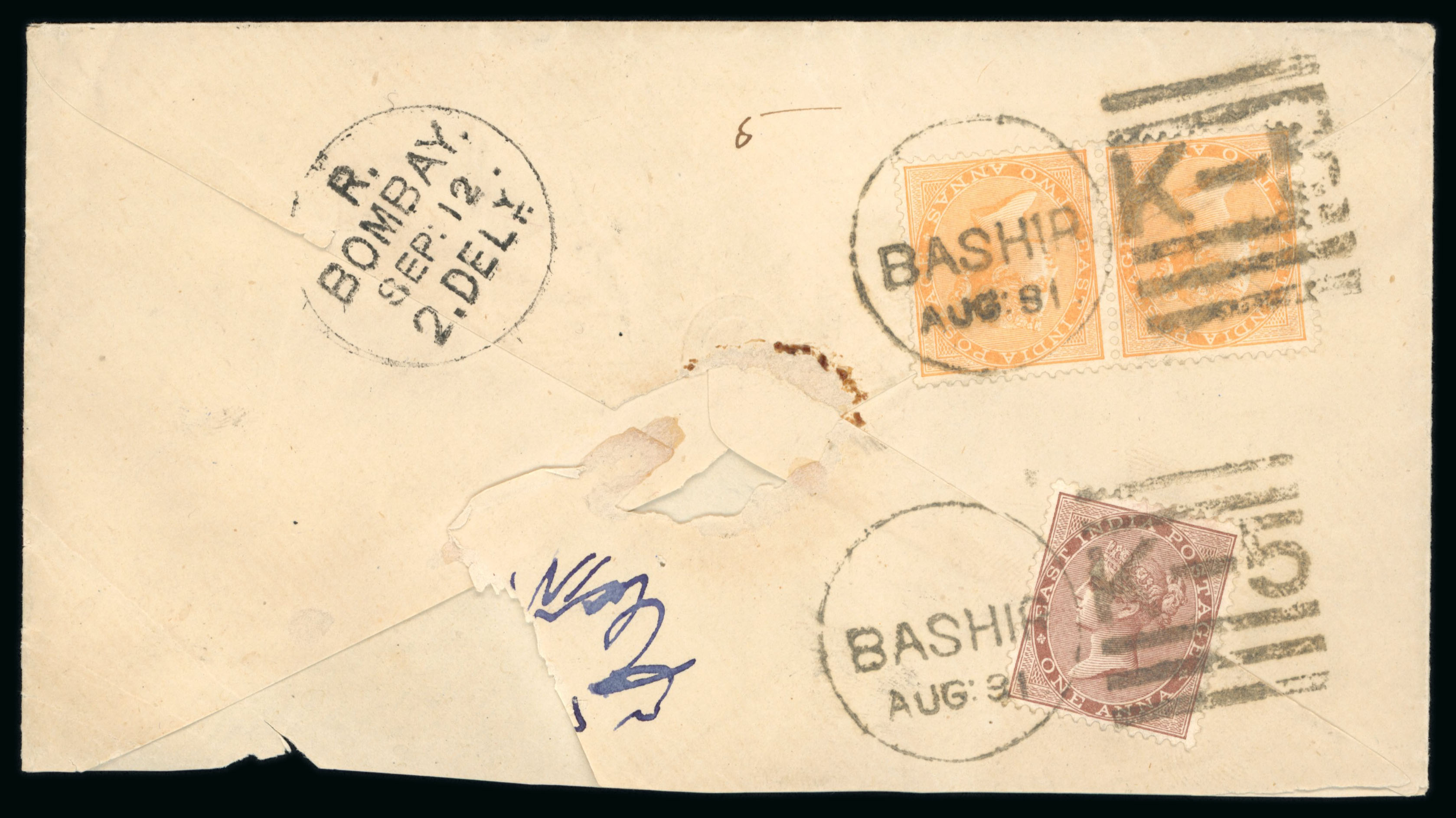 Bandar-Abbas: 1880s, letter to Bombay bearing on back single 1873 1/2 anna blue die II, tied by B in square grid and alongside Bandar-Abas Apr 3. Also on back is Bombay receiver Apr 13. A very attractive and tidy complete envelope with