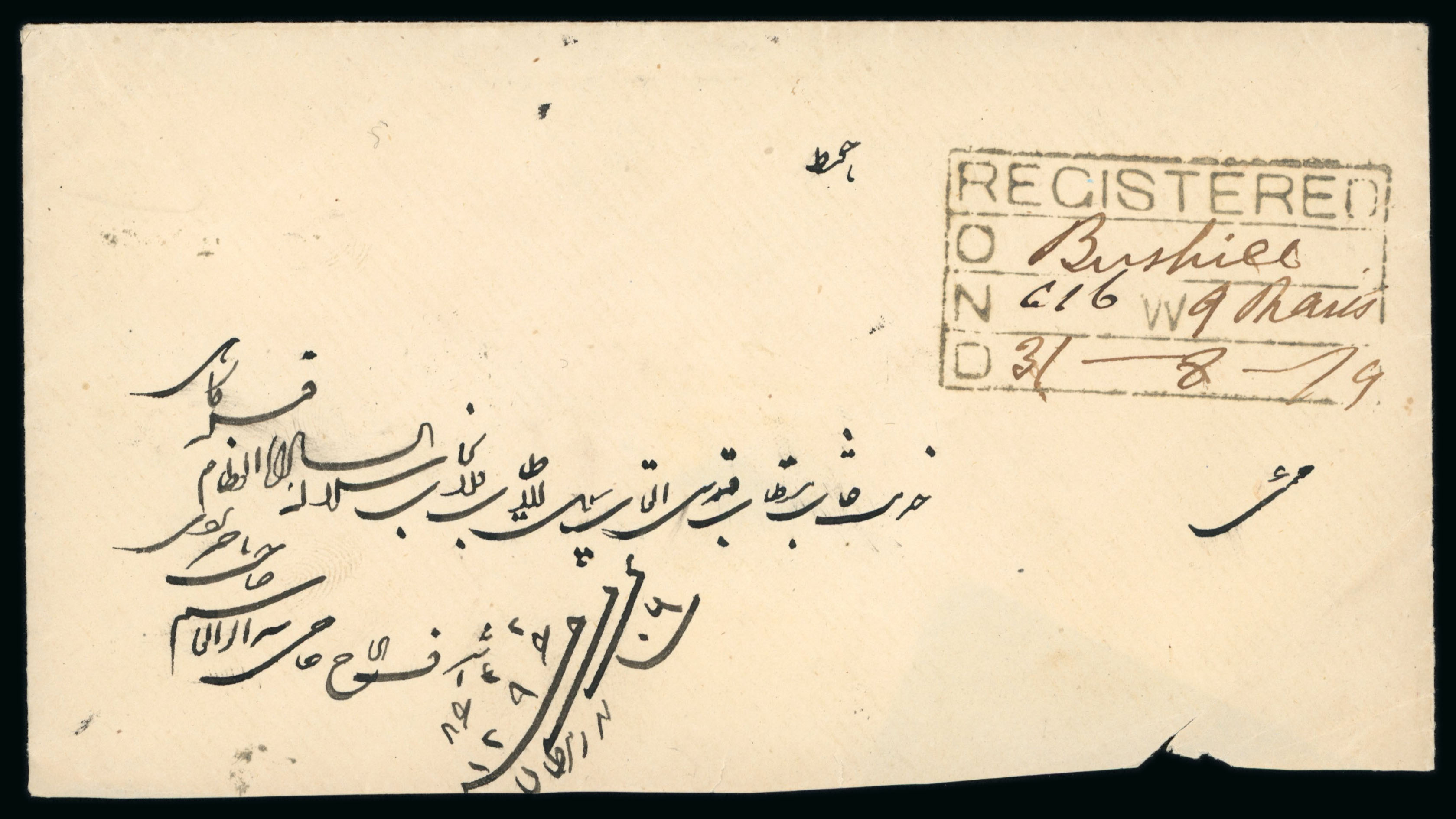 registration marking in black. A very rare registered mail from the Bandar Abbas Indian office in Persia; some light wrinkling to envelope and minor holes to front of envelope. (Image 1)