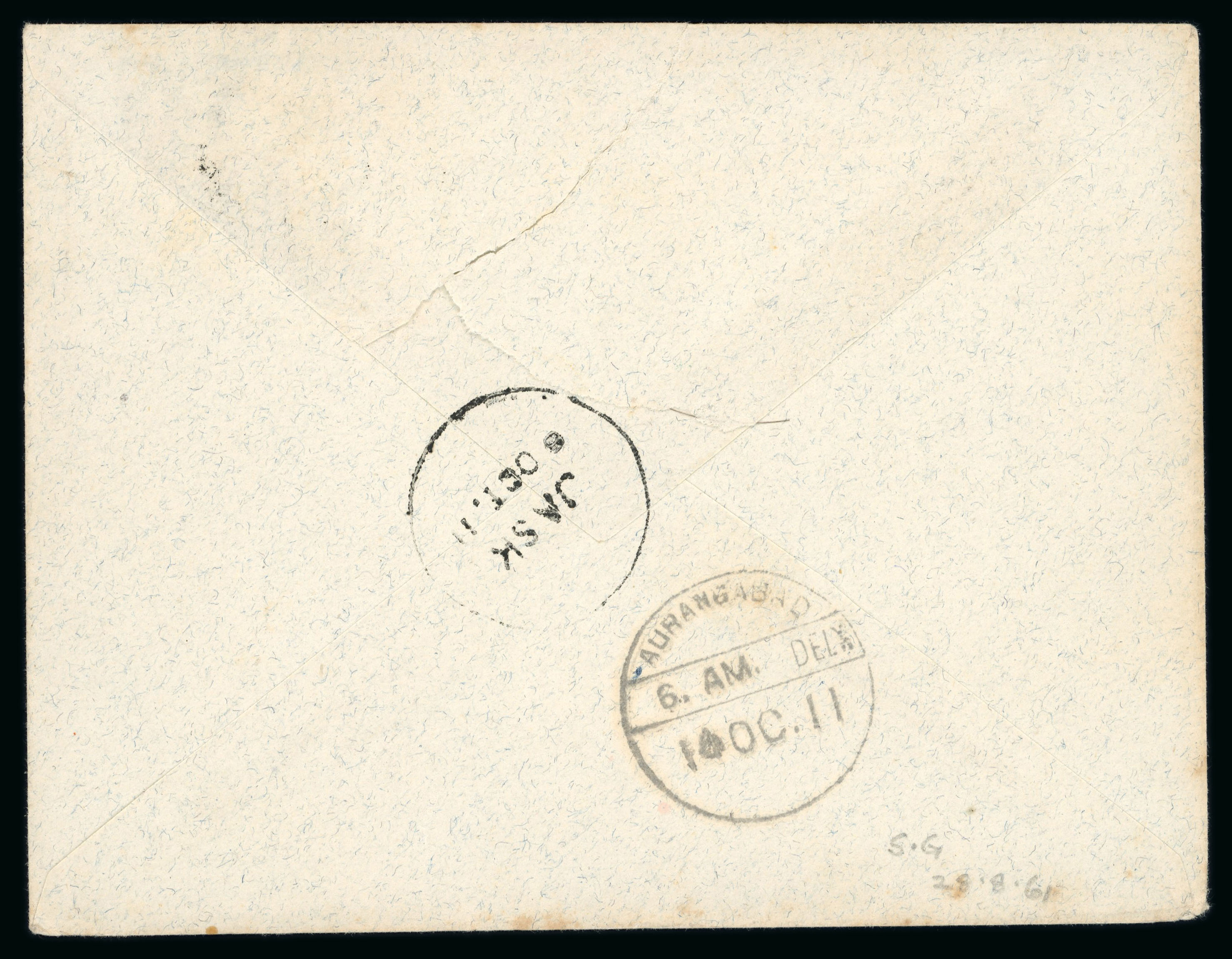 Jask. 1911, letter from Jask to Aurangabad, franked by 2 1/2 anna blue tied by squared circle Jask 6 Oct. 1911. On reverse are circle Jask 6 Oct. and Aurangabad 16 Oct. 11 arrival. A very fine and fresh envelope from an Indian postal