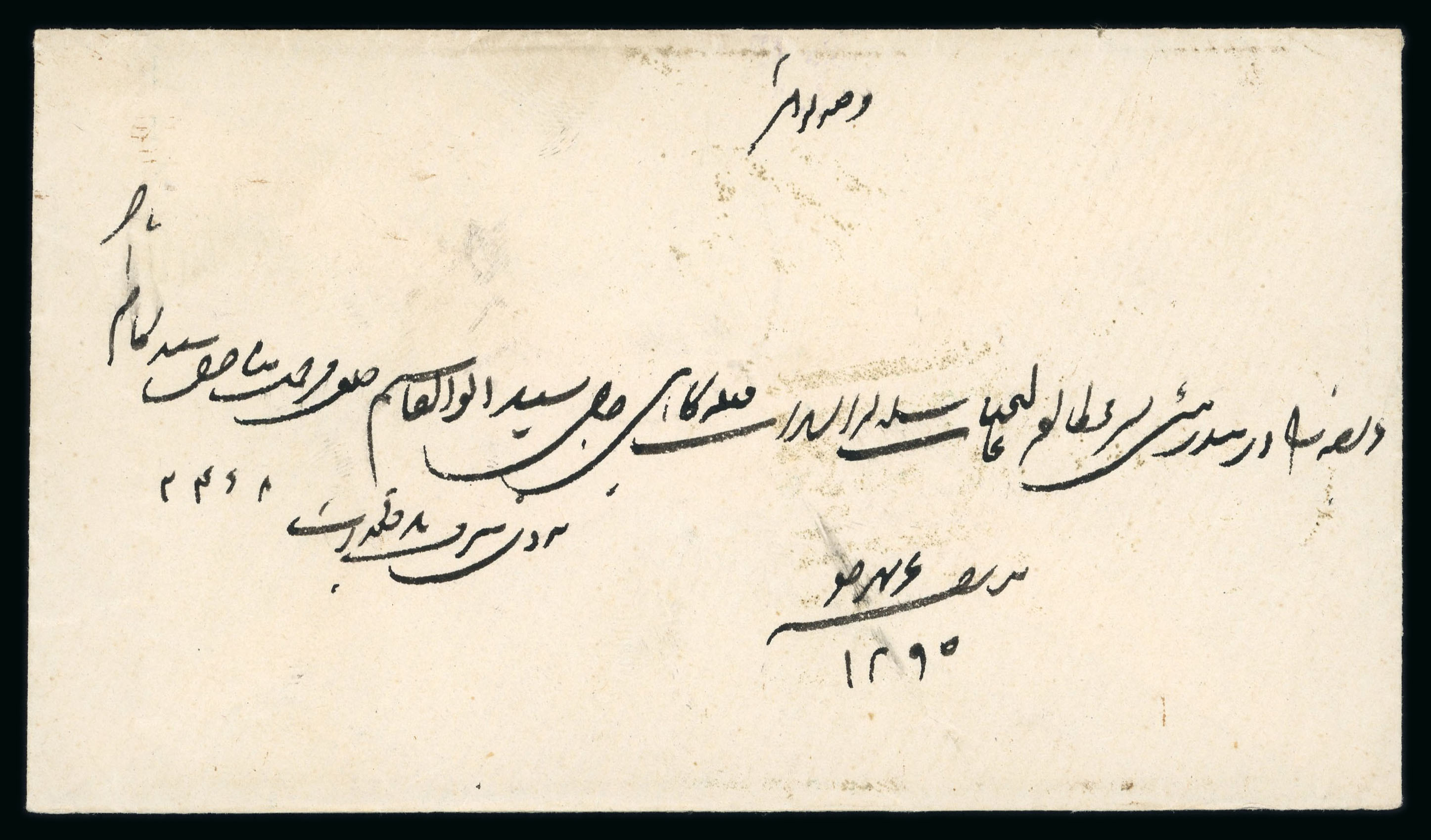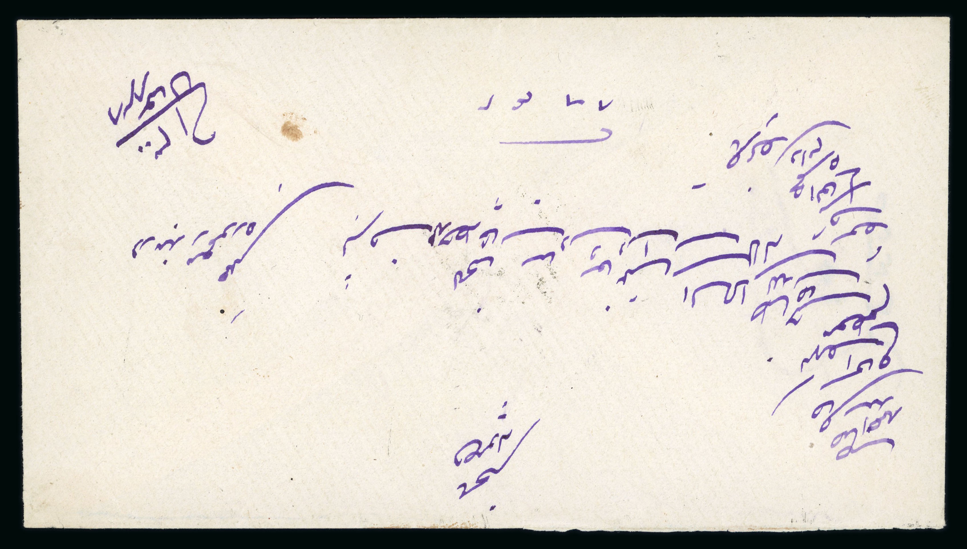 Linga: 1892, letter sent to Bushire, carrying on back two 12882 1/2 anna blue-green, tied by indistinct Linga No 8 92. Also on back is Bushire receiver 11 Nov 92. A fine cover with some light toning. (Image 1)