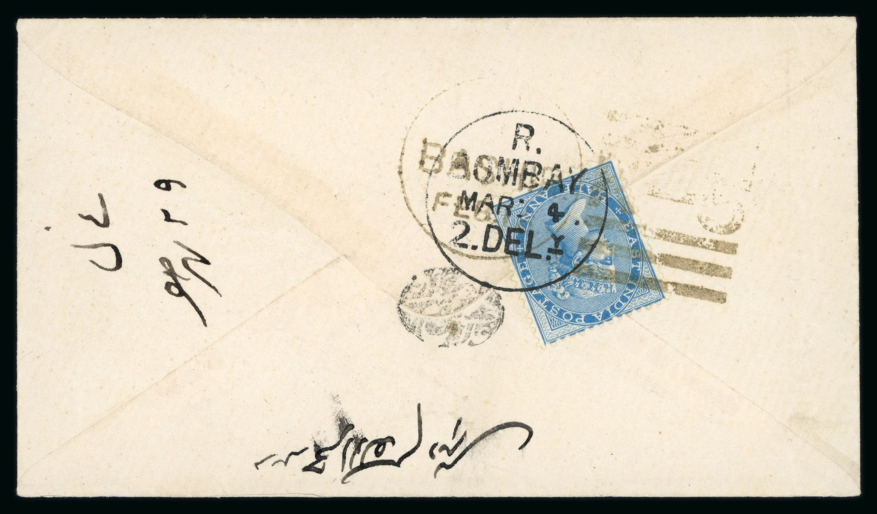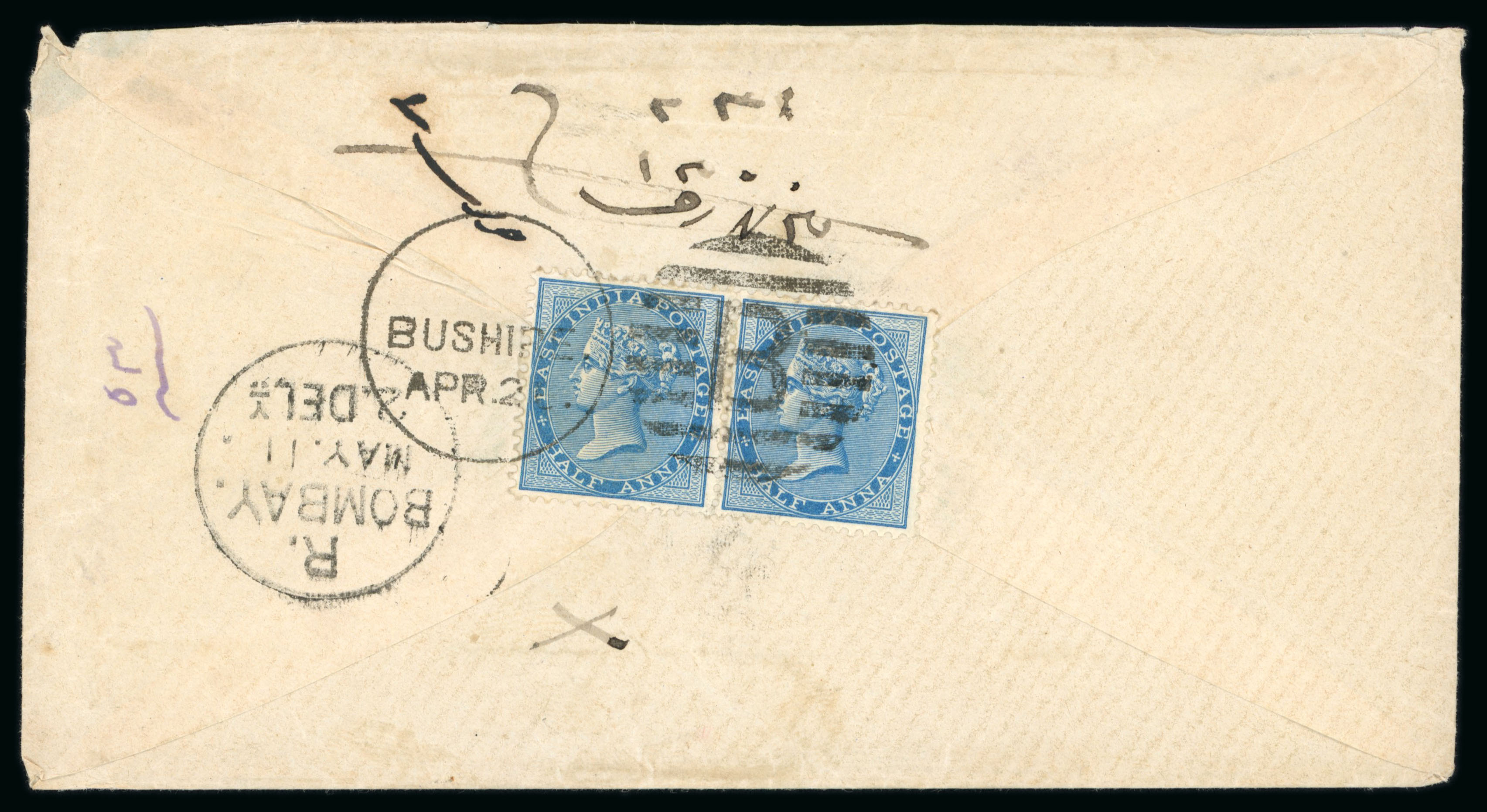 Bushire: 1880s, envelope to Bombay bearing on back 1873 1/2 anna blue die II, tied by Bashir K-5 duplex, also tied by Bombay receiver Mar 4, fine. (Image