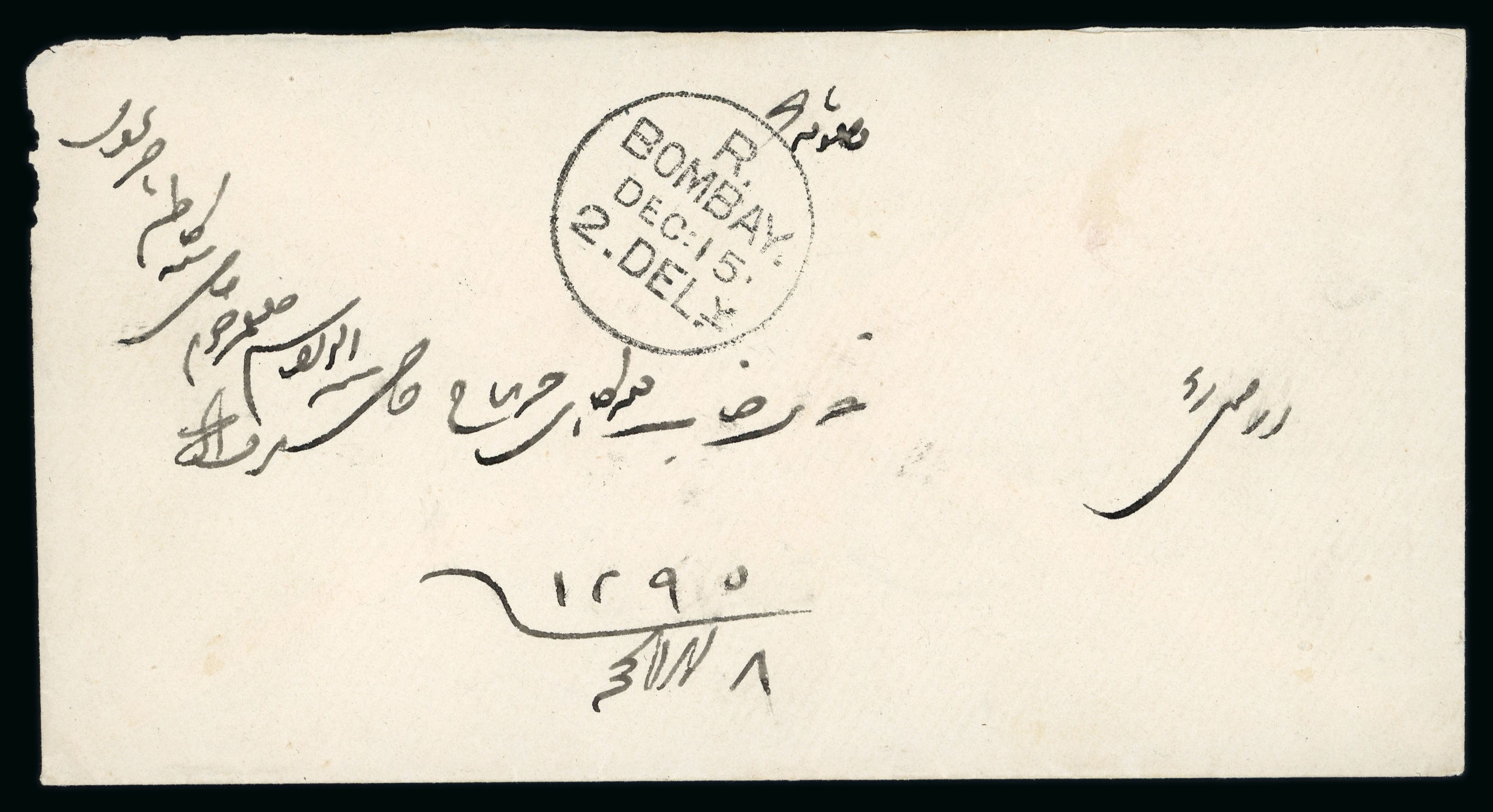 Bushire: 1880s, letter to Bombay bearing on back 1873 1/2 anna blue die II, tied by Bashir "K-5" Dec 4 duplex. On front is Bombay receiver Dec 15. A very attractive small envelope with a decent strike of the duplex Bashir postmark. (Image 1)