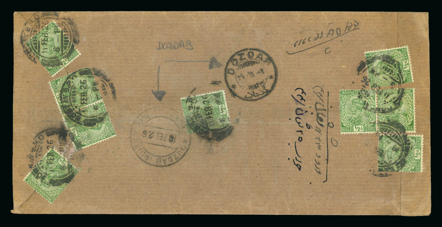 Duzdab: 1926, letter sent to Yazd, bearing nine 1911 1/1 anna light green, tied to back of cover by large Bombay GPO 11 Feb 26. Also on back is Dozdab transit and rare Duzdab Indian Exchange PO. According to SG, the Duzdab