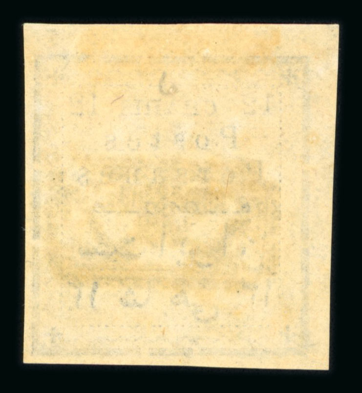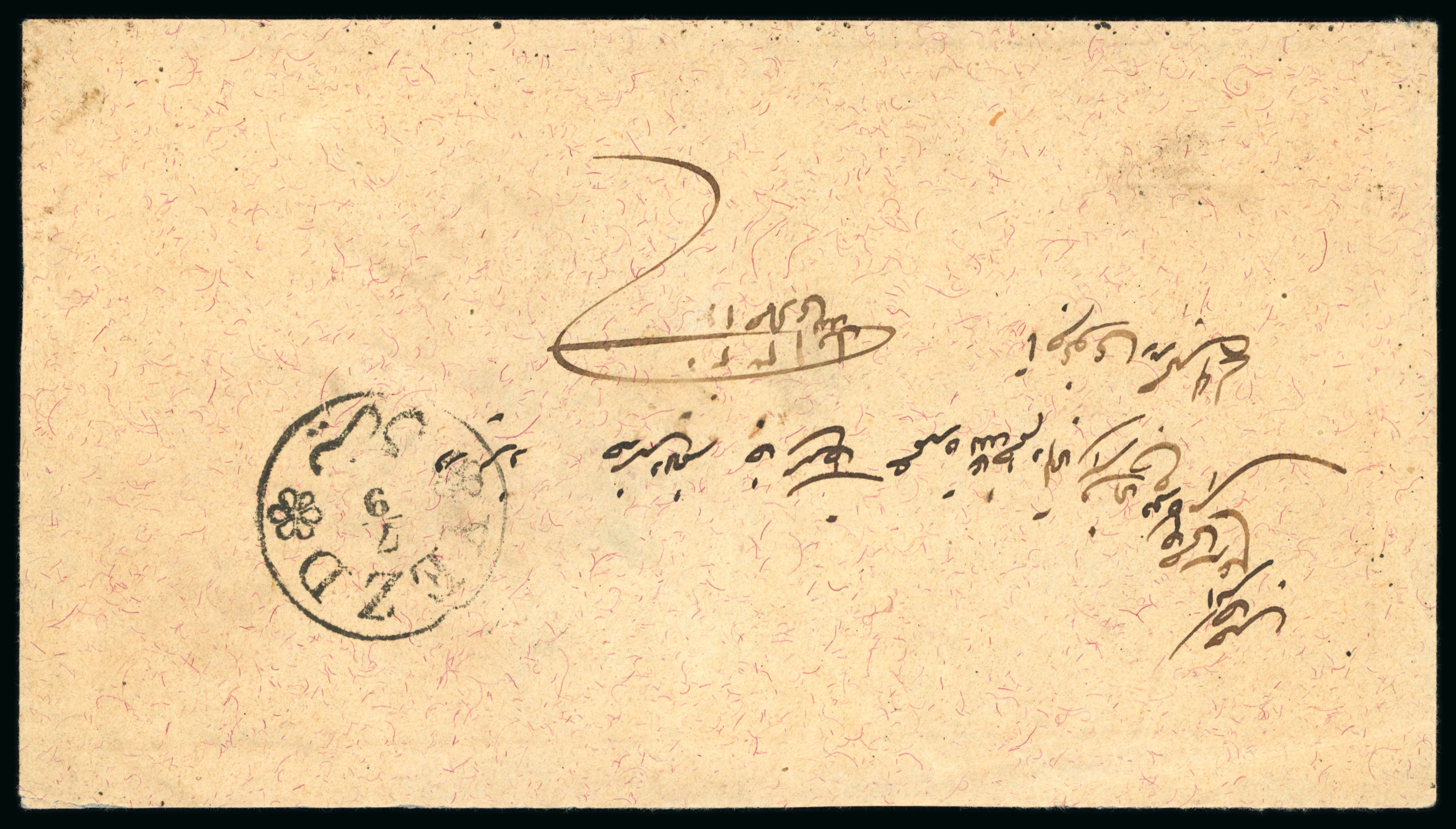 1906 envelope from Bushire to Yazd franked on reverse with 1906 Teheran Provisional Typeset issue 6ch red tied Bouchir date stamp, margin touched at top and large to very large on other sides even showing part of stamp at right (Image 1)