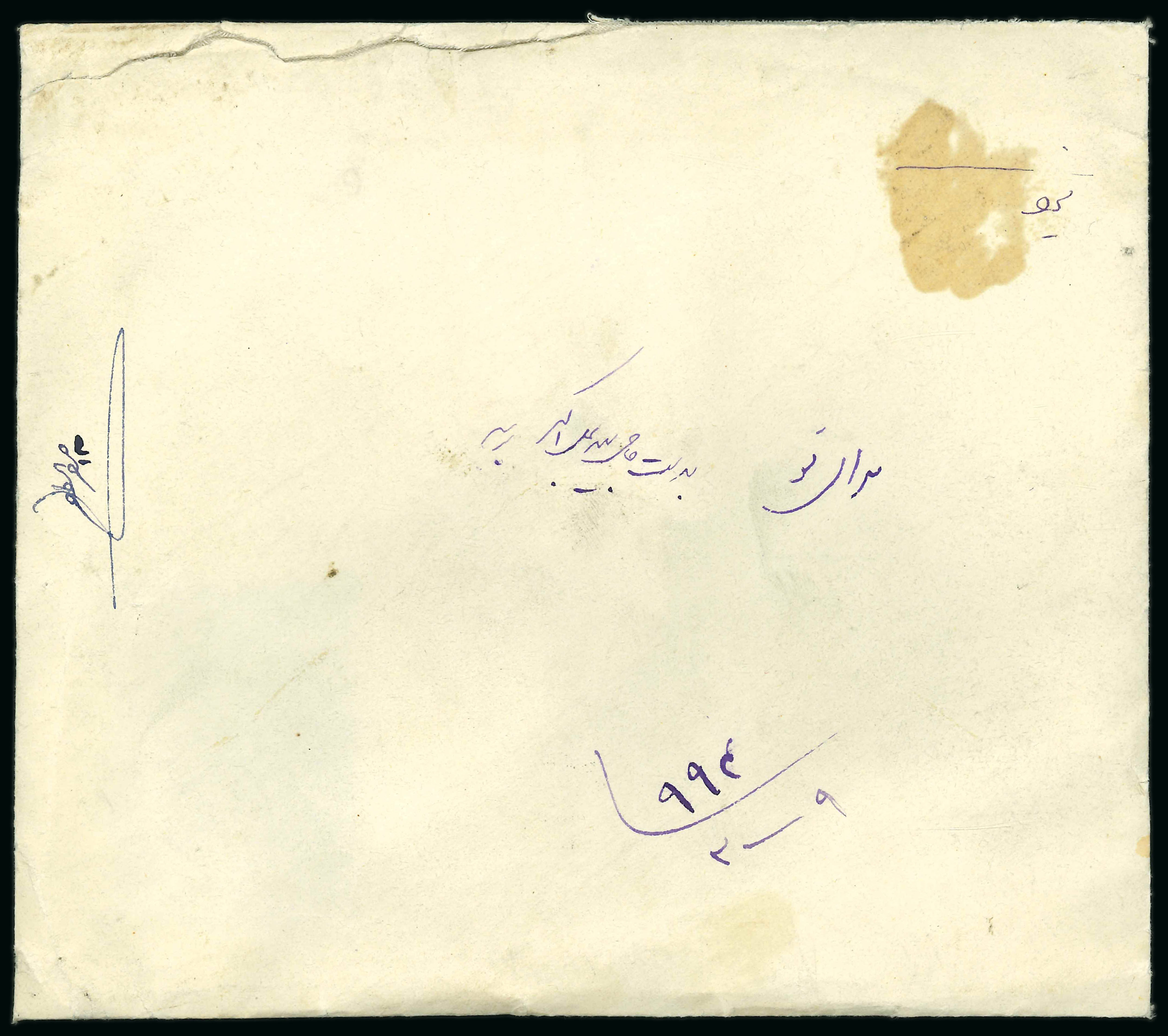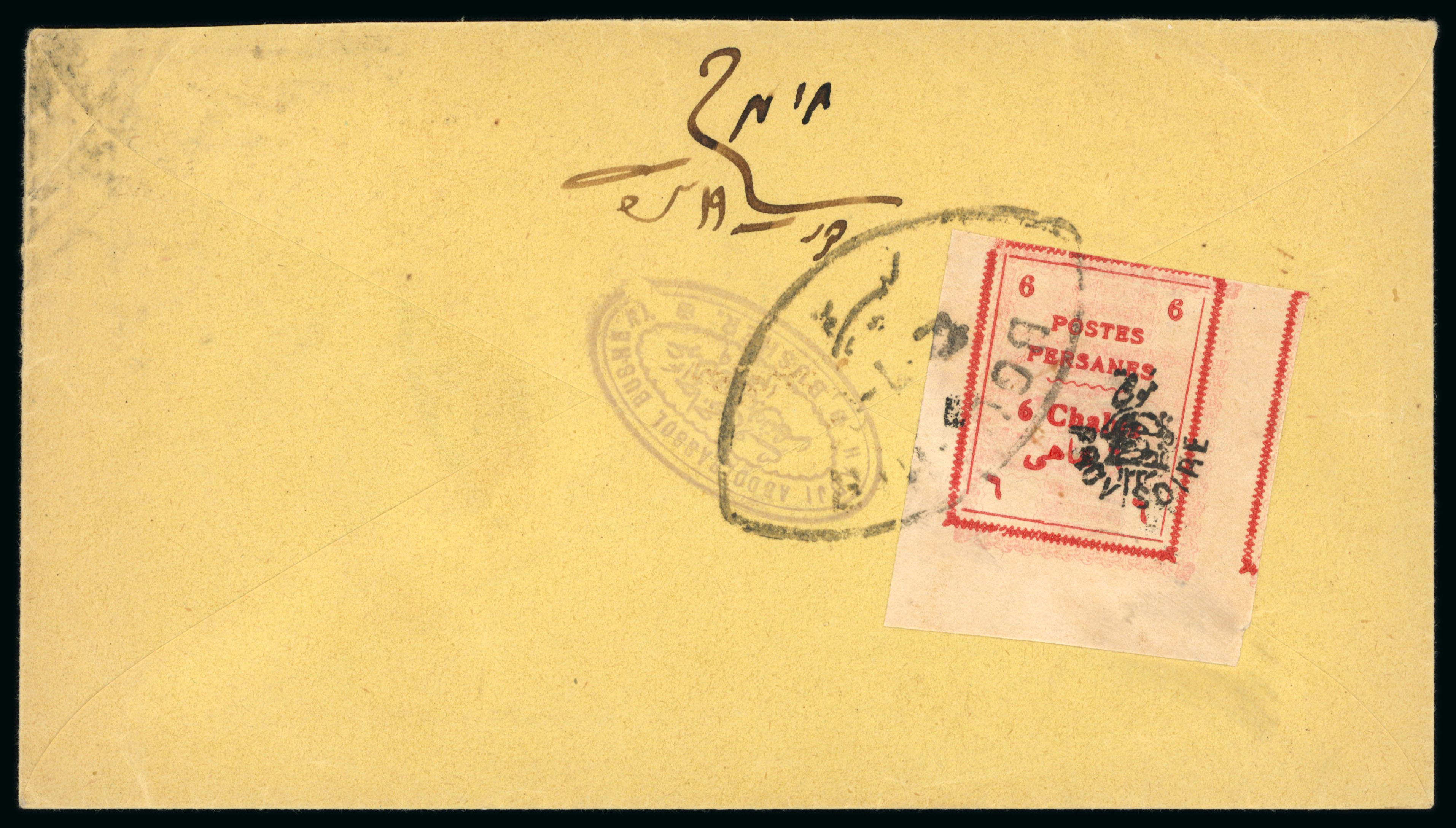 1906 (27-3) envelope from Teheran to Yezd franked on the reverse with 1905-06 Internal Mail Provisional 1ch on 3ch magenta overprint x 9, one stamp has been cut out from envelope, despite this vandalism a worthwhile item