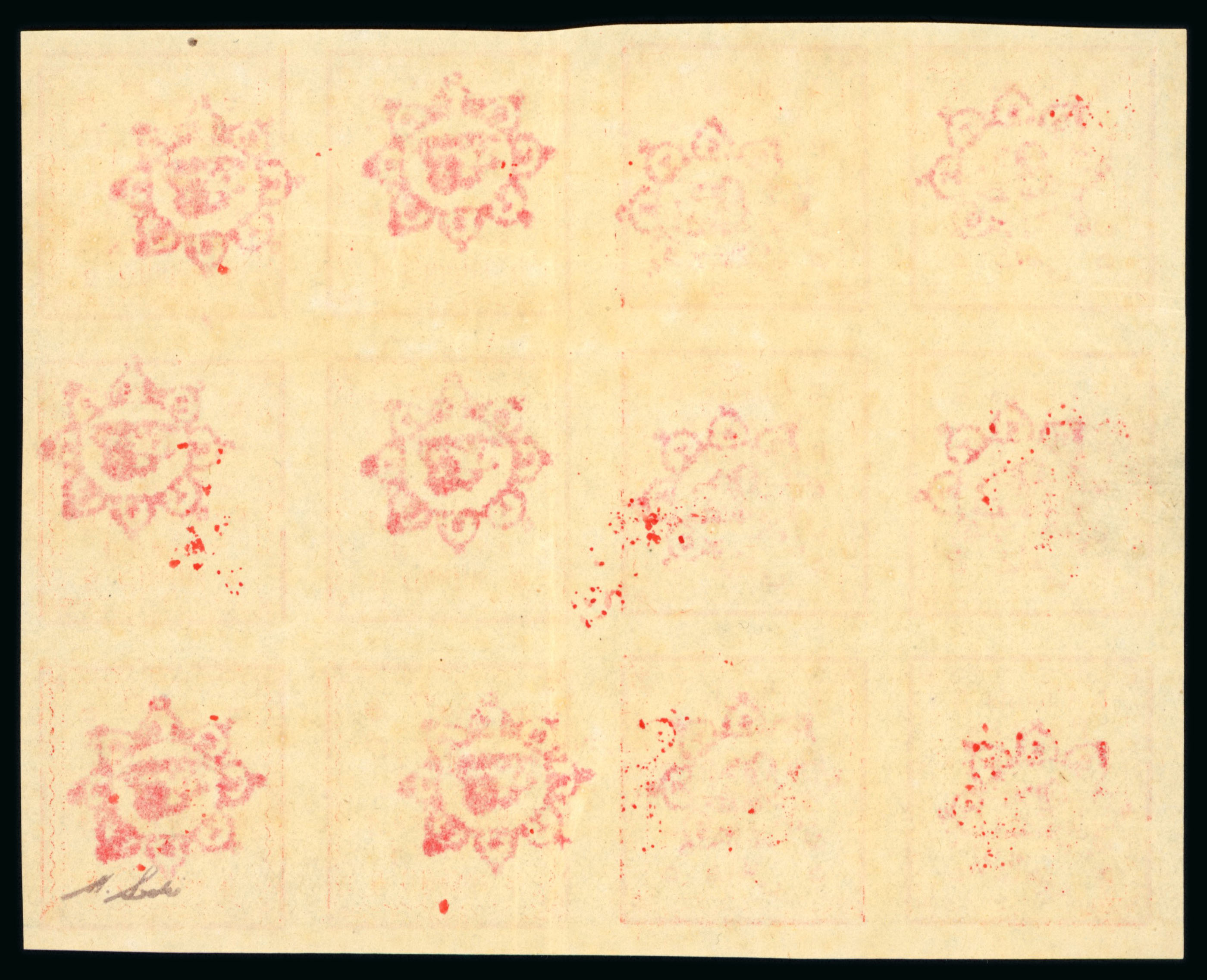 1902 Teheran Typeset 5ch block of twelve (4 x 3) comprising of three horizontal tete-beche pairs, from positions 1-6 and 7-12 of adjacent panes, vertical crease through second column, fresh mint never hinged. Persiphila Opinion (2015) (Image 1)