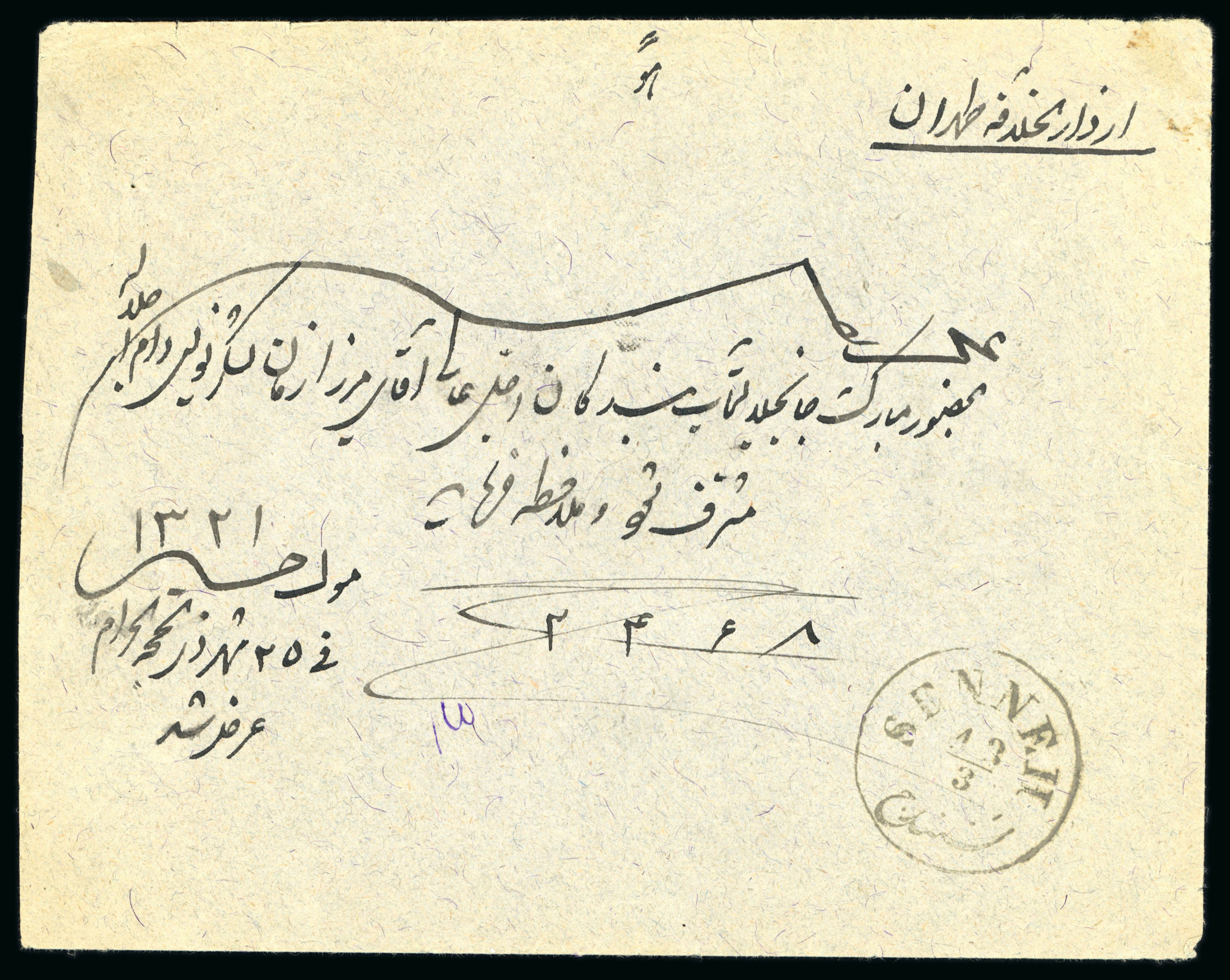 1904 (13/3) stampless envelope from Sanandaj to Teheran with despatch cds on front and on reverse a very fine strike of triangular bilingual TAXE PAYEE handstamp with image of Lion at the top, arrival cds to right (23/3). Only one example