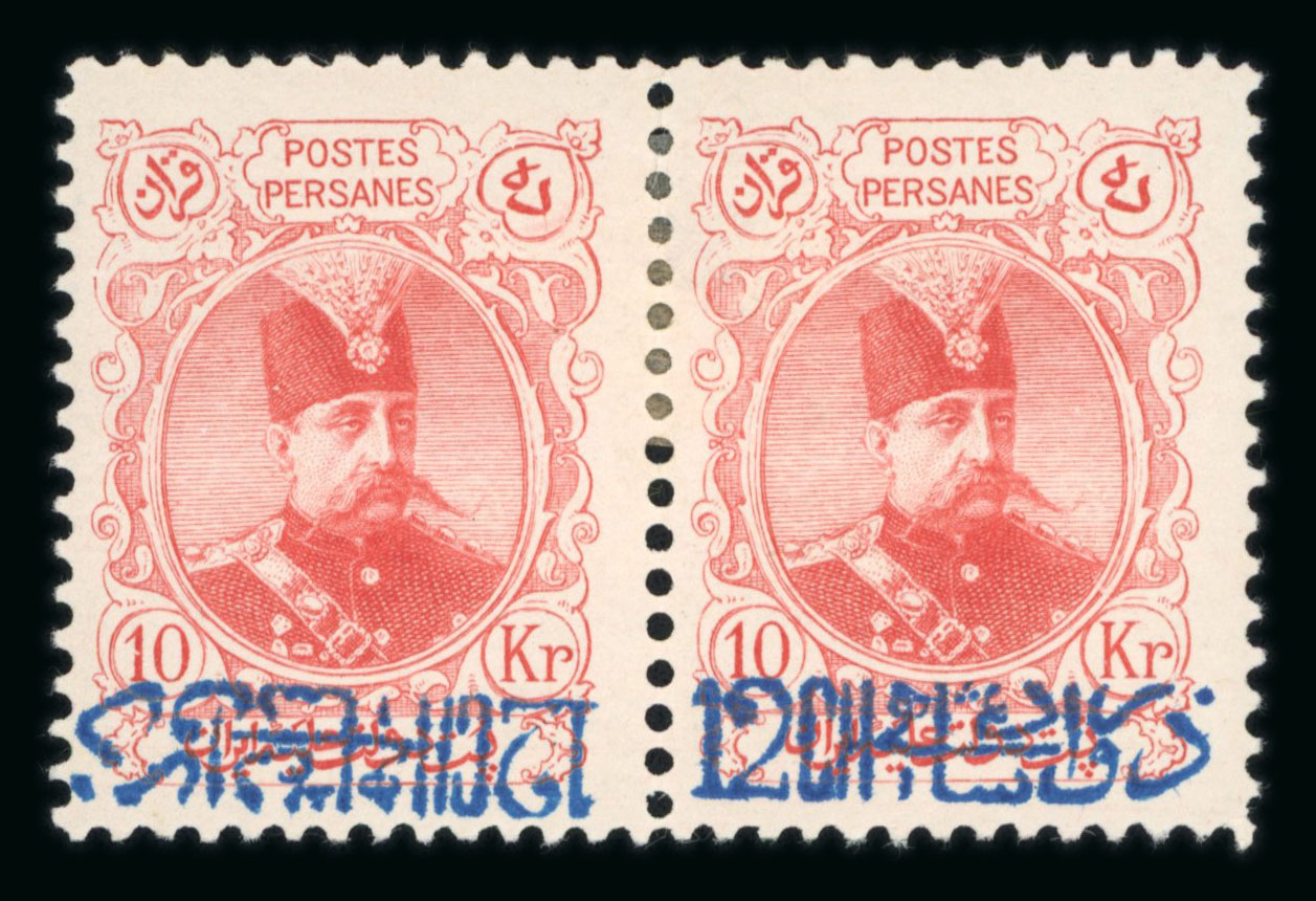 1902-04 Mozaffar eddin Shah full portrait 12ch on 10kr blue surcharge in horizontal pair, the left-hand stamp with inverted surcharge, hinged mint, IPSC Cert (2024) (Image 1)