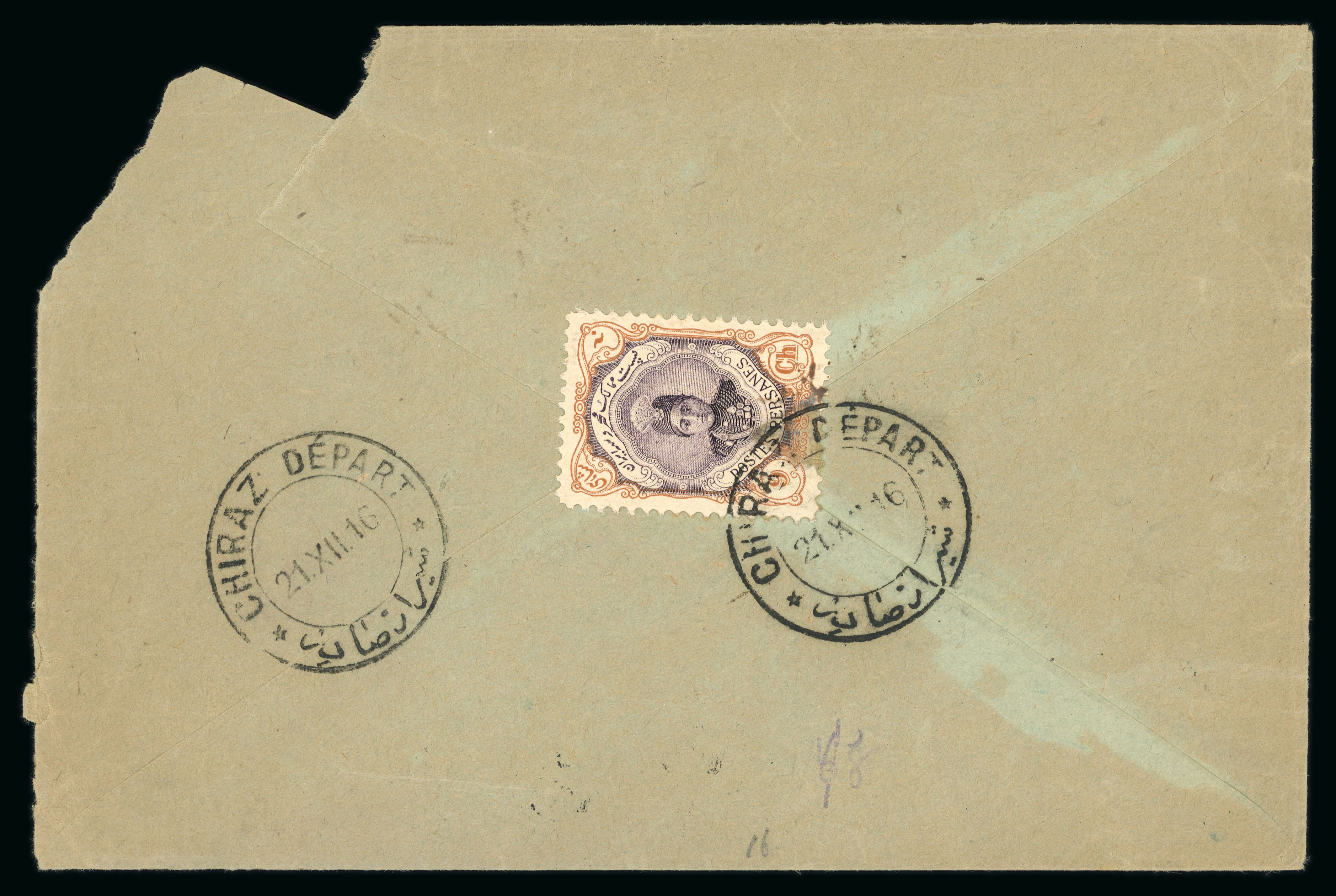 1916, letter from Shiraz to Bushire, franked on back with a single 1911 9 ch brown and purple, tied by Purple Chiraz (départ) 21 Dec. 1916. On front is Bouchir arrival postmark 3 Jan. 1817, along with 'Passed Censor Bushire' and purple