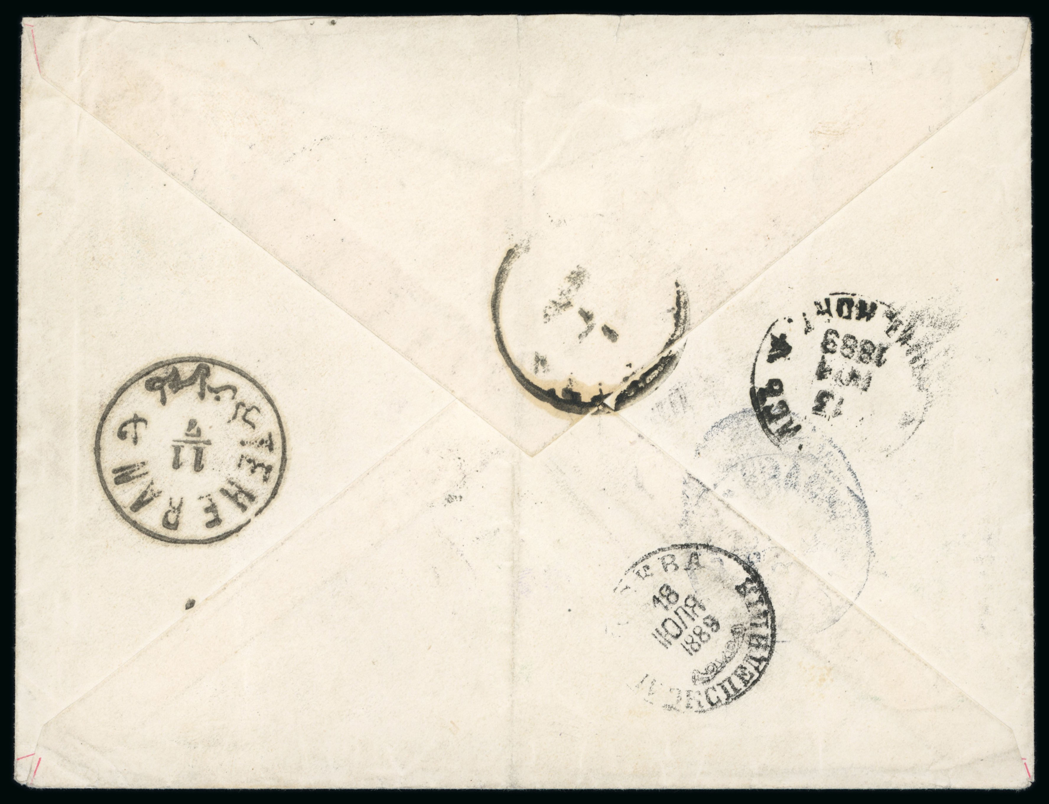 6ch Lion postal stationery envelope sent from Teheran to Germany, uprated on reverse with 1889 1ch pale rose 8wrinkled), both cancelled by ovoid ds, further uprated in transit at Tabriz with 1889 10c black, some foxing, fine and scarce.