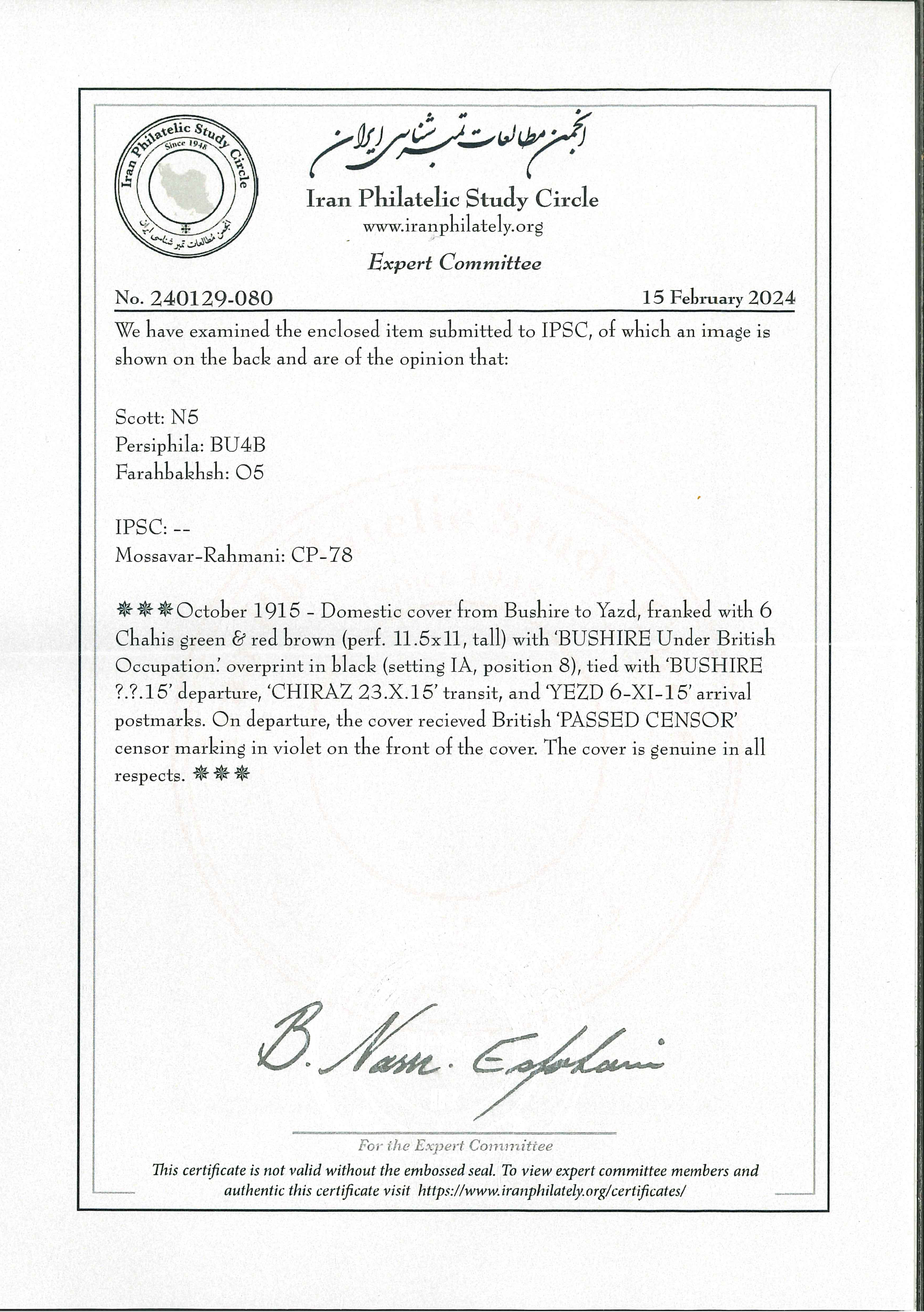 Chiraz transit (23.X.) and arrival cds (6.XI.), straight-line violet PASSED BY CENSOR on front. With IPSC Cert (2024), small ink mark on front not detracting from a rare cover. (Image 1)