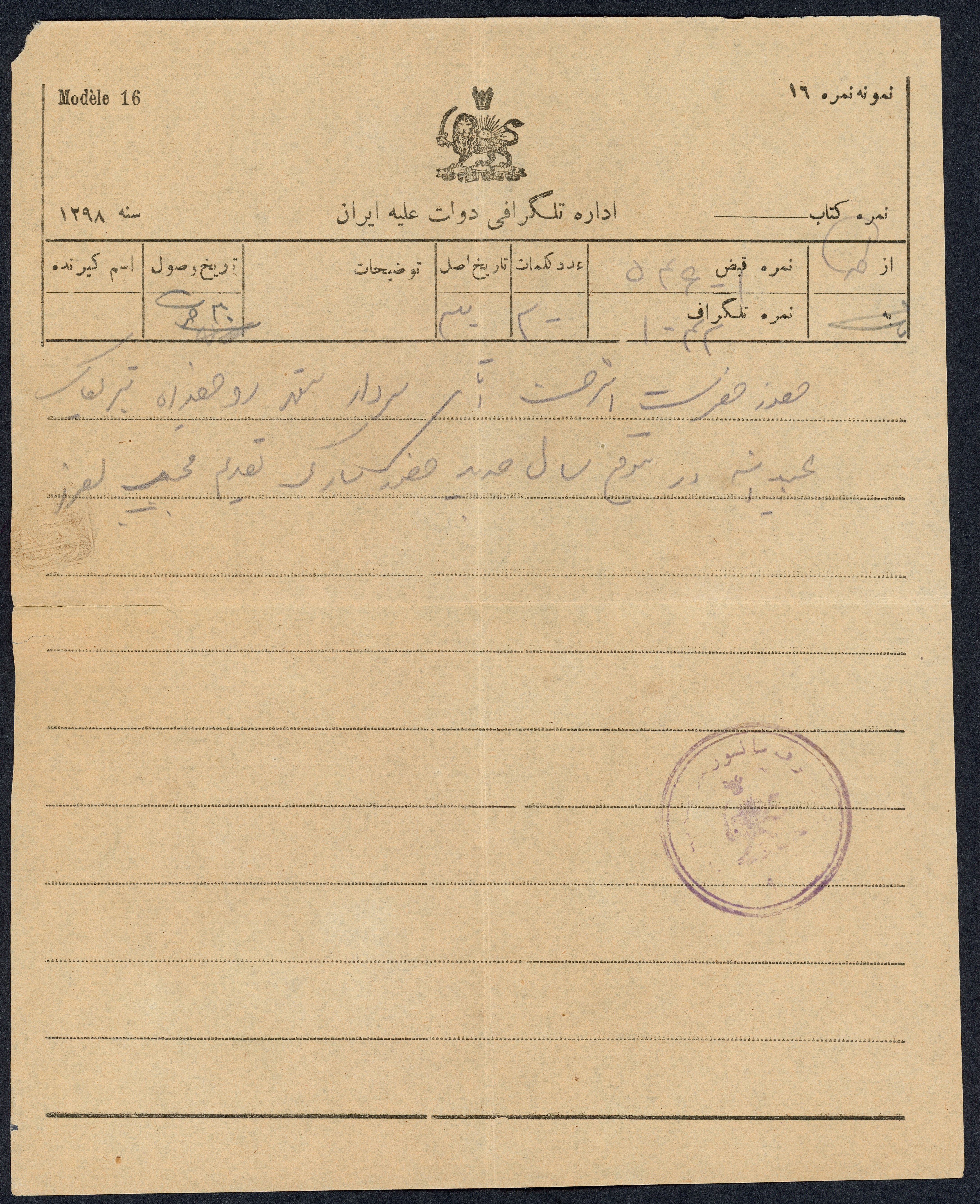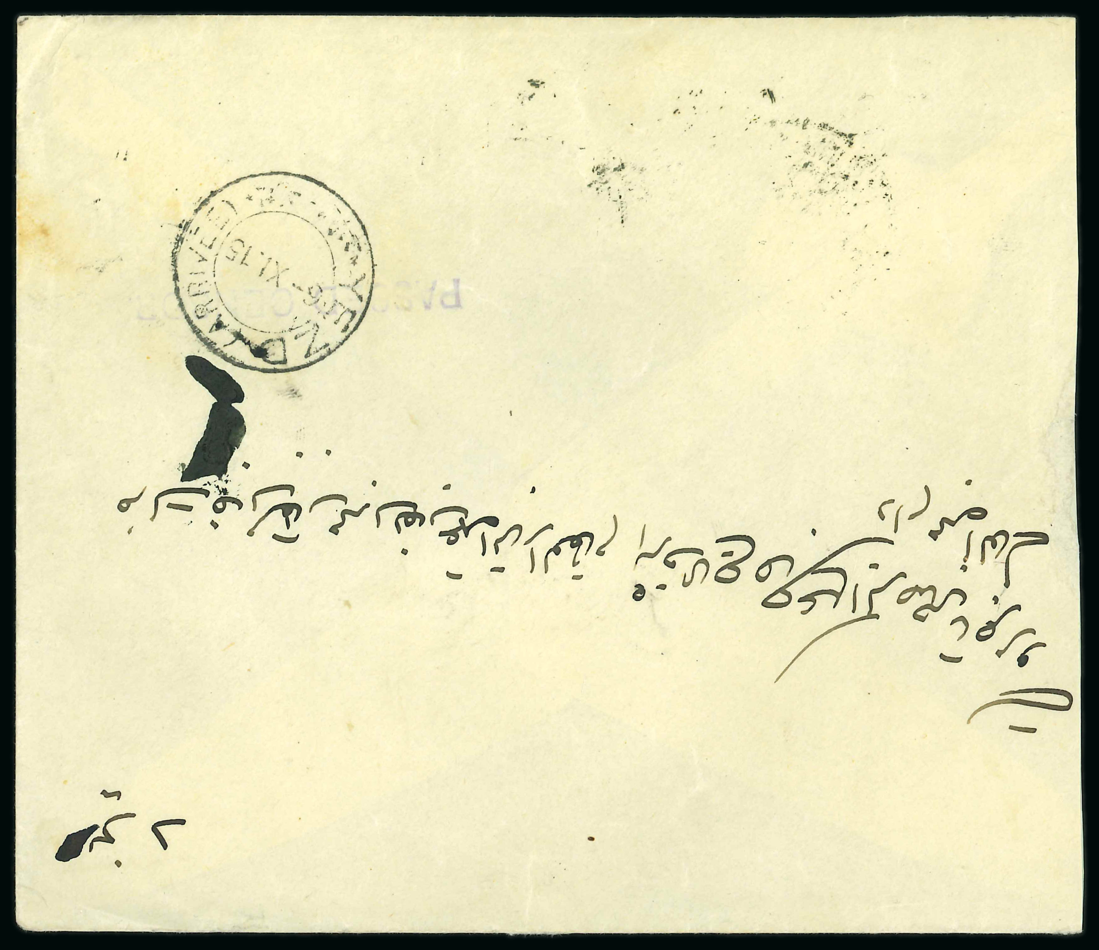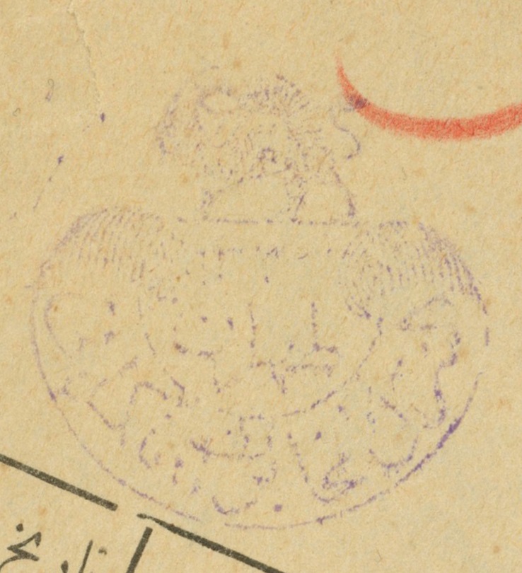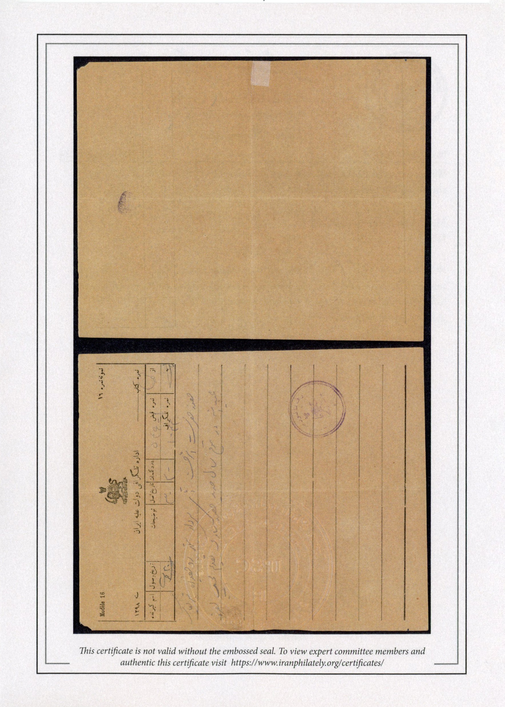 oval 'Dar Kazeroun Taftish Shod' (Inspected at Kazeroun). An important entire with the purple Kazeroun censor marking that was in use from December 1916 to January 1917. With some parts of upper right corner of envelope missing. (Image 1)