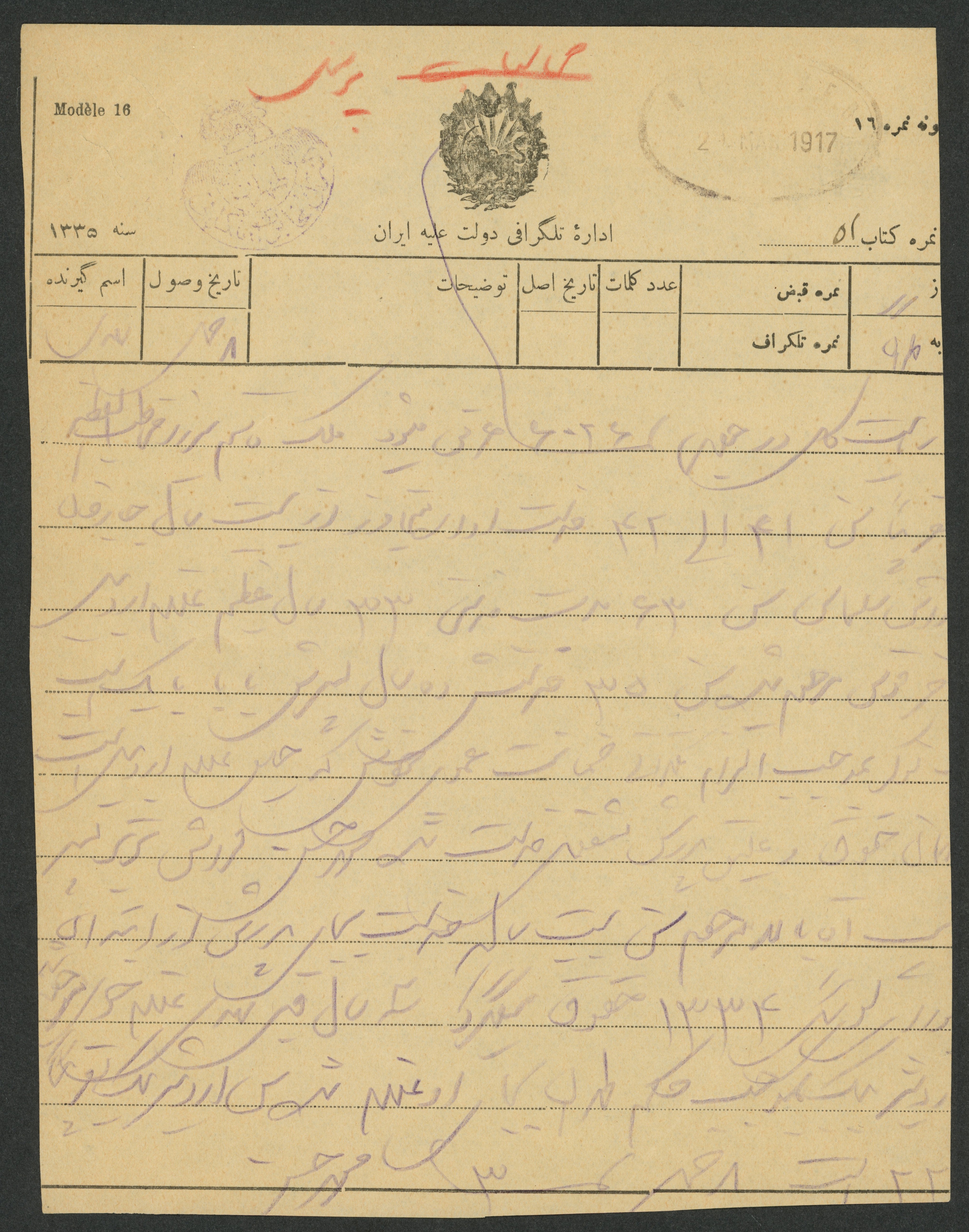 1917-20 group of four Telegrams all with rare censor marks, first from Rasht to Tehran with violet No. 553 octagonal PASSED BY CENSOR handstamp, second from Rasht to Tehran with rare horizontally framed PASSED BY CENSOR/ NORPERFORCE