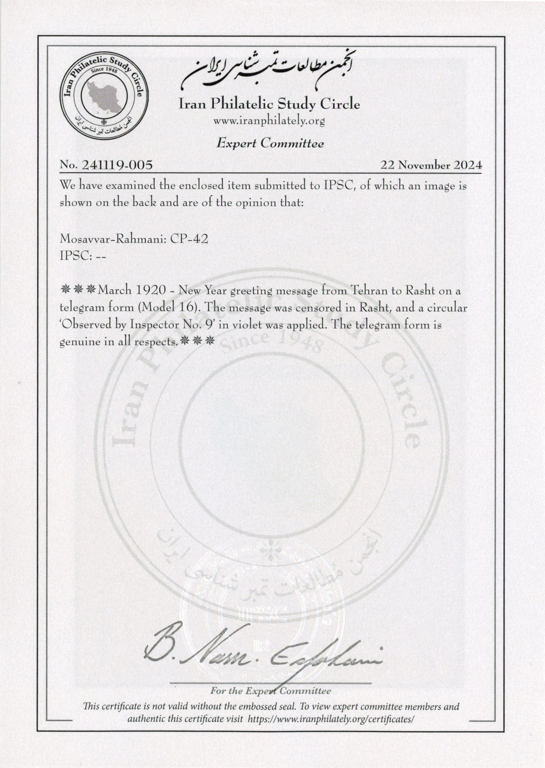 handstamp, third Teheran to Rasht with circular Observed By Inspector No. 9 censor in violet and finally Tabriz to Tehran with control Tehran Telecommunication 33 censor in violet. The last two come with IPSC Certs (2024) and three are of the highest