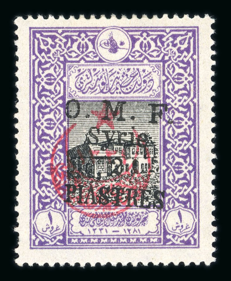 1918 Provisional issue for Aleppo, 1/2 piastre "DROIT DE TAXE PERCU ALEP" cancelled "HALEP 4.11.18". A major Syria rarity of superb quality. This provisional postage stamp was exclusively used in Aleppo. Only four examples are known