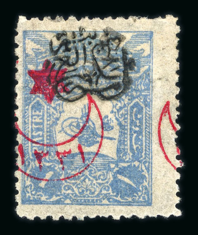 Royaume de Syrie/Syrian Arab Kingdom : fragment daté du cad d'Adana 28/01/1920 avec étonnant et peu commun affranchissement mixte, un timbre de Palestine, un timbre de Cilicie, une bande de trois timbres du Levant Français et timbre du