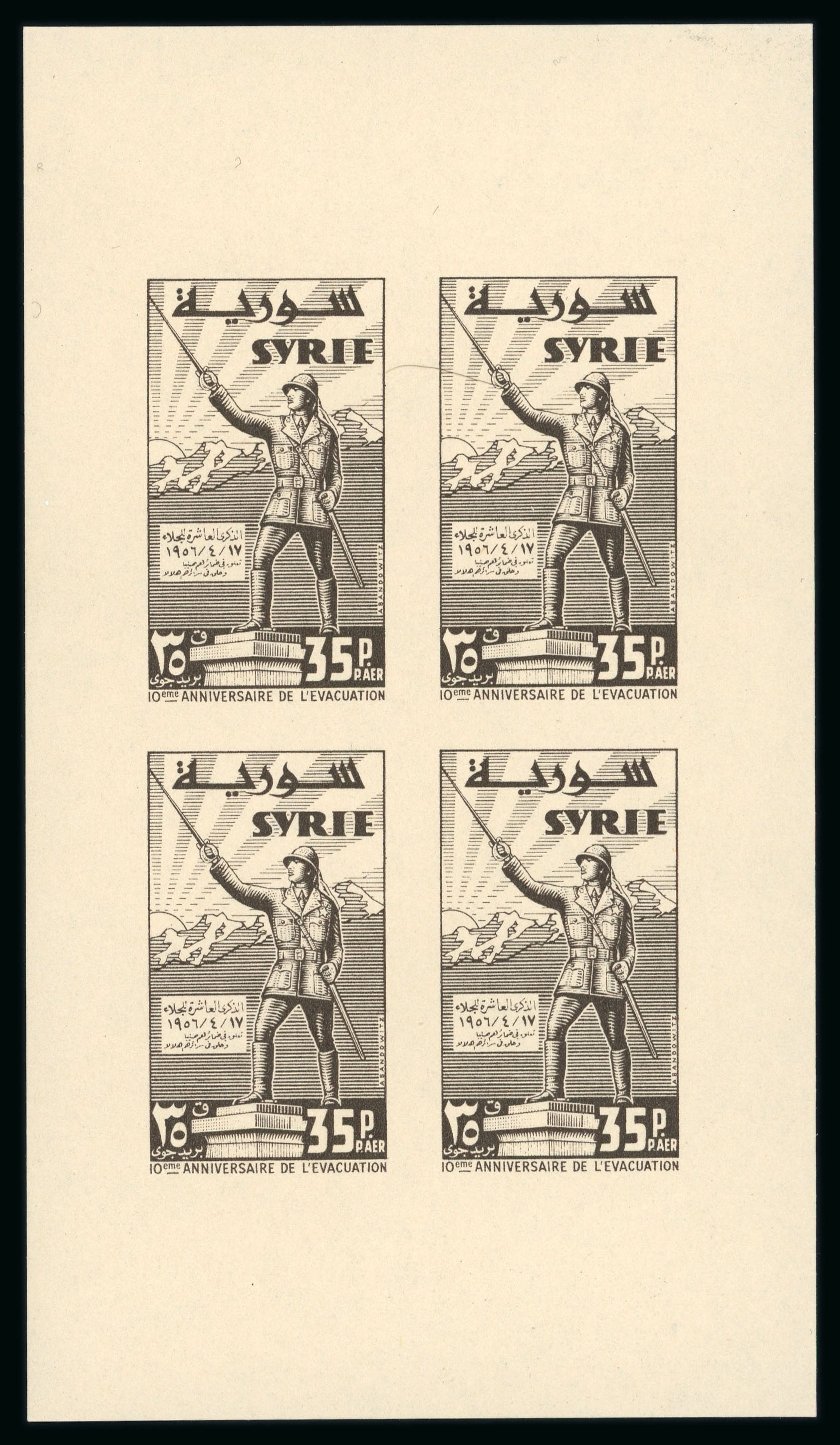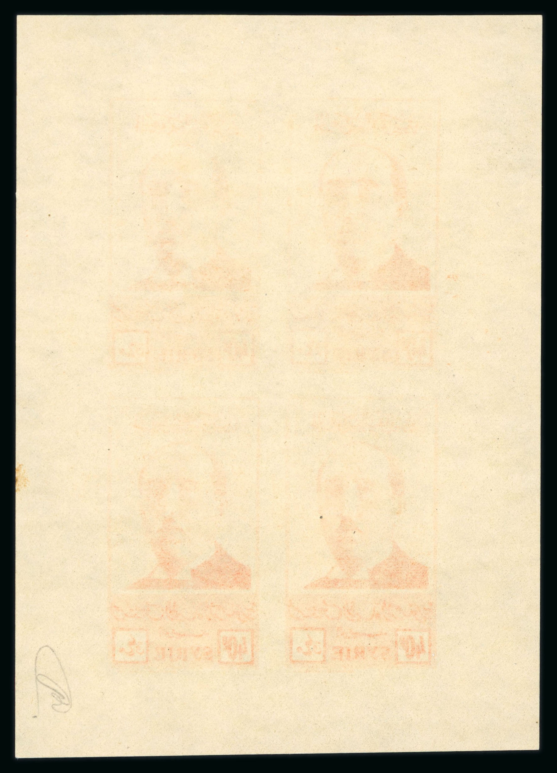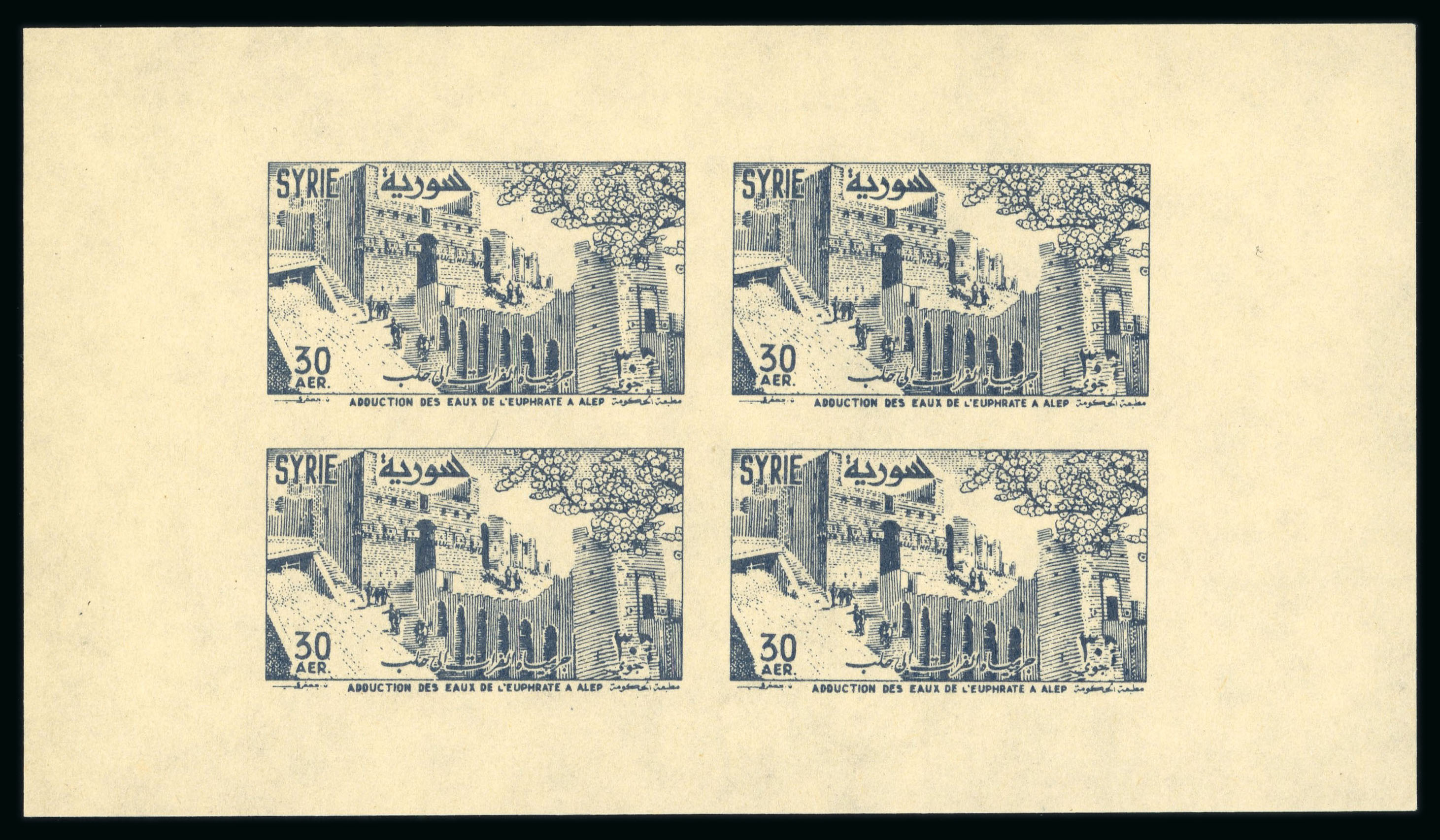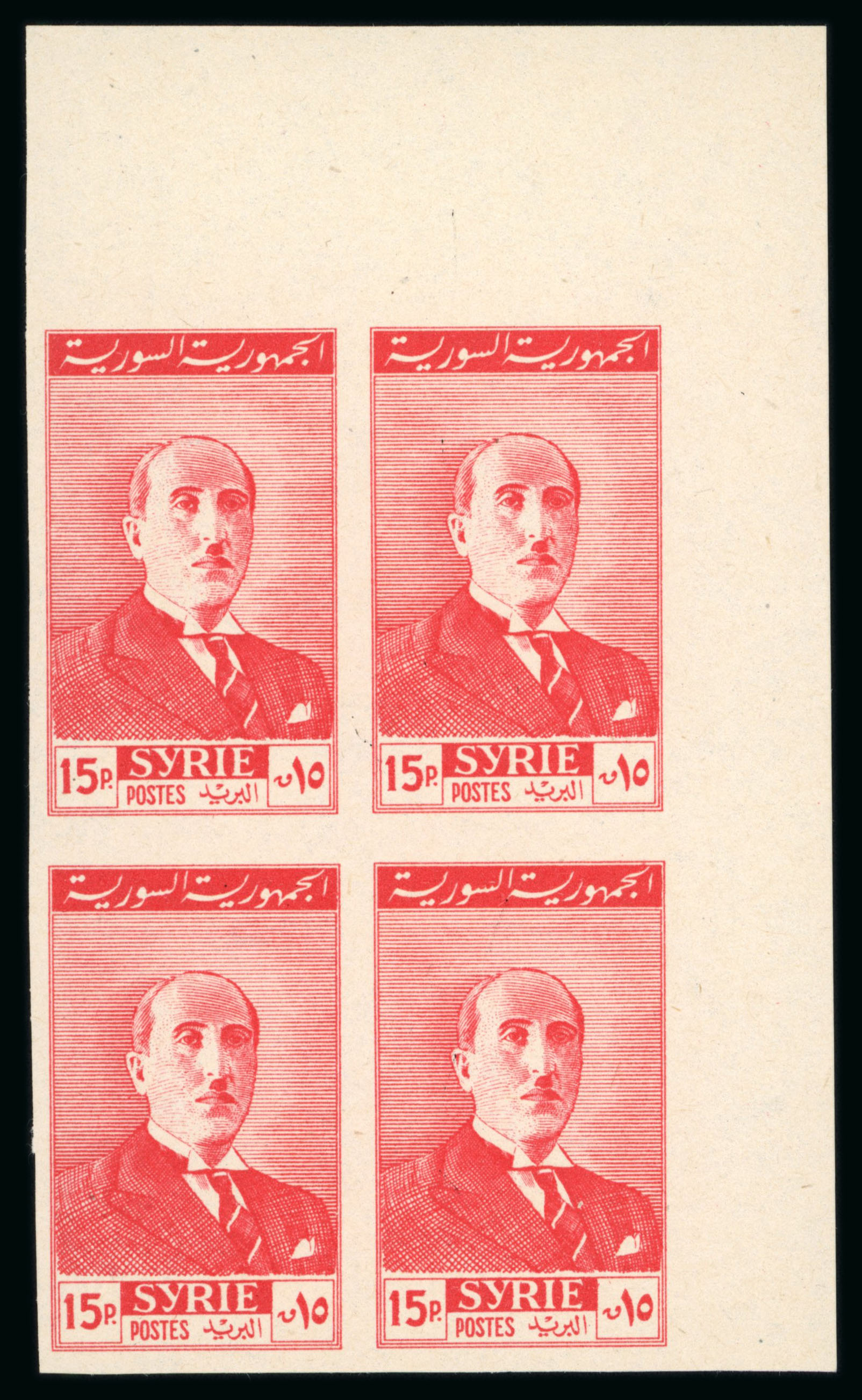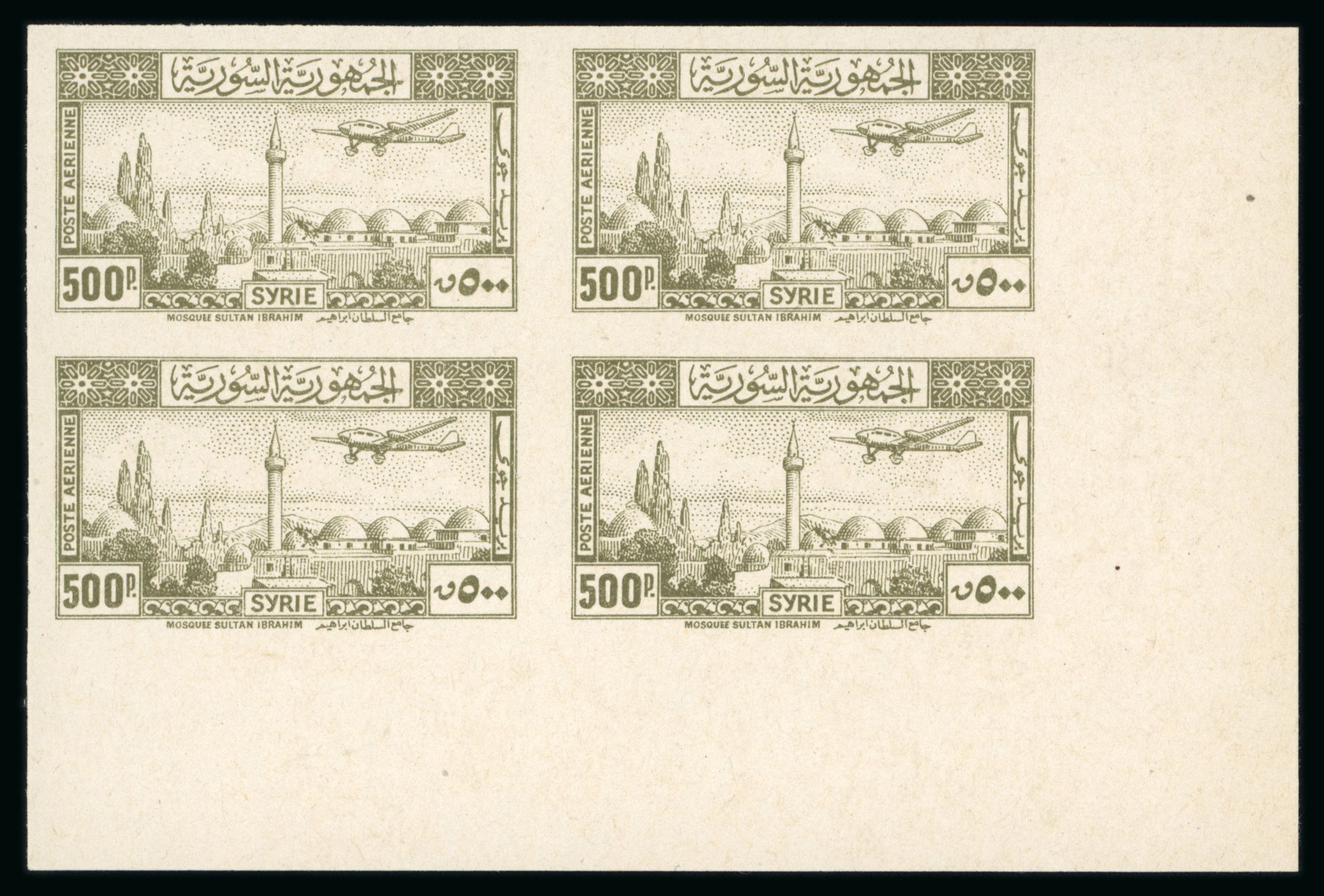 République Syrienne : 1946, premières émissions Y&T n° 1-9, n° 14-17 et PA n° 1-11 tous non dentelés en blocs de quatre coins de feuille, seulement 50 exemplaires connus, marque royale de la collection du roi Farouk d'Egypte au verso de