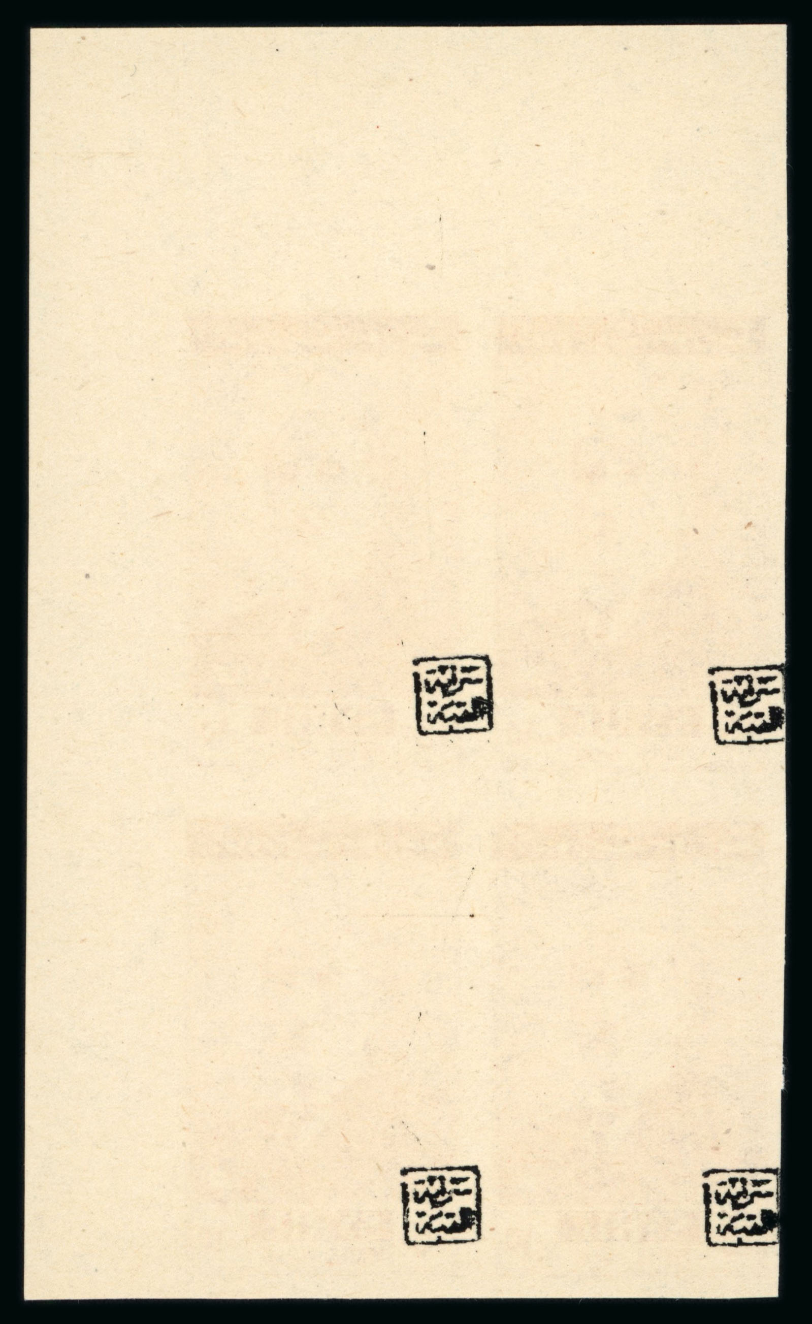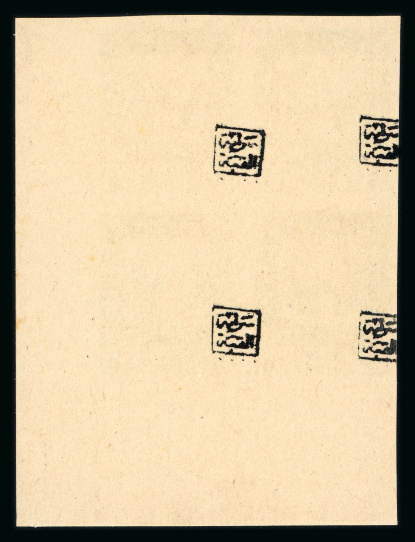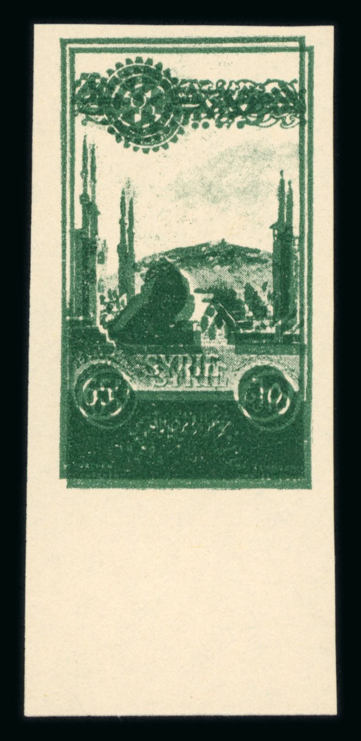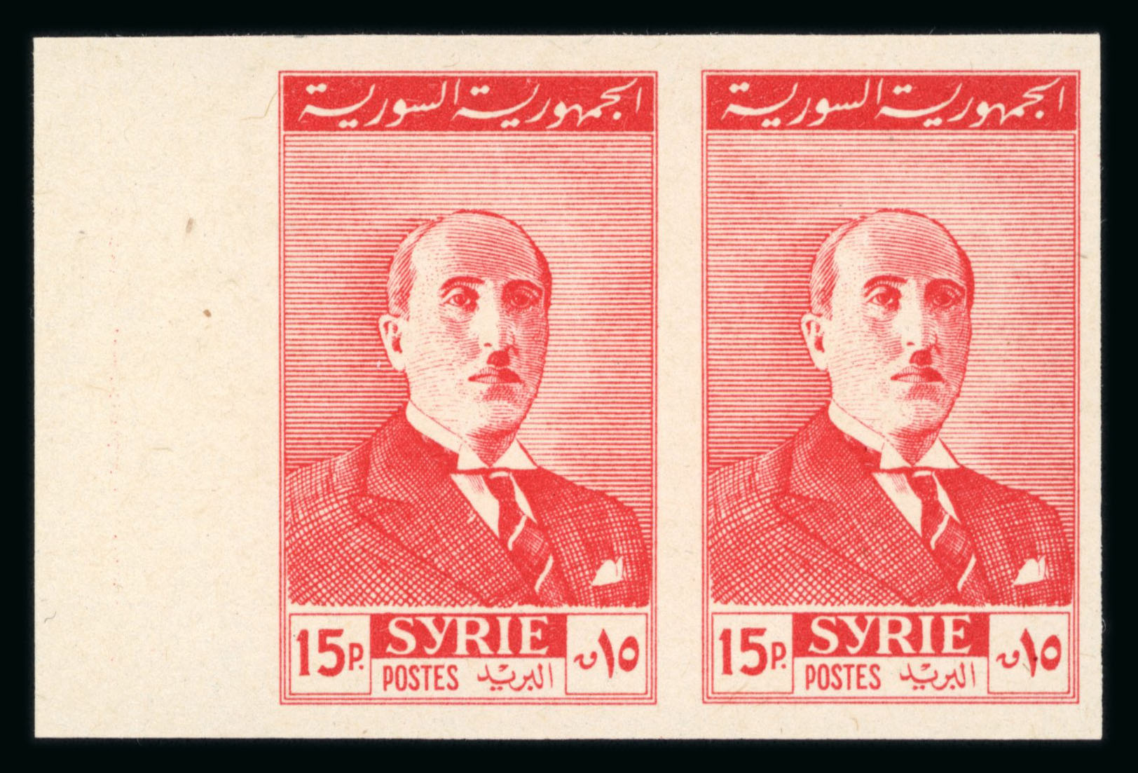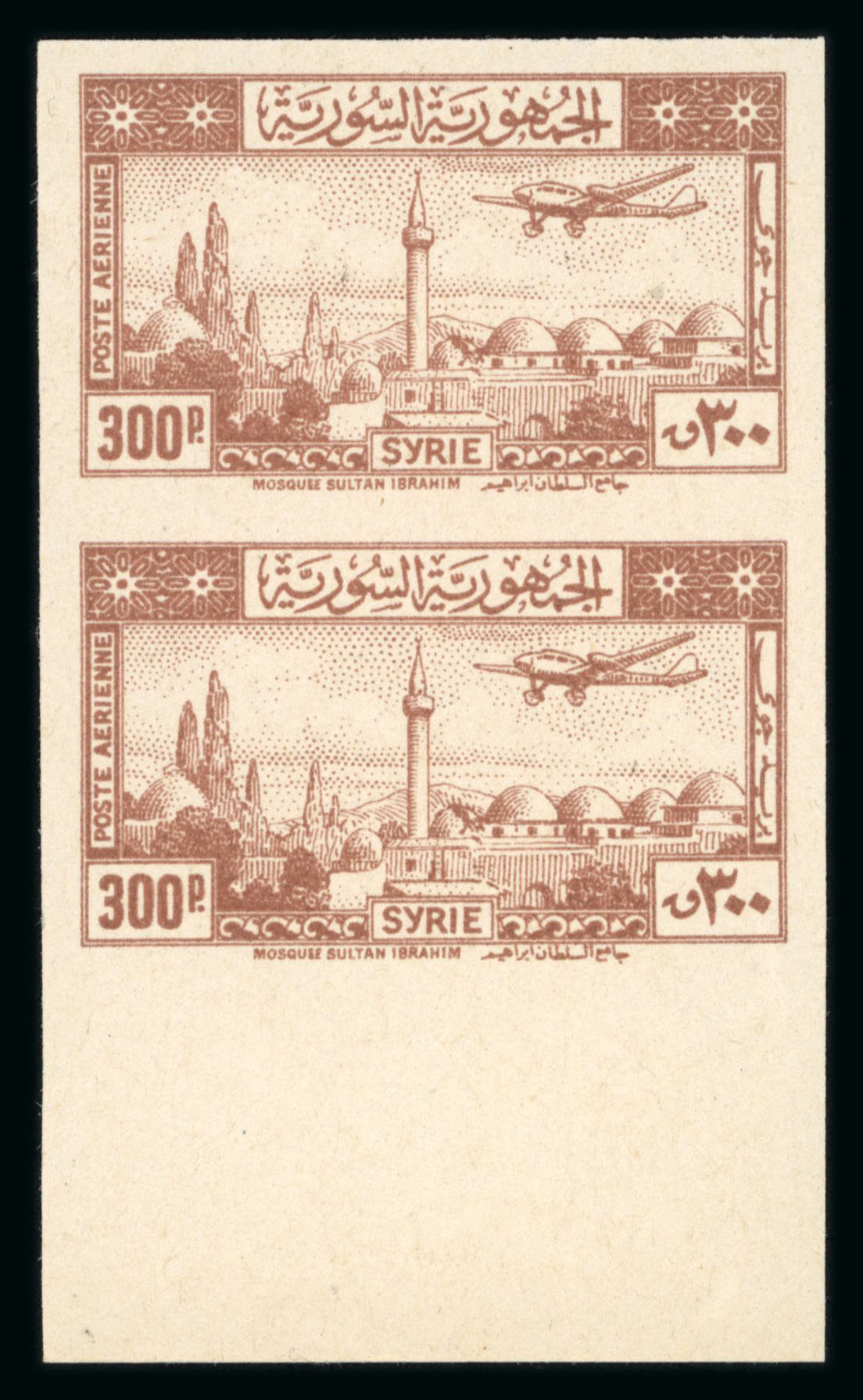 République Syrienne : 1946, premières émissions Y&T n° 1-9, n° 14-17 et PA n° 1-11 tous non dentelés en blocs de quatre coins de feuille, seulement 50 exemplaires connus, marque royale de la collection du roi Farouk d'Egypte au verso de